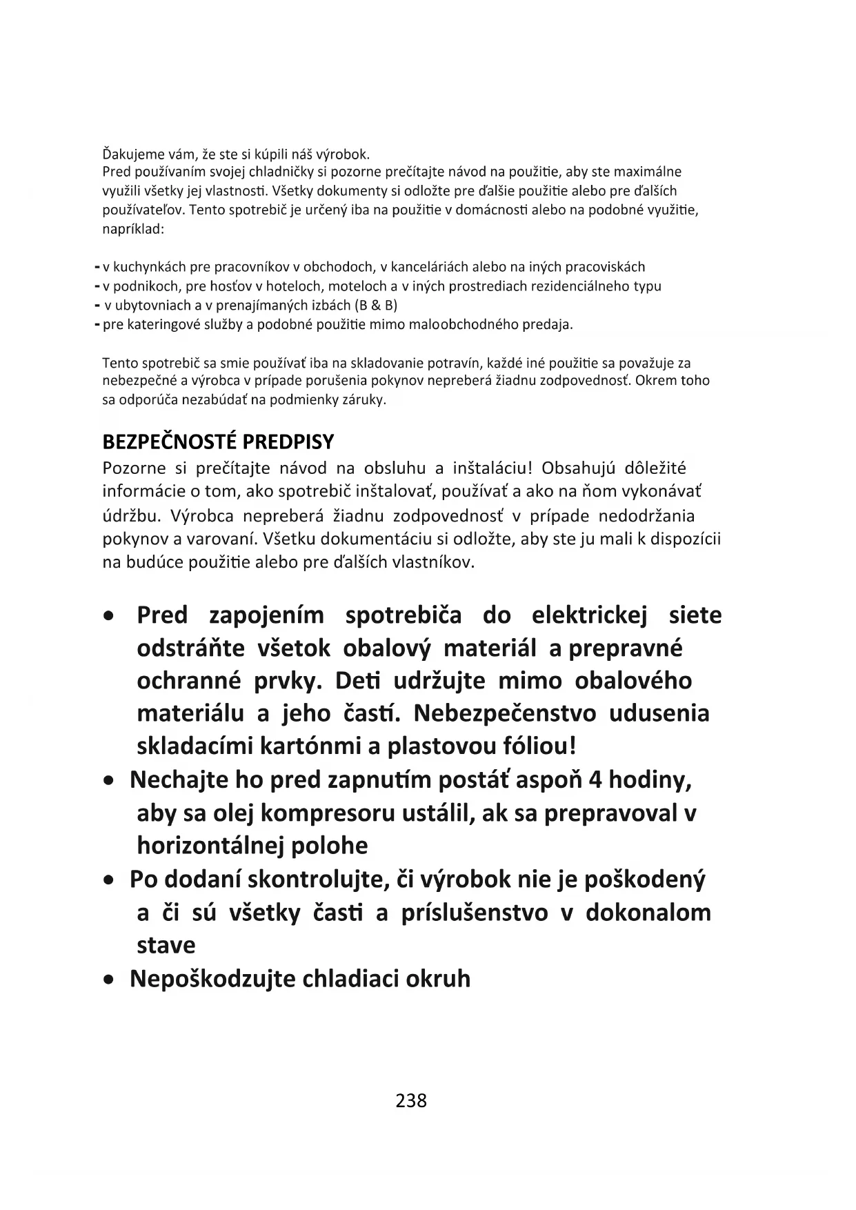 Pozorne si prečítajte návod na obsluhu a inštaláciu! Obsahujú dôležité informácie o tom, ako spotrebič inštalovať, používať a ako na ňom vykonávať údržbu. Výrobca nepreberá žiadnu zodpovednosť v prípade nedodržania pokynov a varovaní. Všetku dokumentáciu si odložte, aby ste ju mali k dispozícii na budúce použitie alebo pre ďalších vlastníkov. Pred zapojením spotrebiča do elektrickej siete odstráňte všetok obalový materiál a prepravné ochranné prvky. Deti udržujte mimo obalového materiálu a jeho častí. Nebezpečenstvo udusenia skladacími kartónmi a plastovou fóliou! Nechajte ho pred zapnutím postáť aspoň 4 hodiny, aby sa olej kompresoru ustálil, ak sa prepravoval v horizontálnej polohe Po dodaní skontrolujte, či výrobok nie je poškodený a či sú všetky časti a príslušenstvo v dokonalom stave Nepoškodzujte chladiaci okruh239 Vetracie otvory na kryte spotrebiča alebo na štruktúre zabudovania udržiavajte nezakryté, bez prekážok Miesto kompresora nikdy neumývajte vodou, po vyčistení ho dôkladne utrite suchou handričkou, aby sa predišlo hrdzaveniu Zariadenie musia prenášať minimálne dve osoby, pretože je ťažké. Zariadenie nainštalujte a vyrovnajte na mieste, ktoré je vhodné svojou veľkosťou a využitím. Uistite sa, že elektrické informácie na typovom štítku súhlasia s napájaním. Ak to tak nie je, kontaktujte elektrikára. Zariadenie je v prevádzke pri 220 – 240 VAC/50 Hz napájaní. Abnormálne kolísanie napätia môže spôsobiť, že sa prístroj nespustí, poškodí sa regulátor teploty alebo kompresor alebo sa môže pri prevádzke vyskytnúť neobvyklý hluk. V takom prípade musíte namontovať automatický regulátor. Len pre Veľkú Britániu: Napájací kábel zariadenia je vybavený 3-káblovou (uzemňovacou) zástrčkou, ktorá sa hodí do štandardnej 3-káblovej (uzemnenej) zásuvky. Tretí kolík (uzemnenie) nikdy neodrezávajte ani neodstraňujte. Po inštalácii spotrebiča musí byť zástrčka prístupná.240 Uistite sa, aby sa kábel napájania nezachytil počas a po presúvaní/prenášaní spotrebiča pod spotrebičom, aby sa zabránilo prerezaniu alebo poškodeniu kábla napájania. Ak došlo k poškodeniu napájacieho kábla, musí ho vymeniť výrobca, jeho servisný zástupca alebo podobne spôsobilá osoba, aby nedošlo k nebezpečenstvu Spotrebič neinštalujte vo vlhkom, mastnom ani prašnom prostredí a nevystavujte ho priamemu slnečnému svetlu ani vode Spotrebič neinštalujte v blízkosti ohrievačov ani horľavých materiálov PRE spotrebiče s mraziacim boxom: v prípade výpadku prúdu neotvárajte veko. Ak bude porucha pretrvávať kratšie, než je uvedené na typovom štítku (čas zvyšovania teploty), nemalo by to mať na zmrazené potraviny žiadny vplyv. V prípade dlhšieho výpadku treba potraviny skontrolovať a okamžite skonzumovať, prípadne tepelne upraviť a následne znova zmraziť. Ak sa vám zdá, že sa veko spotrebiča bezprostredne po zatvorení otvára veľmi sťažka, nie je to dôvod na obavu. Je to spôsobené rozdielom tlaku, ktorý sa po niekoľkých minútach vyrovná, takže sa veko bude dať znova normálne otvoriť. V zariadení neskladujte lieky, baktérie ani chemické látky. Toto zariadenie je domáci spotrebič.241 Neodporúčame vám, aby ste v ňom skladovali materiály, ktoré vyžadujú presné teploty. Elektrický napájací kábel príliš neťahajte a neohýbajte, ani sa ho nedotýkajte mokrými rukami V spotrebiči neskladujte produkty, ktoré obsahujú horľavé hnacie plyny (napr. spreje) alebo výbušné látky. Nebezpečenstvo výbuchu! Na chladničku neumiestňujte nestabilné predmety (ťažké predmety, nádoby naplnené vodou), aby nedošlo k zraneniu osôb následkom pádu alebo úrazu elektrickým prúdom po kontakte s vodou. Vnútri oddelenia na skladovanie potravín v spotrebiči nepoužívajte elektrické spotrebiče, s výnimkou typov spotrebičov povolených zo strany výrobcu Nedotýkajte sa vnútorných prvkov chladenia, najmä mokrými rukami, aby sa predišlo prasknutiu alebo zraneniu Ohrozené sú deti, osoby so zníženými fyzickými, mentálnymi alebo duševnými schopnosťami, ako aj osoby, ktoré nemajú dostatočné znalosti o bezpečnej prevádzke spotrebiča. Uistite sa, že deti a zraniteľné osoby chápu nebezpečenstvá. Osoba zodpovedná za bezpečnosť musí dohliadať alebo inštruovať deti a zraniteľné osoby, ktoré používajú spotrebič. Spotrebič môžu používať iba deti staršie ako 8 rokov.242 Deti sa nesmú hrať so spotrebičom Deti vo veku od 3 do 8 rokov môžu vkladať a vykladať predmety zo spotrebiča PRE spotrebiče s mraziacim boxom: v mraziacom boxe neskladujte kvapaliny vo fľašiach alebo plechovkách (najmä sýtené nápoje). Fľaše a plechovky môže roztrhnúť! PRE spotrebiče s mraziacim boxom: mrazené potraviny vybrané priamo z mraziaceho boxu si nikdy nedávajte do úst. Nebezpečenstvo omrzlín! Plastové diely a tesnenie dverí udržujte bez oleja a mastnoty. V opačnom prípade budú plastové časti a tesnenie dverí priepustné. Pred vykonaním akéhokoľvek úkonu vytiahnite elektrickú zástrčku z elektrickej zásuvky Na urýchlenie odmrazovania spotrebiča nepoužívajte mechanické nástroje ani iné prostriedky, pokiaľ ich neodporučil výrobca Na odstraňovanie námrazy nepoužívajte špicaté alebo ostré predmety, ako sú nože alebo vidličky. Na odmrazovanie nikdy nepoužívajte fény, elektrické ohrievače alebo iné podobné elektrické spotrebiče Odporúča sa udržiavať zástrčku kábla čistú. Zvyšky prachu na zástrčke by mohli spôsobiť požiar243 Zariadenie sa nepokúšajte sami opravovať, rozoberať alebo upravovať. V prípade opravy vždy kontaktujte náš zákaznícky servis. Počas čistenia alebo údržby spotrebiča dohliadajte na deti. Studené sklenené poličky nečistite horúcou vodou. 