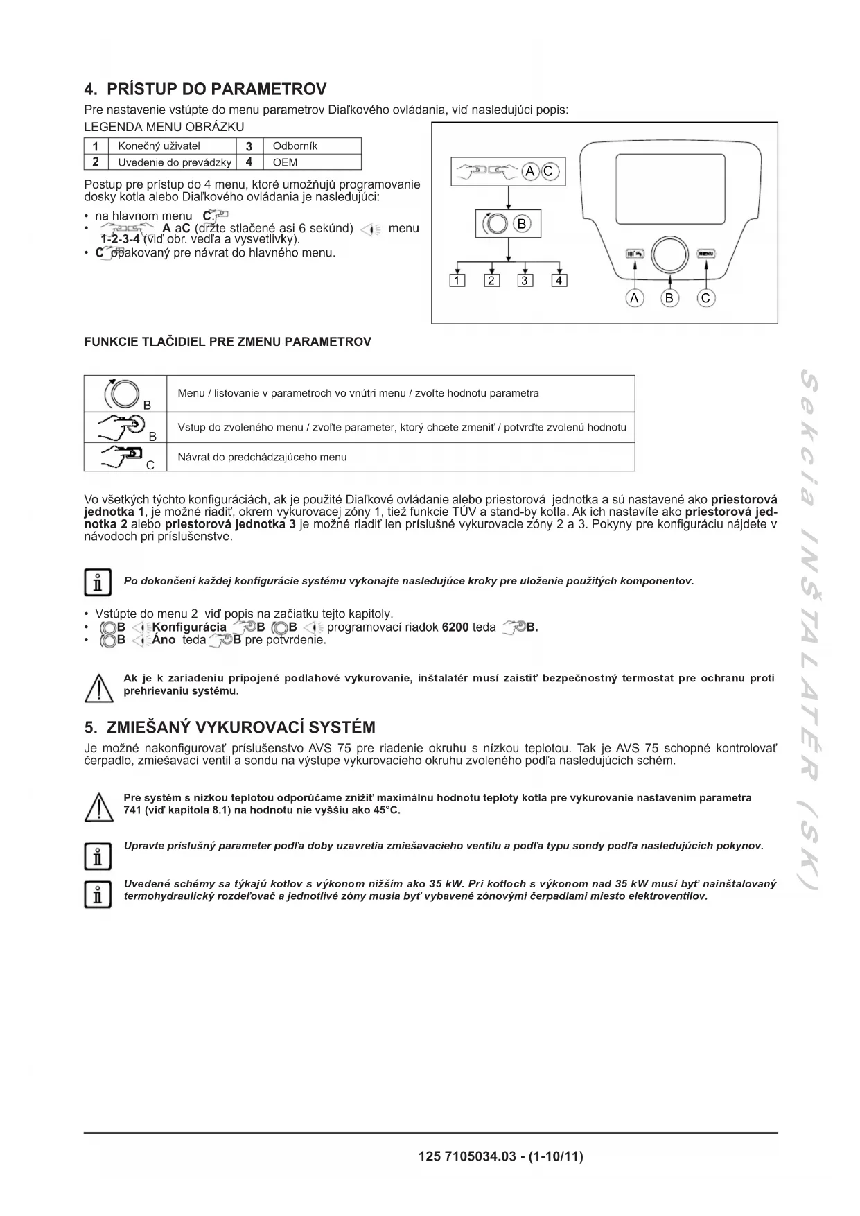 Pomocou ovládacieho panelu vstúpte do menu 2, viď popis v kapitole 4, a vykonajte nasledujúce nastavenia: MENU PROGRAMOVACÍ RIADOKHODNOTA PRE NASTAVENIAPOPISKONFIGURÁCIA5715 ZAP Aktivovanie vykurovacieho okruhu 25977 Izbový termostat VO2 Aktivovanie termostatu pre okruh 2 (kontakt 1-2 svorkovnice M1)6020 Vykurovací okruh 1 Aktivovanie zóny s nízkou teplotou6024 Sledovač teploty VO Vstup EX21 aktívny ako ochrana zóny s nízkou teplotou6046 Blokovanie zdroja tepla Vstup H2 aktívny ako priestorový termostat zóny s nízkou teplotouVYKUROVACÍ OKRUH 1 742 --- Aktivovanie modulovanej teploty nábehu (zóna s nízkou teplotou) 834 Štandardne 180 s Doba uzatvorenia zmiešavacieho ventila Priestorová jednotka je schopná priamo kontrolovať zónu s nízkou teplotou podľa požadovanej teploty v miestnosti.Ak sa na di- spleji pri otočení ovládačom B zobrazí teplota na výstupe kotla miesto teploty v miestnosti, znamená to, že parameter 742 nebol nastavený správne.127 7105034.03 - (1-10/11) S e k c i a I N Š TA L AT É R ( S K )