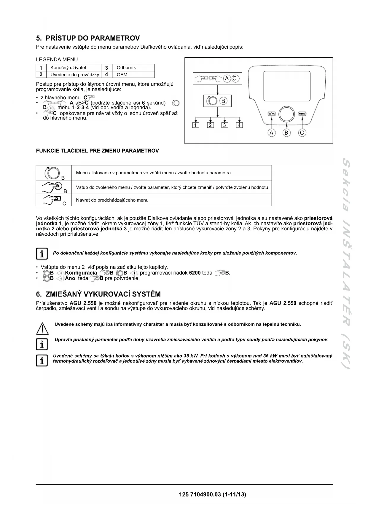 Pomocou Ovládacieho panelu vstúpte do menu 2, viď popis v kapitole 5, a vykonajte nasledujúce nastavenia: MENU PROGRAMOVACÍ RIADOKPARAMETERHODNOTA PRE NASTAVENIAPOPISKONFIGURÁCIA5715 Vykurovací okruh 2 ZAP Aktivovanie okruhu vykurovania 25977 Funkcia vstupu H5Izbový termostat VO2 Aktivovanie termostatu pre okruh 2(svorkovnica kotla M1 (1-2))6020 Funkcia rozširujúci modul 1Vykurovací okruh Aktivovanie zóny s nízkou teplotou6046 Funkcia vstupu H2 modulu 1Izbový termostat VO1 Vstup H2 aktívny ako priestorový termostat zóny s nízkou teplotouVYKUROVACÍ OKRUH 1710 Komfortná teplota 35°CHodnota vo vykurovanej miestnosti (zóny s nízkou teplotou)VYKUROVACÍ OKRUH 1 834 Doba chodu pohonu Štandardne 180 s Doba chodu zmiešavacieho ventilu Nastavením teploty komfort na maximálnu hodnotu (35°C) je zaručená správna prevádzka zón s nízkou teplotou. Priestorová jednotka tak nezablokuje požiadavku na teplo od jednotlivých priestorových termostatov, ktoré riadi podzóny. V tomto prípade má priestorová jednotka funkciu riadenia systému s nízkou teplotou, ale nemôže byť použitá pre riadenie teploty v jednej z miestností. Otočením ovládača B sa na displeji zobrazí teplota na výstupe z kotla. Vykurovací okruh funguje so stabilným výstupom. Zapojte bezpečnostný termostat zóny s nízkou teplotou.7104900.03 (1-11/13) 128 Sekcia INŠTALATÉR (SK)