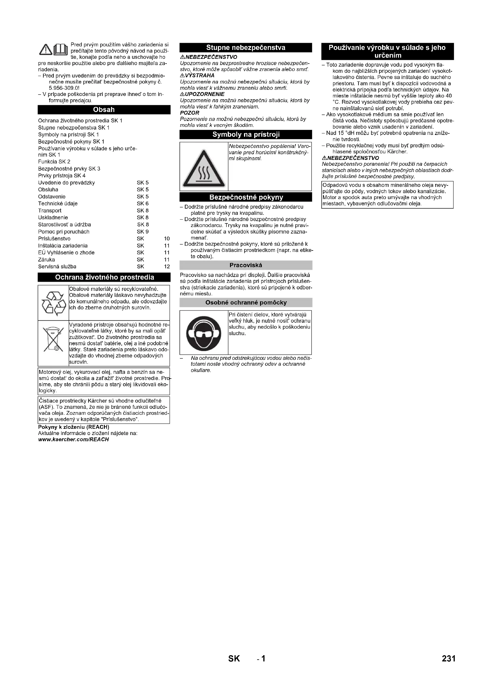 Alimentarea cu apă Valoare pH 6,5...9,5Conductivitate electrică < 2000 µS/cmMateriale decantabile < 0,5 mg/l *Materiale filtrabile (dimensiunea particulelor sub 0,025 mm)< 20 mg/lHidrocarburi < 20 mg/lClorură < 300 mg/lCalciu < 85 mg/l **Duritate totală < 15 °dH **Fier < 0,5 mg/lMangan < 0,05 mg/lCupru < 0,02 mg/lsă nu aibă miros neplăcut Racordul electric Declaraţie UE de conformitate Produs: Aparat de curăţare sub presiuneTip: 2.509-xxxDirective UE respectate:2006/42/CE (+2009/127/CE)2009/125/CE2011/65/UE2014/30/UENorme armonizate utilizate:EN IEC 63000: 2018EN 55014–1: 2017 + A11: 2020EN 55014–2: 2015EN 60335–1EN 60335–2–79EN 61000–3–2: 2014EN 61000–3–3: 2013EN 61000–3–12: 2011EN 61000–6–2: 2005EN 61000–6–4: 2007EN 62233: 2008Regulamente aplicabile(UE) 2019/1781 Garanţie Chairman of the Board of ManagementDirector Regulatory Affairs & Certification 229RO- 12 Service autorizat Tipul instalaţiei: Nr. de fabricaţie: Pus în funcţiune la data de: Inspecţie efectuată în: Constatare: Semnătura Inspecţie efectuată în: Constatare: Semnătura Inspecţie efectuată în: Constatare: Semnătura Inspecţie efectuată în: Constatare: Semnătura 230 RO- 1 Pred prvým použitím vášho zariadenia si prečítajte tento pôvodný návod na použi- tie, konajte podľa neho a uschovajte ho pre neskoršie použitie alebo pre ďalšieho majiteľa za- riadenia. – Pred prvým uvedením do prevádzky si bezpodmie- nečne musíte prečítat' bezpečnostné pokyny č. 5.956-309.0! – V prípade poškodenia pri preprave ihneď o tom in- formujte predajcu. Pokyny k zloženiu (REACH) Aktuálne informácie o zložení nájdete na: www.kaercher.com/REACH NEBEZPEČENSTVO Upozornenie na bezprostredne hroziace nebezpečen- stvo, ktoré môže spôsobiť vážne zranenia alebo smrť. 몇 VÝSTRAHA Upozornenie na možnú nebezpečnú situáciu, ktorá by mohla viesť k vážnemu zraneniu alebo smrti. 몇 UPOZORNENIE Upozornenie na možnú nebezpečnú situáciu, ktorá by mohla viesť k ľahkým zraneniam. POZOR Pozornenie na možnú nebezpečnú situáciu, ktorá by mohla viesť k vecným škodám. – Dodržte príslušné národné predpisy zákonodarcu platné pre trysky na kvapalinu. – Dodržte príslušné národné bezpečnostné predpisy zákonodarcu. Trysky na kvapalinu je nutné pravi- delne skúšať a výsledok skúšky písomne zazna- menať. – Dodržte bezpečnostné pokyny, ktoré sú priložené k používaným čistiacim prostriedkom (napr. na etike- te obalu). Pracovisko sa nachádza pri displeji. Ďalšie pracoviská sú podľa inštalácie zariadenia pri prístrojoch príslušen- stva (striekacie zariadenia), ktoré sú pripojené k odber- nému miestu. – Na ochranu pred odstrekujúcou vodou alebo nečis- totami noste vhodný ochranný odev a ochranné okuliare. – Toto zariadenie dopravuje vodu pod vysokým tla- kom do najbližších pripojených zariadení vysokot- lakového čistenia. Pevne sa inštaluje do suchého priestoru. Tam musí byť k dispozícii vodovodná a elektrická prípojka podľa technických údajov. Na mieste inštalácie nesmú byť vyššie teploty ako 40 °C. Rozvod vysokotlakovej vody prebieha cez pev- ne nainštalovanú sieť potrubí. – Ako vysokotlakové médium sa smie používať len čistá voda. Nečistoty spôsobujú predčasné opotre- bovanie alebo vznik usadenín v zariadení. – Nad 15 °dH môžu byť potrebné opatrenia na zníže- nie tvrdosti. – Použitie recyklačnej vody musí byť predtým odsú- hlasené spoločnosťou Kärcher. NEBEZPEČENSTVO Nebezpečenstvo poranenia! Pri použití na čerpacích staniciach alebo v iných nebezpečných oblastiach dodr- žujte príslušné bezpe čnostné predpisy. Obsah Ochrana životného prostredia SK 1 Stupne nebezpečenstva SK 1 Symboly na prístroji SK 1 Bezpečnostné pokyny SK 1 Používanie výrobku v súlade s jeho urče- ním SK 1 Funkcia SK 2 Bezpečnostné prvky SK 3 Prvky prístroja SK 4 Uvedenie do prevádzky SK 5 Obsluha SK 5 Odstavenie SK 5 Technické údaje SK 6 Transport SK 8 Uskladnenie SK 8 Starostlivosť a údržba SK 8 Pomoc pri poruchách SK 9 Príslušenstvo SK 10 Inštalácia zariadenia SK 11 EÚ Vyhlásenie o zhode SK 11 Záruka SK 11 Servisná služba SK 12 Ochrana životného prostredia Obalové materiály sú recyklovateľné. Obalové materiály láskavo nevyhadzujte do komunálneho odpadu, ale odovzdajte ich do zberne druhotných surovín. Vyradené prístroje obsahujú hodnotné re- cyklovateľné látky, ktoré by sa mali opät' zužitkovat'. Do životného prostredia sa nesmú dostat' batérie, olej a iné podobné látky. Staré zariadenia preto láskavo odo- vzdajte do vhodnej zberne odpadových surovín. Motorový olej, vykurovací olej, nafta a benzín sa ne- smú dostat' do okolia a zat'ažit' životné prostredie. Pro- síme, aby ste chránili pôdu a starý olej likvidovali eko- logicky. Čistiace prostriedky Kärcher sú vhodne odlučiteľné (ASF). To znamená, že nie je bránené funkcii odlučo- vača oleja. Zoznam odporúčaných čistiacich prostried- kov je uvedený v kapitole "Príslušenstvo". Stupne nebezpečenstva Symboly na prístroji Nebezpečenstvo popálenia! Varo- vanie pred horúcimi konštrukčný- mi skupinami. Bezpečnostné pokyny Pracoviská Osobné ochranné pomôcky Pri čistení dielov, ktoré vytvárajú veľký hluk, je nutné nosit' ochranu sluchu, aby nedošlo k poškodeniu sluchu. Používanie výrobku v súlade s jeho určením Odpadovú vodu s obsahom minerálneho oleja nevy- púšt'ajte do pôdy, vodných tokov alebo kanalizácie. Motor a spodok auta preto umývajte na vhodných miestach, vybavených odlučovačmi oleja. 231SK- 2 1 Zachytávač nečistôt (dodáva zákazník)2 Snímač teploty3 Poistka pri nedostatku vody4 Nádrž s plavákom5 Predtlakové čerpadlo(Prídavná možnosť)6 Čerpadlo s kľukovým hriadeľom7 Poistný ventil8 Elektromotor9 Spätný ventil10 Vysok