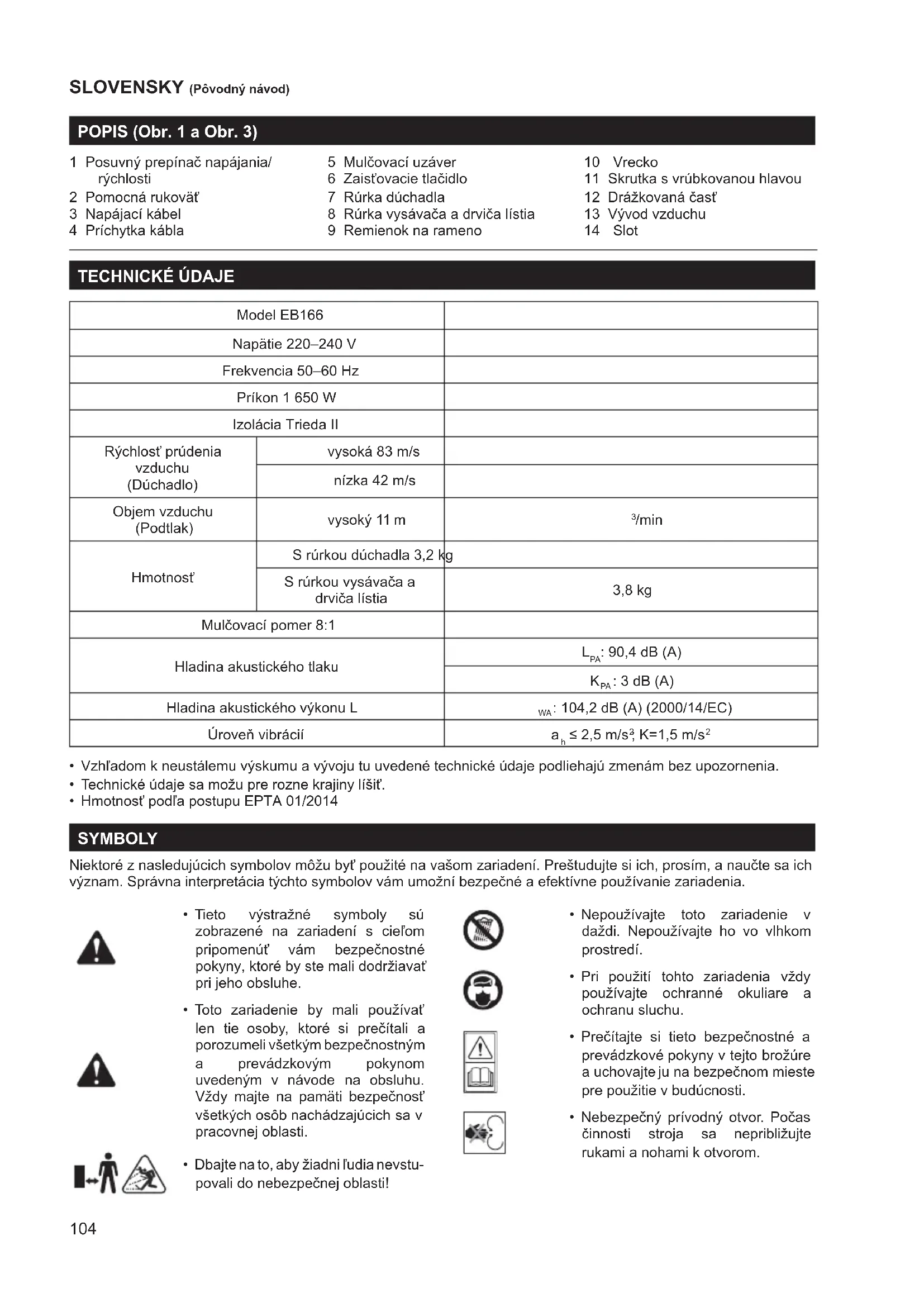 - Toto zariadenie je určené na dúchanie alebo nasávanie a drvenie lístia a vetvičiek. Nikdy nepoužívajte toto zariadenie inak ako na určené použitie, ako napríklad na nafukovanie balónov.