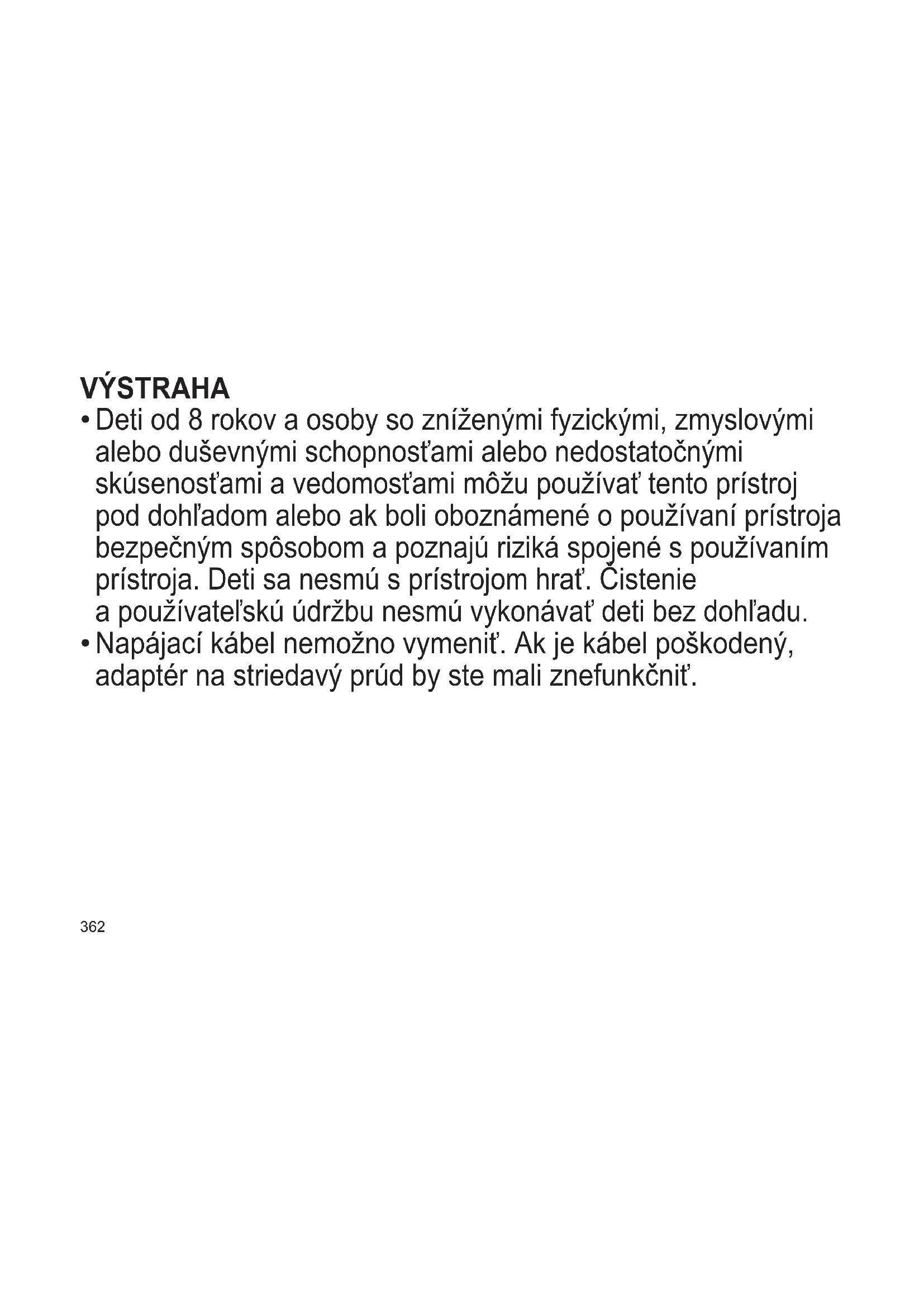 Deti od 8 rokov a osoby so zníženými fyzickými, zmyslovými alebo duševnými schopnosťami alebo nedostatočnými skúsenosťami a vedomosťami môžu používať tento prístroj pod dohľadom alebo ak boli oboznámené o používaní prístroja bezpečným spôsobom a poznajú riziká spojené s používaním prístroja. Deti sa nesmú s prístrojom hrať. Čistenie a používateľskú údržbu nesmú vykonávať deti bez dohľadu.