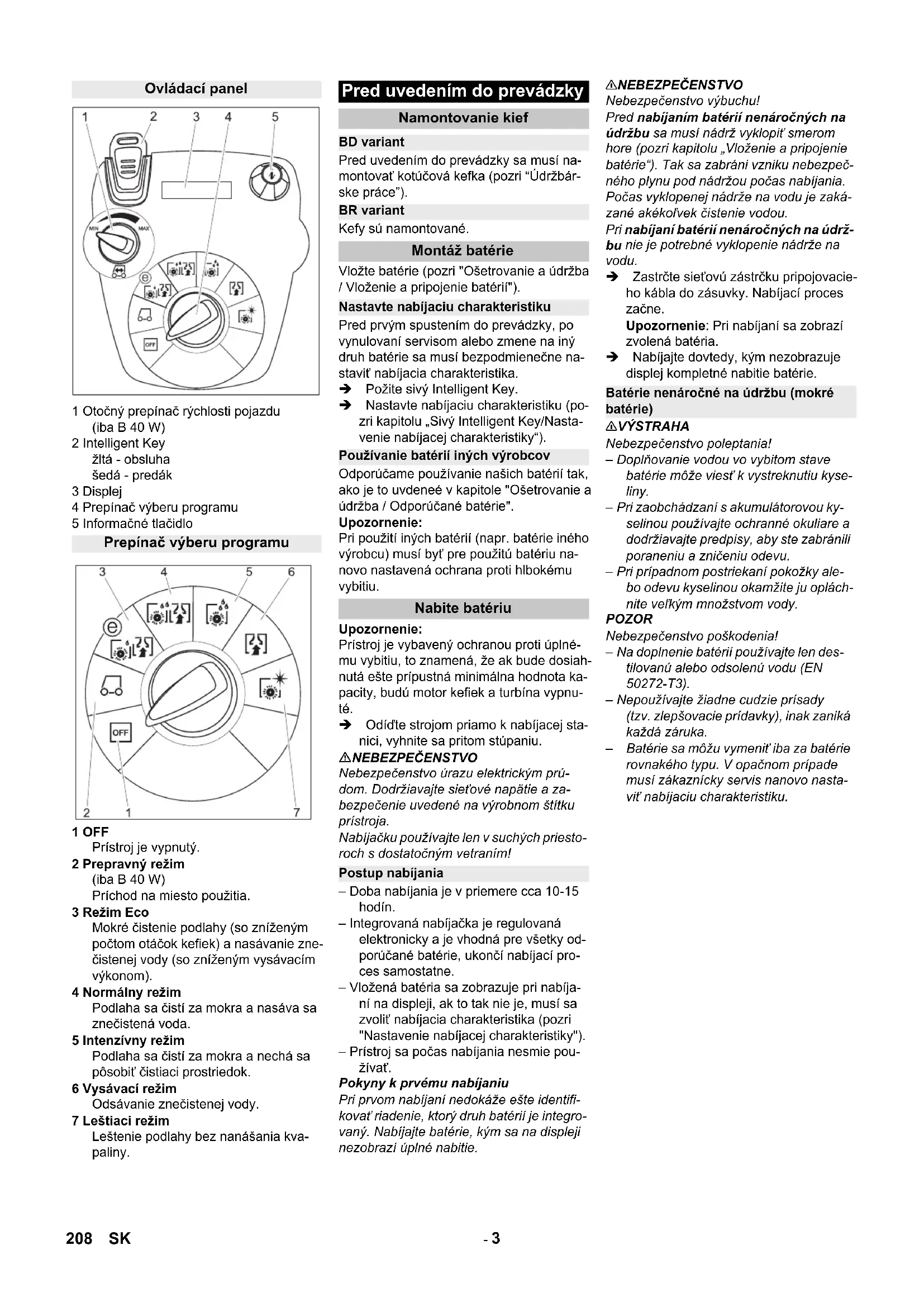 - nie je v rozsahu dodávky – Ovládacie prvky pre čistiaci proces sú žlté. – Ovládacie prvky pre údržbu a servis sú svetlosivé. Ovládacie a funkčné prvky Farebné označenie 207SK- 3 1 Otočný prepínač rýchlosti pojazdu (iba B 40 W) 2 Intelligent Key žltá - obsluha šedá - predák 3 Displej 4 Prepínač výberu programu 5 Informačné tlačidlo 1 OFF Prístroj je vypnutý. 2 Prepravný režim (iba B 40 W) Príchod na miesto použitia. 3 Režim Eco Mokré čistenie podlahy (so zníženým počtom otáčok kefiek) a nasávanie zne- čistenej vody (so zníženým vysávacím výkonom). 4 Normálny režim Podlaha sa čistí za mokra a nasáva sa znečistená voda. 5 Intenzívny režim Podlaha sa čistí za mokra a nechá sa pôsobiť čistiaci prostriedok. 6 Vysávací režim Odsávanie znečistenej vody. 7 Leštiaci režim Leštenie podlahy bez nanášania kva- paliny. Pred uvedením do prevádzky sa musí na- montovať kotúčová kefka (pozri “Údržbár- ske práce”). Kefy sú namontované. Vložte batérie (pozri "Ošetrovanie a údržba / Vloženie a pripojenie batérií"). Pred prvým spustením do prevádzky, po vynulovaní servisom alebo zmene na iný druh batérie sa musí bezpodmienečne na- staviť nabíjacia charakteristika. Požite sivý Intelligent Key. Nastavte nabíjaciu charakteristiku (po- zri kapitolu „Sivý Intelligent Key/Nasta- venie nabíjacej charakteristiky“). Odporúčame používanie našich batérií tak, ako je to uvdeneé v kapitole "Ošetrovanie a údržba / Odporúčané batérie". Upozornenie: Pri použití iných batérií (napr. batérie iného výrobcu) musí byť pre použitú batériu na- novo nastavená ochrana proti hlbokému vybitiu. Upozornenie: Prístroj je vybavený ochranou proti úplné- mu vybitiu, to znamená, že ak bude dosiah- nutá ešte prípustná minimálna hodnota ka- pacity, budú motor kefiek a turbína vypnu- té. Odíďte strojom priamo k nabíjacej sta- nici, vyhnite sa pritom stúpaniu. NEBEZPEČENSTVO Nebezpečenstvo úrazu elektrickým prú- dom. Dodržiavajte sieťové napätie a za- bezpečenie uvedené na výrobnom štítku prístroja. Nabíjačku používajte len v suchých priesto- roch s dostatočným vetraním! – Doba nabíjania je v priemere cca 10-15 hodín. – Integrovaná nabíjačka je regulovaná elektronicky a je vhodná pre všetky od- porúčané batérie, ukončí nabíjací pro- ces samostatne. – Vložená batéria sa zobrazuje pri nabíja- ní na displeji, ak to tak nie je, musí sa zvoliť nabíjacia charakteristika (pozri "Nastavenie nabíjacej charakteristiky"). – Prístroj sa počas nabíjania nesmie pou- žívať. Pokyny k prvému nabíjaniu Pri prvom nabíjaní nedokáže ešte identifi- kovať riadenie, ktorý druh batérií je integro- vaný. Nabíjajte batérie, kým sa na displeji nezobrazí úplné nabitie. 몇 NEBEZPEČENSTVO Nebezpečenstvo výbuchu! Pred nabíjaním batérií nenáročných na údržbu sa musí nádrž vyklopiť smerom hore (pozri kapitolu „Vloženie a pripojenie batérie“). Tak sa zabráni vzniku nebezpeč- ného plynu pod nádržou počas nabíjania. Počas vyklopenej nádrže na vodu je zaká- zané akékoľvek čistenie vodou. Pri nabíjaní batérií nenáročných na údrž-
