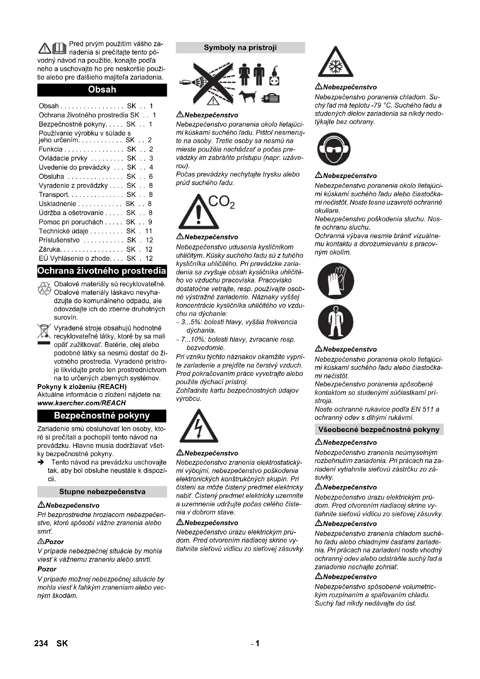 - %: bolesti hlavy, vyššia frekvencia dýchania. – 7 %: bolesti hlavy, zvracanie resp. bezvedomie. Pri vzniku týchto náznakov okamžite vypni- te zariadenie a prejdite na čerstvý vzduch. Pred pokračovaním práce vyvetrajte alebo použite dýchací prístroj. Zohľadnite kartu bezpečnostných údajov výrobcu. Nebezpečenstvo Nebezpečenstvo zranenia elektrostatický- mi výbojmi, nebezpečenstvo poškodenia elektronických konštrukčných skupín. Pri čistení sa môže čistený predmet elektricky nabiť. Čistený predmet elektricky uzemnite a uzemnenie udržujte počas celého čiste- nia v dobrom stave. Nebezpečenstvo Nebezpečenstvo úrazu elektrickým prú- dom. Pred otvorením riadiacej skrine vy- tiahnite sieťovú vidlicu zo sieťovej zásuvky. Nebezpečenstvo Nebezpečenstvo poranenia chladom. Su- chý ľad má teplotu -79 °C. Suchého ľadu a studených dielov zariadenia sa nikdy nedo- týkajte bez ochrany. Nebezpečenstvo Nebezpečenstvo poranenia okolo lietajúci- mi kúskami suchého ľadu alebo čiastočka- mi nečistôt. Noste tesne uzavreté ochranné okuliare. Nebezpečenstvo poškodenia sluchu. Nos- te ochranu sluchu. Ochranná výbava nesmie brániť vizuálne- mu kontaktu a dorozumievaniu s pracov- ným okolím. Nebezpečenstvo Nebezpečenstvo poranenia okolo lietajúci- mi kúskami suchého ľadu alebo čiastočka- mi nečistôt. Nebezpečenstvo poranenia spôsobené kontaktom so studenými súčiastkami prí- stroja. Noste ochranné rukavice podľa EN 511 a ochranný odev s dlhými rukávmi. Nebezpečenstvo Nebezpečenstvo zranenia neúmyselným rozbehnutím zariadenia. Pri prácach na za- riadení vytiahnite sieťovú zástrčku zo zá- suvky. Nebezpečenstvo Nebezpečenstvo úrazu elektrickým prú- dom. Pred otvorením riadiacej skrine vy- tiahnite sieťovú vidlicu zo sieťovej zásuvky. Nebezpečenstvo Nebezpečenstvo zranenia chladom suché- ho ľadu alebo chladnými časťami zariade- nia. Pri prácach na zariadení noste vhodný ochranný odev alebo odstráňte suchý ľad a zariadenie nechajte zohriať. Nebezpečenstvo Nebezpečenstvo spôsobené volumetric- kým rozpínaním a spaľovaním chladu. Suchý ľad nikdy nedávajte do úst. Obsah Obsah p. 10