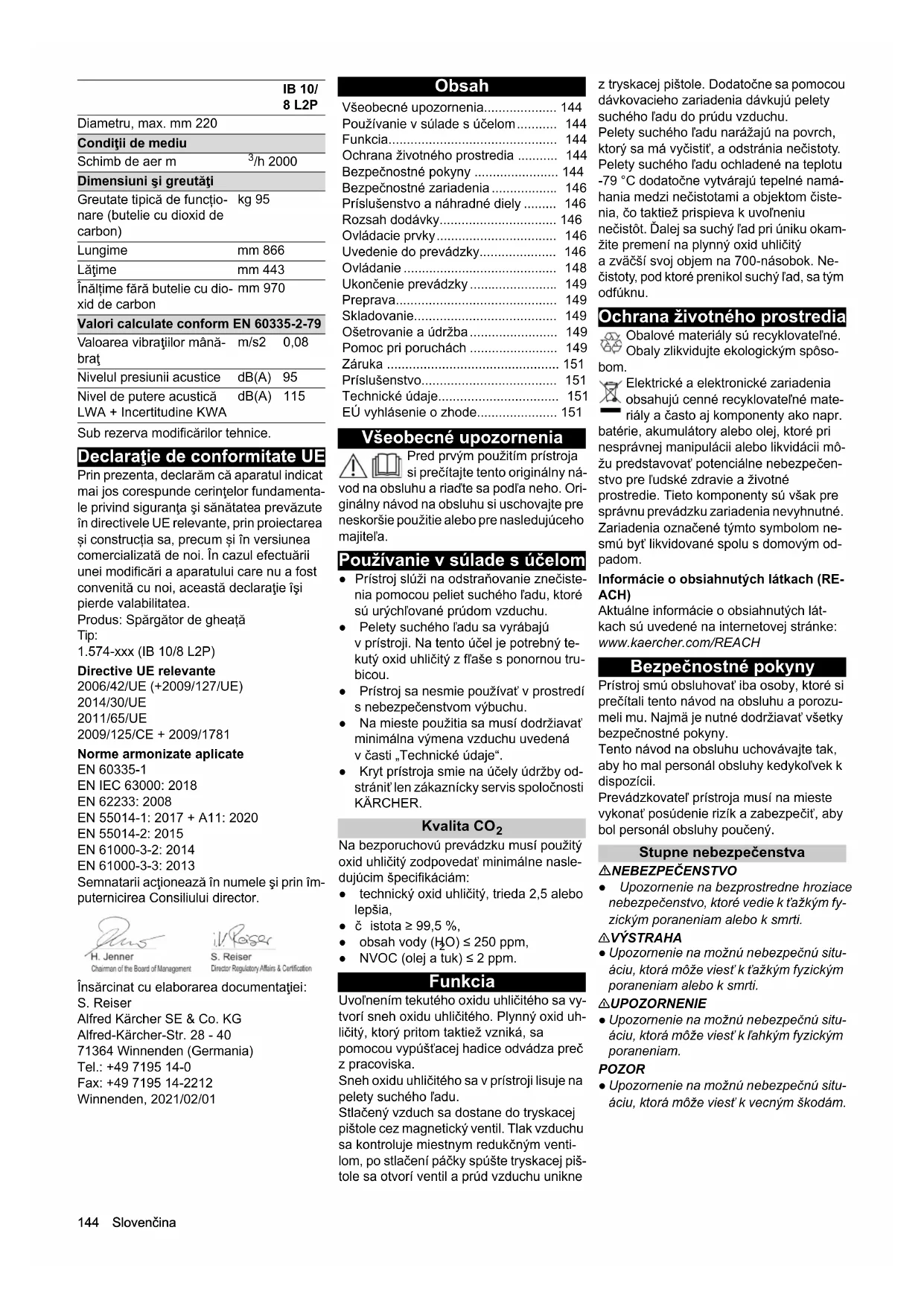 O) ≤ 250 ppm, ● NVOC (olej a tuk) ≤ 2 ppm. Funkcia Uvoľnením tekutého oxidu uhličitého sa vy- tvorí sneh oxidu uhličitého. Plynný oxid uh- ličitý, ktorý pritom taktiež vzniká, sa pomocou vypúšťacej hadice odvádza preč z pracoviska. Sneh oxidu uhličitého sa v prístroji lisuje na pelety suchého ľadu. Stlačený vzduch sa dostane do tryskacej pištole cez magnetický ventil. Tlak vzduchu sa kontroluje miestnym redukčným venti- lom, po stlačení páčky spúšte tryskacej piš- tole sa otvorí ventil a prúd vzduchu unikne z tryskacej pištole. Dodatočne sa pomocou dávkovacieho zariadenia dávkujú pelety suchého ľadu do prúdu vzduchu. Pelety suchého ľadu narážajú na povrch, ktorý sa má vyčistiť, a odstránia nečistoty. Pelety suchého ľadu ochladené na teplotu -79 °C dodatočne vytvárajú tepelné namá- hania medzi nečistotami a objektom čiste- nia, čo taktiež prispieva k uvoľneniu nečistôt. Ďalej sa suchý ľad pri úniku okam- žite premení na plynný oxid uhličitý a zväčší svoj objem na 700-násobok. Ne- čistoty, pod ktoré prenikol suchý ľad, sa tým odfúknu. Ochrana životného prostredia Obalové materiály sú recyklovateľné. Obaly zlikvidujte ekologickým spôso- bom. Elektrické a elektronické zariadenia obsahujú cenné recyklovateľné mate- riály a často aj komponenty ako napr. batérie, akumulátory alebo olej, ktoré pri nesprávnej manipulácii alebo likvidácii mô- žu predstavovať potenciálne nebezpečen- stvo pre ľudské zdravie a životné prostredie. Tieto komponenty sú však pre správnu prevádzku zariadenia nevyhnutné. Zariadenia označené týmto symbolom ne- smú byť likvidované spolu s domovým od- padom. Informácie o obsiahnutých látkach (RE- ACH) Aktuálne informácie o obsiahnutých lát- kach sú uvedené na internetovej stránke: www.kaercher.com/REACH Bezpečnostné pokyny Prístroj smú obsluhovať iba osoby, ktoré si prečítali tento návod na obsluhu a porozu- meli mu. Najmä je nutné dodržiavať všetky bezpečnostné pokyny. Tento návod na obsluhu uchovávajte tak, aby ho mal personál obsluhy kedykoľvek k dispozícii. Prevádzkovateľ prístroja musí na mieste vykonať posúdenie rizík a zabezpečiť, aby bol personál obsluhy poučený. Stupne nebezpečenstva NEBEZPEČENSTVO ● Upozornenie na bezprostredne hroziace nebezpečenstvo, ktoré vedie k ťažkým fy- zickým poraneniam alebo k smrti. 몇 VÝSTRAHA ● Upozornenie na možnú nebezpečnú situ- áciu, ktorá môže viesť k ťažkým fyzickým poraneniam alebo k smrti. 몇 UPOZORNENIE ● Upozornenie na možnú nebezpečnú situ- áciu, ktorá môže viesť k ľahkým fyzickým poraneniam. POZOR ● Upozornenie na možnú nebezpečnú situ- áciu, ktorá môže viesť k vecným škodám. Diametru, max. mm 220 Condiţii de mediu Schimb de aer m