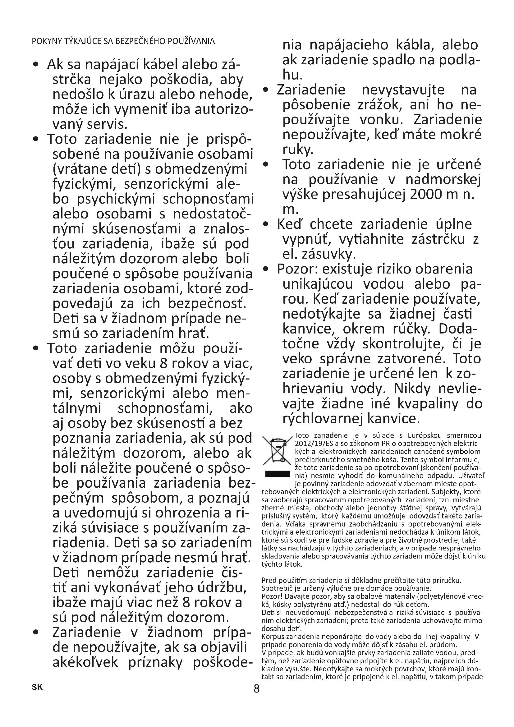 - Pozor: existuje riziko obarenia unikajúcou vodou alebo pa- rou. Keď zariadenie používate, nedotýkajte sa žiadnej čas kanvice, okrem rúčky. Doda- točne vždy skontrolujte, či je veko správne zatvorené. Toto zariadenie je určené len k zo- hrievaniu vody. Nikdy nevlie- vajte žiadne iné kvapaliny do rýchlovarnej kanvice. Toto zariadenie je v súlade s Európskou smernicou 2012/19/ES a so zákonom PR o opotrebovaných elektric- kých a elektronických zariadeniach označené symbolom prečiarknutého smetného koša. Tento symbol informuje, že toto zariadenie sa po opotrebovaní (skončení používa- nia) nesmie vyhodiť do komunálneho odpadu. Užívateľ je povinný zariadenie odovzdať v zbernom mieste opot- rebovaných elektrických a elektronických zariadení. Subjekty, ktoré sa zaoberajú spracovaním opotrebovaných zariadení, tzn. miestne zberné miesta, obchody alebo jednotky štátnej správy, vytvárajú príslušný systém, ktorý každému umožňuje odovzdať takéto zaria- denia. Vďaka správnemu zaobchádzaniu s opotrebovanými elek- trickými a elektronickými zariadeniami nedochádza k únikom látok, ktoré sú škodlivé pre ľudské zdravie a pre životné prostredie, také látky sa nachádzajú v týchto zariadeniach, a v prípade nesprávneho skladovania alebo spracovávania týchto zariadení môže dôjsť k úniku týchto látok. Pred použim zariadenia si dôkladne prečítajte túto príručku. Spotrebič je určený výlučne pre domáce používanie. Pozor! Dávajte pozor, aby sa obalové materiály (polyetylénové vrec- ká, kúsky polystyrénu atď.) nedostali do rúk deťom. De si neuvedomujú nebezpečenstvá a riziká súvisiace s používa- ním elektrických zariadení; preto také zariadenia uchovávajte mimo dosahu de. Korpus zariadenia neponárajte do vody alebo do inej kvapaliny. V prípade ponorenia do vody môže dôjsť k zásahu el. prúdom. V prípade, ak budú vonkajšie prvky zariadenia zaliate vodou, pred tým, než zariadenie opätovne pripojíte k el. napäu, najprv ich dô- kladne vysušte. Nedotýkajte sa mokrých povrchov, ktoré majú kon- takt so zariadením, ktoré je pripojené k el. napäu, v takom prípade9