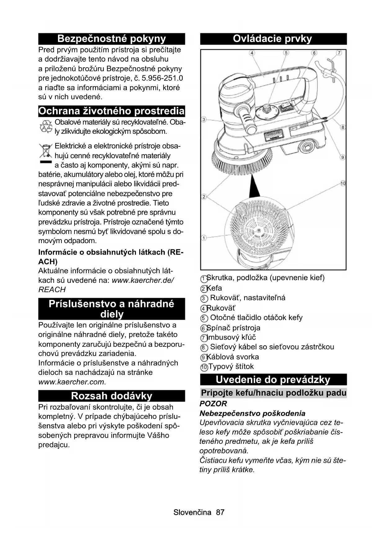 - EÚ vyhlásenie o zhode Slovenčina 87 Bezpečnostné pokyny Pred prvým použitím prístroja si prečítajte a dodržiavajte tento návod na obsluhu a priloženú brožúru Bezpečnostné pokyny pre jednokotúčové prístroje, č. 5.956-251.0 a riaďte sa informáciami a pokynmi, ktoré sú v nich uvedené. Ochrana životného prostredia Obalové materiály sú recyklovateľné. Oba- ly zlikvidujte ekologickým spôsobom. Elektrické a elektronické prístroje obsa- hujú cenné recyklovateľné materiály a často aj komponenty, akými sú napr. batérie, akumulátory alebo olej, ktoré môžu pri nesprávnej manipulácii alebo likvidácii pred- stavovať potenciálne nebezpečenstvo pre ľudské zdravie a životné prostredie. Tieto komponenty sú však potrebné pre správnu prevádzku prístroja. Prístroje označené týmto symbolom nesmú byť likvidované spolu s do- movým odpadom. Informácie o obsiahnutých látkach (RE- ACH) Aktuálne informácie o obsiahnutých lát- kach sú uvedené na: www.kaercher.de/ REACH Príslušenstvo a náhradné diely Používajte len originálne príslušenstvo a originálne náhradné diely, pretože takéto komponenty zaručujú bezpečnú a bezporu- chovú prevádzku zariadenia. Informácie o príslušenstve a náhradných dieloch sa nachádzajú na stránke www.kaercher.com. Rozsah dodávky Pri rozbaľovaní skontrolujte, či je obsah kompletný. V prípade chýbajúceho príslu- šenstva alebo pri výskyte poškodení spô- sobených prepravou informujte Vášho predajcu. Ovládacie prvky 1 Skrutka, podložka (upevnenie kief) 2 Kefa 3 Rukoväť, nastaviteľná 4 Rukoväť 5 Otočné tlačidlo otáčok kefy 6 Spínač prístroja 7 Imbusový kľúč 8 Sieťový kábel so sieťovou zástrčkou 9 Káblová svorka 10 Typový štítok Uvedenie do prevádzky Pripojte kefu/hnaciu podložku padu POZOR Nebezpečenstvo poškodenia Upevňovacia skrutka vyčnievajúca cez te- leso kefy môže spôsobiť poškriabanie čis- teného predmetu, ak je kefa príliš opotrebovaná. Čistiacu kefu vymeňte včas, kým nie sú šte- tiny príliš krátke.88 Slovenčina p. 90