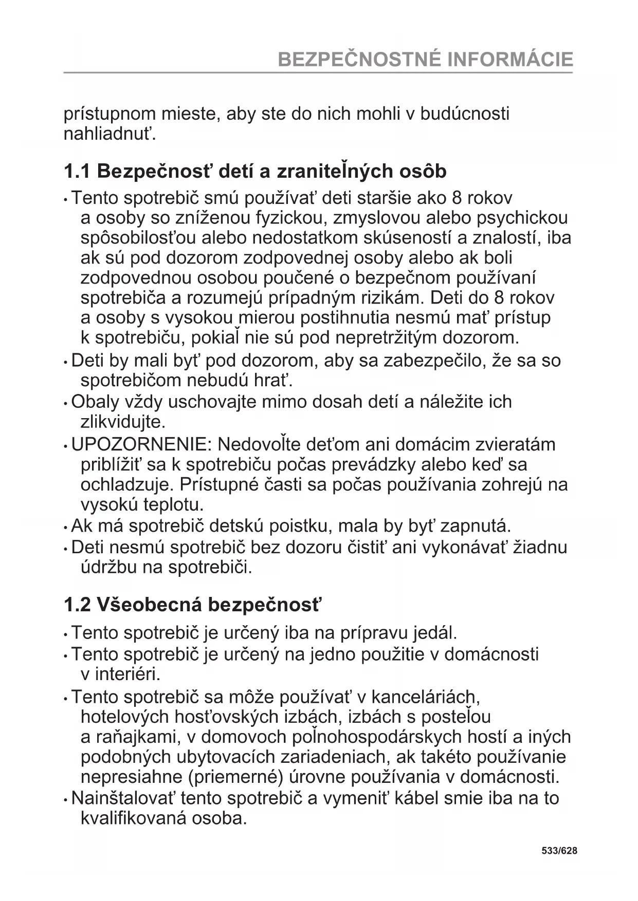 Pred inštaláciou a používaním spotrebiča si pozorne prečítajte priložený návod na používanie. Výrobca nezodpovedá za zranenia ani za škody spôsobené nesprávnou montážou alebo používaním. Tieto pokyny uskladnite na bezpečnom a 532/628 BEZPEČNOSTNÉ INFORMÁCIEprístupnom mieste, aby ste do nich mohli v budúcnosti nahliadnuť.