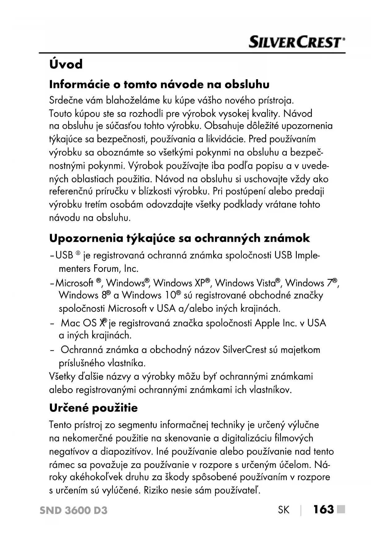 je registrovaná značka spoločnosti Apple Inc. v USA a iných krajinách. – Ochranná známka a obchodný názov SilverCrest sú majetkom príslušného vlastníka. Všetky ďalšie názvy a výrobky môžu byť ochrannými známkami alebo registrovanými ochrannými známkami ich vlastníkov. Určené použitie Tento prístroj zo segmentu informačnej techniky je určený výlučne na nekomerčné použitie na skenovanie a digitalizáciu filmových negatívov a diapozitívov. Iné používanie alebo používanie nad tento rámec sapovažuje zapoužívanie v rozpore s určenýmúčelom. Ná- roky akéhokoľvek druhu za škody spôsobené používaním v rozpore s určením sú vylúčené. Riziko nesie sám používateľ.SND 3600 D3 ■ 164 │ SK Použité výstražné upozornenia a symboly Vpredloženom návode na obsluhu sú použité nasledovné výstražné upozornenia: NEBEZPEČENSTVO Výstražné upozornenie stýmto stupňom nebezpe- čenstva označuje nebezpečnú situáciu. Ak sa nezabráni nebezpečnej situácii, bude to mať za násle- dok ťažké zranenia alebo smrť. ► Aby sa zabránilo nebezpečenstvu ťažkých zranení alebo smrti, musia sa dodržiavať inštrukcie uvedené v tomto výstražnom upozornení. VÝSTRAHA Výstražné upozornenie tohto stupňa nebezpe- čenstva označuje možnú nebezpečnú situáciu. Ak sa nezabráni nebezpečnej situácii, môže to mať za násle- dok ťažké zranenia alebo smrť. ► Aby sa zabránilo nebezpečenstvu ťažkých zranení alebo smrti, musia sa dodržiavať inštrukcie uvedené v tomto výstražnom upozornení. OPATRNE Výstražné upozornenie tohto stupňa nebezpe- čenstva označuje možnú nebezpečnú situáciu. Ak sa tejto nebezpečnej situácii nezabráni, môže to mať za následok zranenia. ► Aby ste zabránili zraneniam osôb, riaďte sa inštrukciami uvedenými vtomto výstražnom upozornení.SND 3600 D3 SK │ 165 ■ POZOR Výstražné upozornenie tohto stupňa nebezpečenstva označuje možné vecné škody. Ak sa tejto nebezpečnej situácii nezabráni, môže to mať za následokvecné škody. ► Aby ste zabránili vecným škodám, riaďte sa inštrukciami uvede- nými vtomto výstražnom upozornení. UPOZORNENIE ► Upozornenie obsahuje dodatočné informácie, ktoré uľahčujú manipuláciu sprístrojom. Bezpečnostné pokyny ■ Predpoužívaním skontrolujte prípadné viditeľné poškodenia prí- stroja. Doprevádzky neuvádzajte poškodený prístroj ani prístroj, ktorý predtým spadol nazem. ■ Poškodené káble alebo prívody nechajte vymeniť autorizovaným odborníkom alebo vzákazníckom servise. ■ Tento prístroj môžu používať deti od 8 rokov a tiež osoby so zní- ženými fyzickými, senzorickými alebo mentálnymi schopnosťami, prípadne snedostatočnými skúsenosťami alebo znalosťami, ak sú pod dohľadom, alebo ak boli dostatočne poučené obezpečnom používaní prístroja apochopili ztoho vyplývajúce riziká. Deti sa nesmú hrať s prístrojom. Deti nesmú vykonávať čistenie anipouží- vateľskú údržbu bez dohľadu. ■ Opravy prístroja smie vykonávať iba autorizovaný špecializovaný obchod alebo zákaznícky servis. Dôsledkom neodborných opráv môžu pre používateľa vzniknúť značné nebezpečenstvá. Navyše zanikne nárok na záruku.SND 3600 D3 ■ 166 │ SK ■ Na prístroji nevykonávajte žiadne prestavby ani zmeny. ■ Prístroj chráňte pred vlhkosťou avniknutím kvapalín dovnútra. Nestavajte na prístroj alebo vedľa prístroja žiadne predmety naplnené tekutinou (napr. vázy). ■ Nevystavujte prístroj pôsobeniu otvoreného plameňa a nestavajte naň alebo vedľa neho žiadne sviečky. Zabránite tak šíreniu požiaru. ■ Po rýchlom prenesení prístroja z tepla do chladu alebo z chladu do tepla ho nechajte aklimatizovať 30min.
