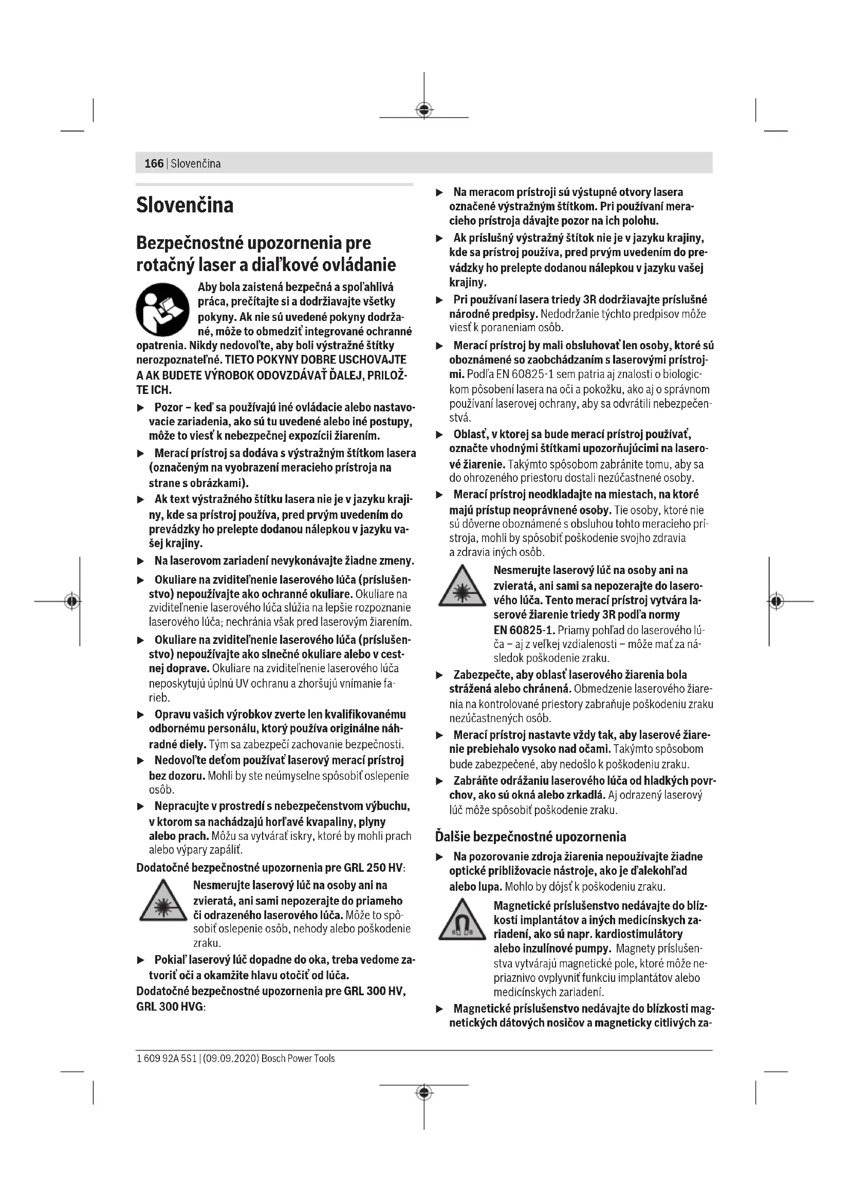 Překročený rozsah samonivelace 2×/s ○ ● Aktivovaná signalizace otřesů ● Zareagovala signalizace otřesů 2×/s ○ 2×/s Napětí baterie/akumulátoru pro ≤2h provozu 2×/s Vybité baterie/akumulátory ○ ○ ● ●:nepřetržitý provoz 2×/s: frekvence blikání (např. dvakrát za sekundu) ○:funkce zastavená Údržba aservis Údržba ačištění Měřicí přístroj, nabíječku adálkové ovládání udržujte neustále včistém stavu. Měřicí přístroj, nabíječku adálkové ovládání neponořujte do vody nebo jiných kapalin. Nečistoty otřete vlhkým, měkkým hadříkem. Nepoužívejte čisticí prostředky nebo rozpouštědla. Na měřicím přístroji pravidelně čistěte zejména plochy na výstupním otvoru laseru adávejte pozor na vlákna. Zákaznická služba aporadenství ohledně použití Zákaznická služba zodpoví vaše dotazy kopravě aúdržbě vašeho výrobku atéž knáhradním dílům. Rozkladové výkresy ainformace onáhradních dílech najdete také na: www.bosch-pt.com. Vpřípadě dotazů knašim výrobkům apříslušenství vám ochotně pomůže poradenský tým Bosch. Vpřípadě veškerých otázek aobjednávek náhradních dílů bezpodmínečně uveďte 10místné věcné číslo podle typového štítku výrobku. Czech Republic Robert Bosch odbytová s.r.o. Bosch Service Center PT K Vápence 1621/16 692 01 Mikulov Na www.bosch-pt.cz si si můžete objednat opravu Vašeho stroje nebo náhradní díly online. Tel.: +420 519 305700 Fax: +420 519 305705 E-Mail: servis.naradi@cz.bosch.com www.bosch-pt.cz Další adresy servisů najdete na: www.bosch-pt.com/serviceaddresses Likvidace Elektrické přístroje, akumulátory/baterie, příslušenství aobaly je třeba odevzdat kekologické recyklaci. Elektrické přístroje aakumulátory/baterie nevyhazujte do domovního odpadu! Pouze pro zeměEU: Podle evropské směrnice 2012/19/EU se musí již nepoužitelná elektrická zařízení apodle evropské směrnice 2006/66/ES vadné nebo opotřebované akumulátory/ baterie shromažďovat odděleně aodevzdat kekologické recyklaci. Bosch Power Tools 1 609 92A 5S1 | (09.09.2020)166 | Slovenčina Slovenčina Bezpečnostné upozornenia pre rotačný laser adiaľkové ovládanie Aby bola zaistená bezpečná aspoľahlivá práca, prečítajte si adodržiavajte všetky pokyny. Ak nie sú uvedené pokyny dodrža- né, môže to obmedziť integrované ochranné opatrenia. Nikdy nedovoľte, aby boli výstražné štítky nerozpoznateľné. TIETO POKYNY DOBRE USCHOVAJTE AAK BUDETE VÝROBOK ODOVZDÁVAŤ ĎALEJ, PRILOŽ- TE ICH. u Pozor – keď sa používajú iné ovládacie alebo nastavo- vacie zariadenia, ako sú tu uvedené alebo iné postupy, môže to viesť knebezpečnej expozícii žiarením. u Merací prístroj sa dodáva svýstražným štítkom lasera (označeným na vyobrazení meracieho prístroja na strane s obrázkami). u Ak text výstražného štítku lasera nie je vjazyku kraji- ny, kde sa prístroj používa, pred prvým uvedením do prevádzky ho prelepte dodanou nálepkou vjazyku va- šej krajiny. u Na laserovom zariadení nevykonávajte žiadne zmeny.u Okuliare na zviditeľnenie laserového lúča (príslušen- stvo) nepoužívajte ako ochranné okuliare. Okuliare na zviditeľnenie laserového lúča slúžia na lepšie rozpoznanie laserového lúča; nechránia však pred laserovým žiarením. u Okuliare na zviditeľnenie laserového lúča (príslušen- stvo) nepoužívajte ako slnečné okuliare alebo vcest- nej doprave. Okuliare na zviditeľnenie laserového lúča neposkytujú úplnú UV ochranu azhoršujú vnímanie fa- rieb. u Opravu vašich výrobkov zverte len kvalifikovanému odbornému personálu, ktorý používa originálne náh- radné diely. Tým sa zabezpečí zachovanie bezpečnosti. u Nedovoľte deťom používať laserový merací prístroj bez dozoru. Mohli by ste neúmyselne spôsobiť oslepenie osôb. u Nepracujte vprostredí snebezpečenstvom výbuchu, vktorom sa nachádzajú horľavé kvapaliny, plyny alebo prach. Môžu sa vytvárať iskry, ktoré by mohli prach alebo výpary zapáliť. Dodatočné bezpečnostné upozornenia pre GRL250HV: Nesmerujte laserový lúč na osoby ani na zvieratá, ani sami nepozerajte do priameho či odrazeného laserového lúča. Môže to spô- sobiť oslepenie osôb, nehody alebo poškodenie zraku. u Pokiaľ laserový lúč dopadne do oka, treba vedome za- tvoriť oči aokamžite hlavu otočiť od lúča. Dodatočné bezpečnostné upozornenia pre GRL300HV, GRL300HVG: u Na meracom prístroji sú výstupné otvory lasera označené výstražným štítkom. Pri používaní mera- cieho prístroja dávajte pozor na ich polohu. u Ak príslušný výstražný štítok nie je vjazyku krajiny, kde sa prístroj používa, pred prvým uvedením do pre- vádzky ho prelepte dodanou nálepkou vjazyku vašej krajiny. u Pri používaní lasera triedy 3R dodržiavajte príslušné národné predpisy. Nedodržanie týchto predpisov môže viesť kporaneniam osôb. u Merací prístroj by mali obsluhovať len osoby, ktoré sú oboznámené so zaobchádzaním slaserovými prístroj- mi. Podľa EN 60825-1 sem patria aj znalosti obiologic- kom pôsobení lasera na oči apokožku, ako aj osprávnom používaní laserovej ochrany, aby sa odvrátili nebezpečen- stvá. u Oblasť, vktorej sa bude merací prístroj používať, označte vhodnými štítkami upozorňujúcimi na lasero- vé žiarenie. Takýmto spôsobom zabránite tomu, aby sa do ohrozeného priestoru dostali nezúčastnené osoby. u Merací prístroj neodkladajte na miestach, na ktoré majú prístup neoprávnené osoby. Tie osoby, ktoré nie sú dôverne oboznámené sobsluhou tohto meracieho prí- stroja, mohli by spôsobiť poškodenie svojho zdravia azdravia iných osôb. Nesmerujte laserový lúč na osoby ani na zvieratá, ani sami sa nepozerajte do lasero- vého lúča. Tento merací prístroj vytvára la- serové