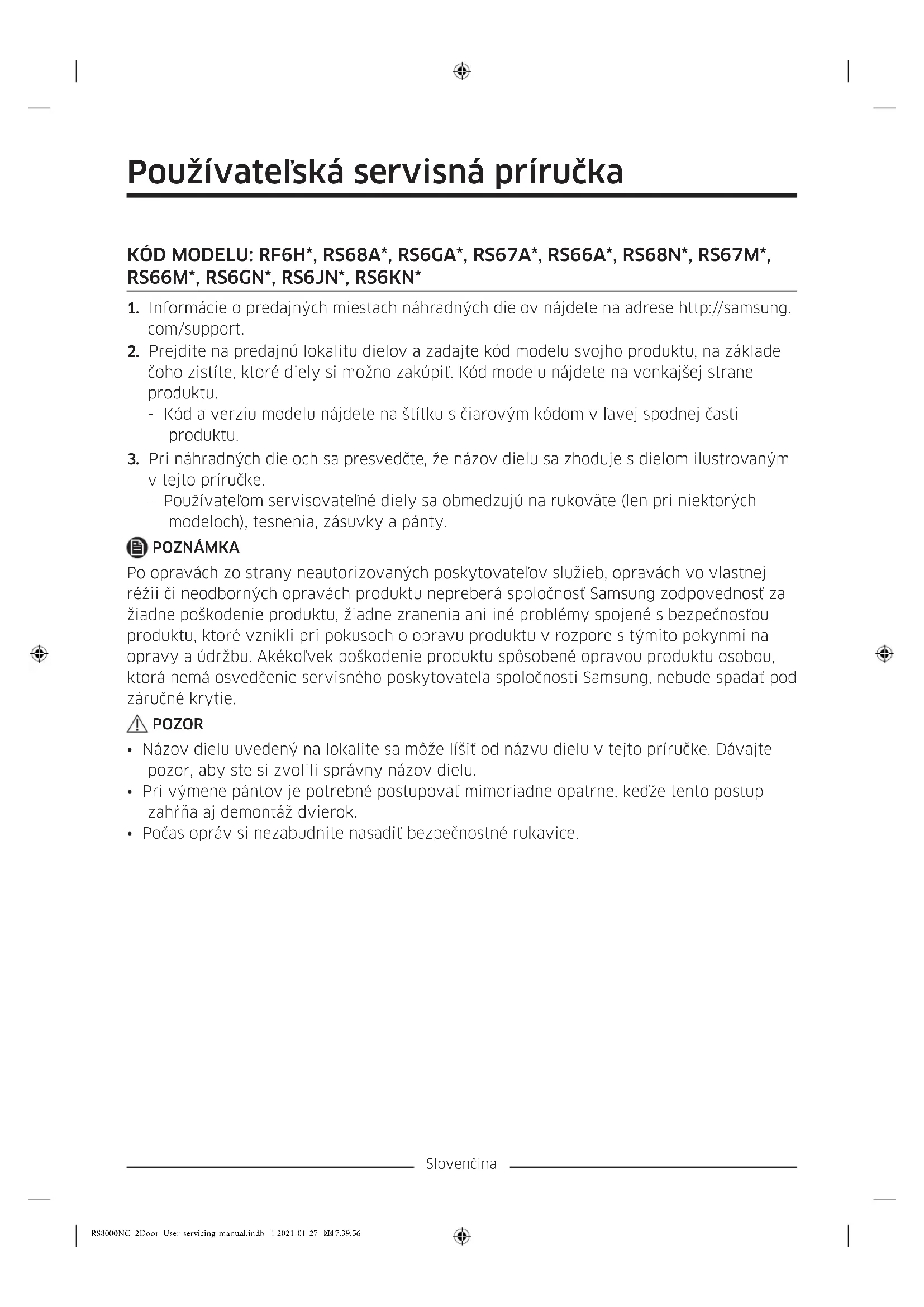 - Počas opráv si nezabudnite nasadiť bezpečnostné rukavice. RS8000NC_2Door_User-servicing-manual.indb 1 2021-01-27 7:39:56Slovenčina Skutočný vzhľad a uvedené diely chladničky sa môžu líšiť v závislosti od modelu a krajiny.