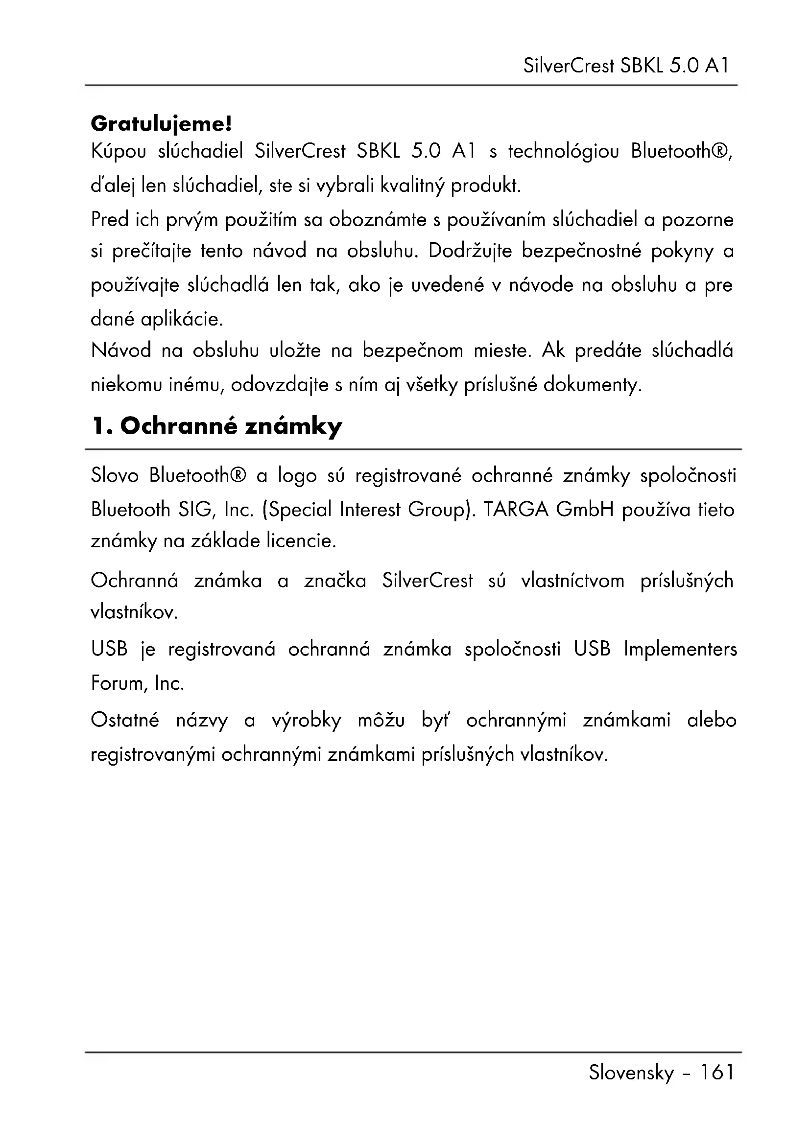 Slovo Bluetooth® a logo sú registrované ochranné známky spoločnosti Bluetooth SIG, Inc. (Special Interest Group). TARGA GmbH používa tieto známky na základe licencie. Ochranná známka a značka SilverCrest sú vlastníctvom príslušných vlastníkov. USB je registrovaná ochranná známka spoločnosti USB Implementers Forum, Inc. Ostatné názvy a výrobky môžu byť ochrannými známkami alebo registrovanými ochrannými známkami príslušných vlastníkov.SilverCrest SBKL 5.0 A1 162 – Slovensky