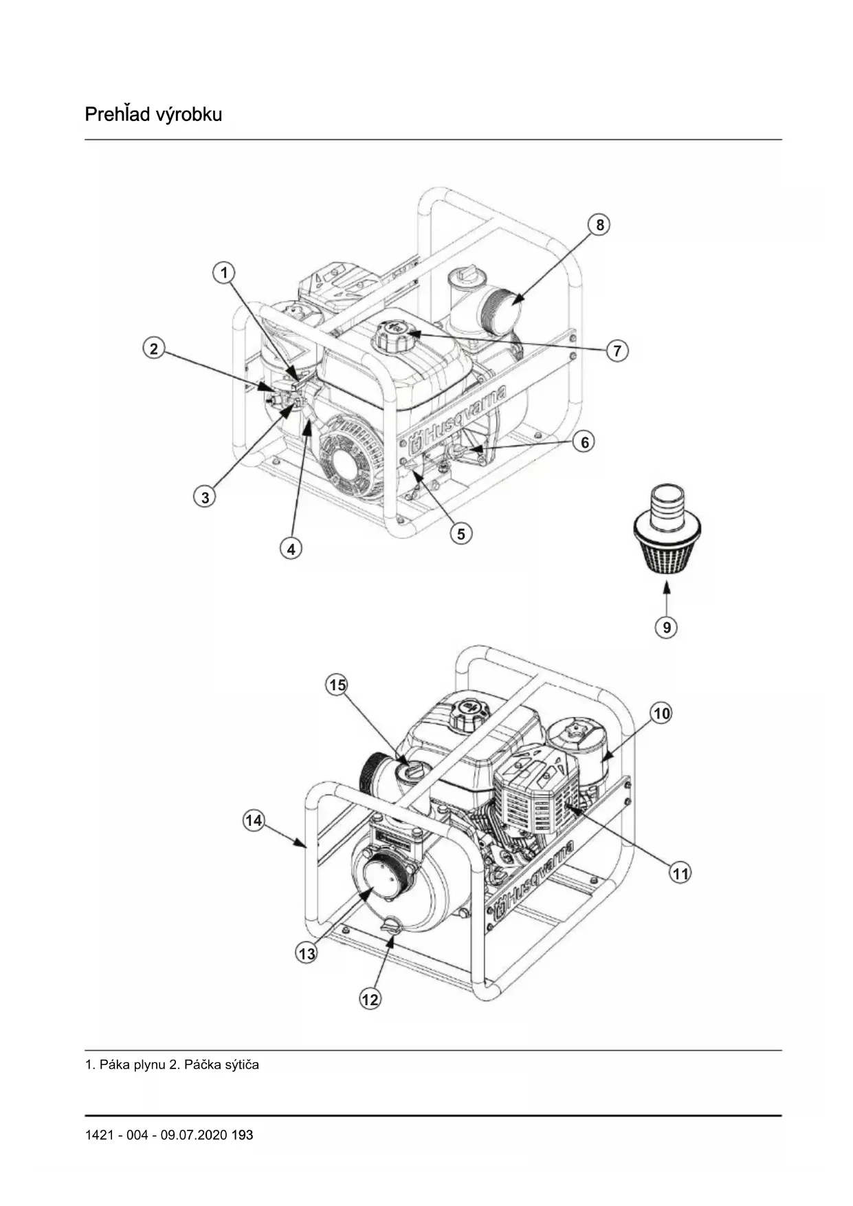 Symboly na výrobku UPOZORNENIE: Postupujte opatrne a používajte výrobok správnym spôsobom. Tento výrobok môže spôsobiť vážne poranenie alebo usmrtenie obsluhujúceho pracovníka alebo iných osôb. Skôr než začnete produkt používať, pozorne si prečítajte návod na obsluhu a dôsledne sa oboznámte s pokynmi. Používajte schválené prostriedky na ochranu sluchu a ochranu očí. Tento výrobok je v súlade s príslušnými smernicami EU. Pred vykonávaním opráv a údržby vypnite motor a odpojte kábel zapaľovania. Nebezpečenstvo iskrenia. Udržiavajte ruky mimo dosahu rotujúcich častí. Nevdychujte výfukové plyny. Nepoužívajte výrobok so spaľovacím motorom v interiéri ani v oblastiach bez dostatočného vetrania. Hrozí nebezpečenstvo vzniku popálenín. Nefajčite v blízkosti paliva. Hrozí nebezpečenstvo požiaru. Nízka hladina oleja. Emisie hluku do okolia podľa európskej smernice 2000/14/EÚ a legislatívy v štáte New South Wales „Protection of the Environment Operations (Noise Control) Regulation 2017“ (Nariadenie o ochrane životného prostredia pri prevádzke (kontrola hluku) z roku 2017). Údaje o emisii hluku možno nájsť na štítku stroja a v kapitole s technickými údajmi. Poznámka: Ostatné symboly/emblémy na výrobku odkazujú na požiadavky certifikácie pre ďalšie komerčné oblasti. Typový štítok Prod. year 0000 Serial No. Product Article No. Model Inlet / outlet size Lift Suction Engine model Max power Fuel tank capacity N.W/G.W (kg) Max discharge capacity (m³/h) Husqvarna AB SE-561 82 Huskvarna Sweden 194 1421 - 004 - 09.07.2020Bezpečnosť Bezpečnostné definície Výstrahy, upozornenia a poznámky slúžia na zdôraznenie mimoriadne dôležitých častí návodu. VÝSTRAHA: Používa sa, ak pre obsluhu alebo osoby v okolí existuje nebezpečenstvo poranenia alebo smrti v prípade nedodržania pokynov v návode. VAROVANIE: Používa sa, ak hrozí nebezpečenstvo poškodenia produktu, iných materiálov alebo okolitej oblasti v prípade nedodržania pokynov v návode. Poznámka: Používa sa na poskytnutie informácií nad rámec nevyhnutných informácií v danej situácii. Všeobecné bezpečnostné pokyny VÝSTRAHA: Skôr než budete výrobok používať, mali by ste si prečítať a plne pochopiť nasledujúce pokyny.