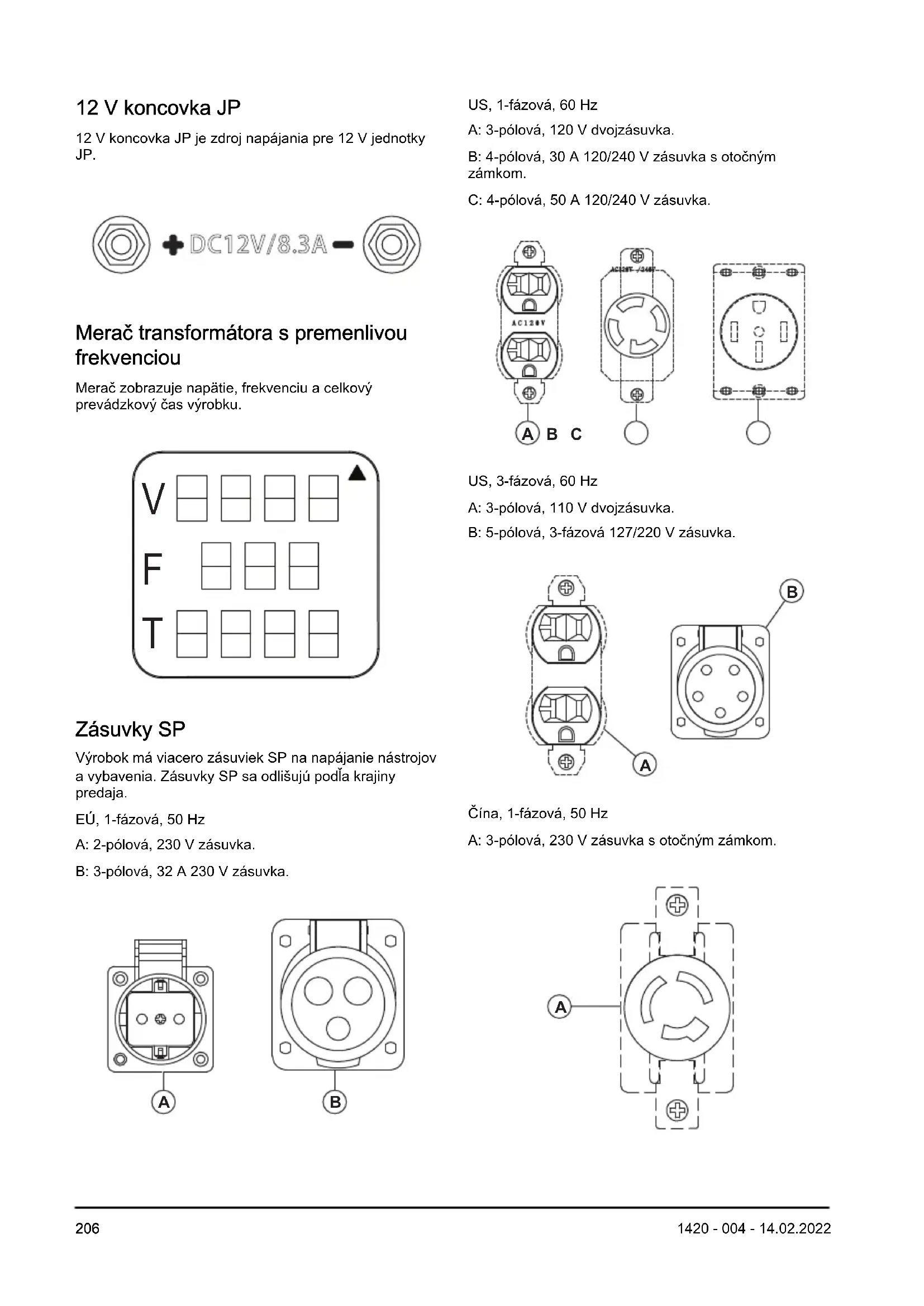 Zásuvky SP Výrobok má viacero zásuviek SP na napájanie nástrojov a vybavenia. Zásuvky SP sa odlišujú podľa krajiny predaja. EÚ, 1-fázová, 50 Hz A: 2-pólová, 230 V zásuvka. B: 3-pólová, 32 A 230 V zásuvka. A B US, 1-fázová, 60 Hz A: 3-pólová, 120 V dvojzásuvka. B: 4-pólová, 30 A 120/240 V zásuvka s otočným zámkom. C: 4-pólová, 50 A 120/240 V zásuvka. A B C US, 3-fázová, 60 Hz A: 3-pólová, 110 V dvojzásuvka. B: 5-pólová, 3-fázová 127/220 V zásuvka.