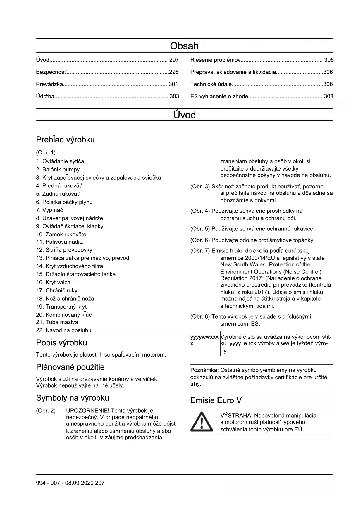 Popis výrobku Tento výrobok je plotostrih so spaľovacím motorom. Plánované použitie Výrobok slúži na orezávanie konárov a vetvičiek. Výrobok nepoužívajte na iné účely. Symboly na výrobku (Obr. 2) UPOZORNENIE! Tento výrobok je nebezpečný. V prípade neopatrného a nesprávneho použitia výrobku môže dôjsť k zraneniu alebo usmrteniu obsluhy alebo osôb v okolí. V záujme predchádzania zraneniam obsluhy a osôb v okolí si prečítajte a dodržiavajte všetky bezpečnostné pokyny v návode na obsluhu. (Obr. 3) Skôr než začnete produkt používať, pozorne si prečítajte návod na obsluhu a dôsledne sa oboznámte s pokynmi. (Obr. 4) Používajte schválené prostriedky na ochranu sluchu a ochranu očí. (Obr. 5) Používajte schválené ochranné rukavice. (Obr. 6) Používajte odolné protišmykové topánky. (Obr. 7) Emisie hluku do okolia podľa európskej smernice 2000/14/EÚ a legislatívy v štáte New South Wales „Protection of the Environment Operations (Noise Control) Regulation 2017“ (Nariadenie o ochrane životného prostredia pri prevádzke (kontrola hluku) z roku 2017). Údaje o emisii hluku možno nájsť na štítku stroja a v kapitole s technickými údajmi. (Obr. 8) Tento výrobok je v súlade s príslušnými smernicami ES. yyyywwxxx