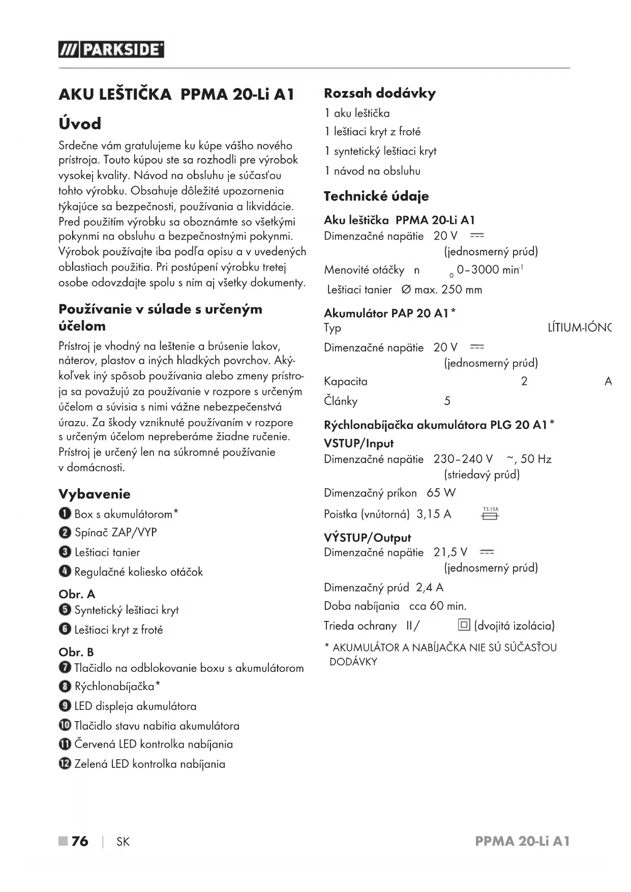 SK AKU LEŠTIČKA PPMA 20-Li A1 Úvod Srdečne vám gratulujeme kukúpe vášho nového prístroja. Touto kúpou ste sa rozhodli pre výrobok vysokej kvality. Návod na obsluhu je súčasťou tohto výrobku. Obsahuje dôležité upozornenia týkajúce sa bezpečnosti, používania a likvidácie. Pred použitím výrobku sa oboznámte sovšetkými pokynmi na obsluhu a bezpečnostnými pokynmi. Výrobok používajte iba podľa opisu a vuvedených oblastiach použitia. Pri postúpení výrobku tretej osobe odovzdajte spolu sním aj všetky dokumenty. Používanie vsúlade surčeným účelom Prístroj je vhodný na leštenie a brúsenie lakov, náterov, plastov a iných hladkých povrchov. Aký- koľvek iný spôsob používania alebo zmeny prístro- ja sa považujú za používanie v rozpore surčeným účelom a súvisia s nimi vážne nebezpečenstvá úrazu. Za škody vzniknuté používaním v rozpore s určeným účelom nepreberáme žiadne ručenie. Prístroj je určený len na súkromné používanie v domácnosti. Vybavenie Box s akumulátorom* Spínač ZAP/VYP Leštiaci tanier Regulačné koliesko otáčok Obr. A Syntetický leštiaci kryt Leštiaci kryt z froté Obr. B Tlačidlo na odblokovanie boxu s akumulátorom Rýchlonabíjačka* LED displeja akumulátora Tlačidlo stavu nabitia akumulátora Červená LED kontrolka nabíjania Zelená LED kontrolka nabíjania Rozsah dodávky 1 aku leštička 1 leštiaci kryt z froté 1 syntetický leštiaci kryt 1 návod na obsluhu Technické údaje Aku leštička PPMA 20-Li A1 Dimenzačné napätie 20 V (jednosmerný prúd) Menovité otáčky n