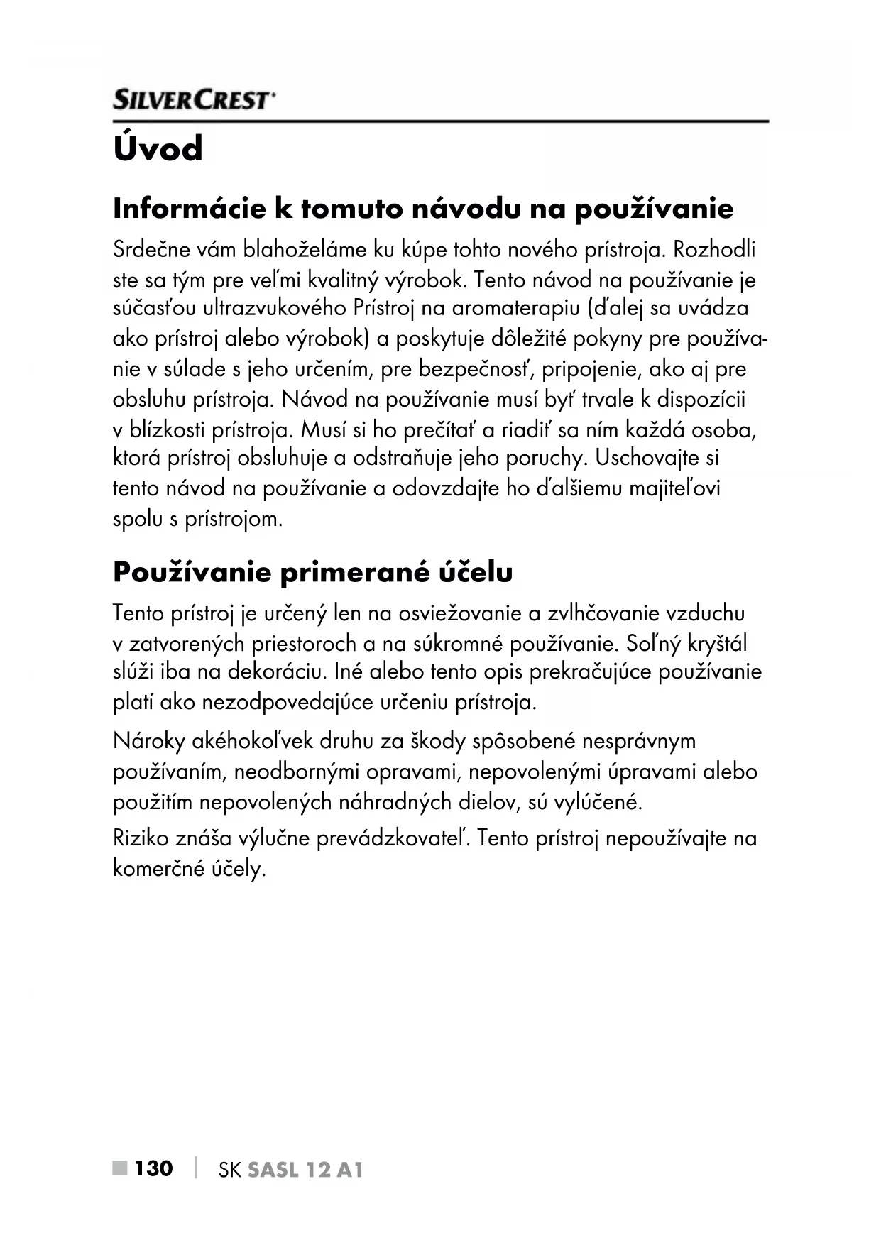Úvod Informácie k tomuto návodu na používanie Srdečne vám blahoželáme ku kúpe tohto nového prístroja. Rozhodli ste sa tým pre veľmi kvalitný výrobok. Tento návod na používanie je súčasťou ultrazvukového Prístroj na aromaterapiu (ďalej sa uvádza ako prístroj alebo výrobok) a poskytuje dôležité pokyny pre používa- nie v súlade s jeho určením, pre bezpečnosť, pripojenie, ako aj pre obsluhu prístroja. Návod na používanie musí byť trvale k dispozícii v blízkosti prístroja. Musí si ho prečítať a riadiť sa ním každá osoba, ktorá prístroj obsluhuje a odstraňuje jeho poruchy. Uschovajte si tento návod na používanie a odovzdajte ho ďalšiemu majiteľovi spolu s prístrojom. Používanie primerané účelu Tento prístroj je určený len na osviežovanie a zvlhčovanie vzduchu v zatvorených priestoroch a na súkromné používanie. Soľný kryštál slúži iba na dekoráciu. Iné alebo tento opis prekračujúce používanie platí ako nezodpovedajúce určeniu prístroja. Nároky akéhokoľvek druhu za škody spôsobené nesprávnym používaním, neodbornými opravami, nepovolenými úpravami alebo použitím nepovolených náhradných dielov, sú vylúčené. Riziko znáša výlučne prevádzkovateľ. Tento prístroj nepoužívajte na komerčné účely.SK