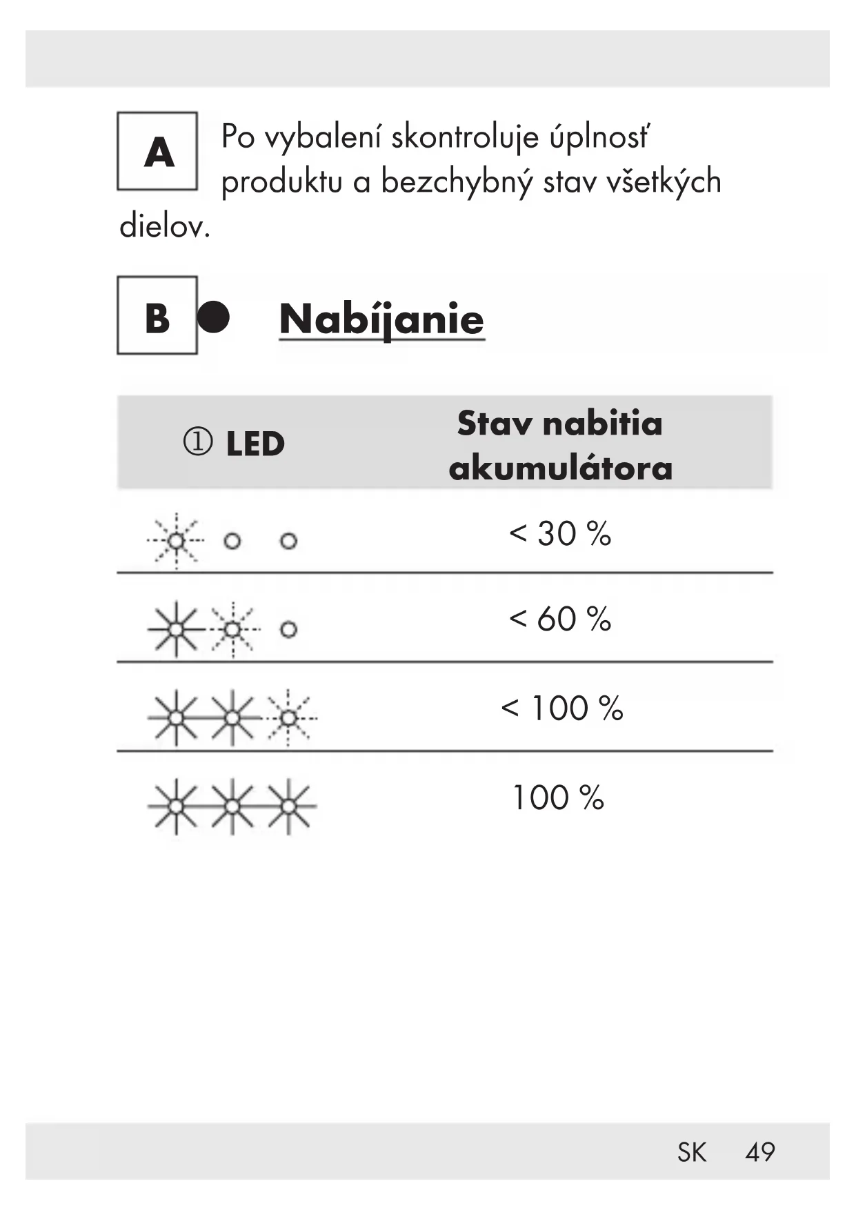 Po vybalení skontroluje úplnosť produktu a bezchybný stav všetkých dielov. B Nabíjanie j LED Stav nabitia akumulátora < 30 % < 60 % < 100 % 100 %50 SK k LED Stav Červená Nabíja sa Biela (svieti cca 20 s, potom zhasne) Plne nabitý Vypnúť Nenabíja sa/vypnutý