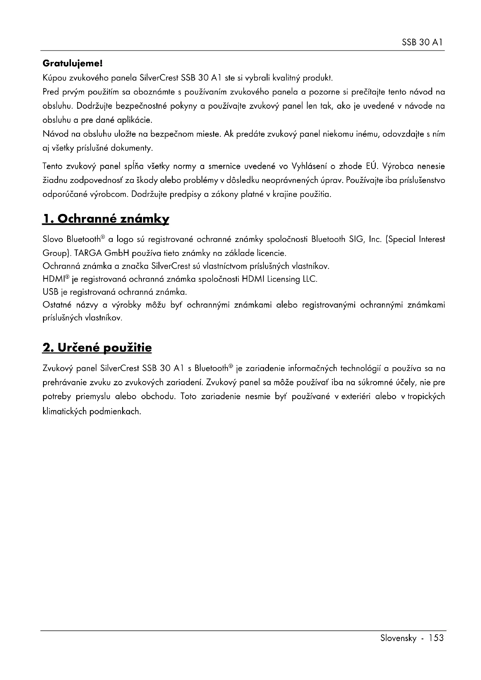 13. Zhoda ................................................................................................................... 173 14. Informácie o záruke a servise ............................................................................... 174SSB 30 A1 Slovensky - 153 Gratulujeme! Kúpou zvukového panela SilverCrest SSB 30 A1 ste si vybrali kvalitný produkt. Pred prvým použitím sa oboznámte s používaním zvukového panela a pozorne si prečítajte tento návod na obsluhu. Dodržujte bezpečnostné pokyny a používajte zvukový panel len tak, ako je uvedené v návode na obsluhu a pre dané aplikácie. Návod na obsluhu uložte na bezpečnom mieste. Ak predáte zvukový panel niekomu inému, odovzdajte s ním aj všetky príslušné dokumenty. Tento zvukový panel spĺňa všetky normy a smernice uvedené vo Vyhlásení o zhode EÚ. Výrobca nenesie žiadnu zodpovednosť za škody alebo problémy v dôsledku neoprávnených úprav. Používajte iba príslušenstvo odporúčané výrobcom. Dodržujte predpisy a zákony platné v krajine použitia.