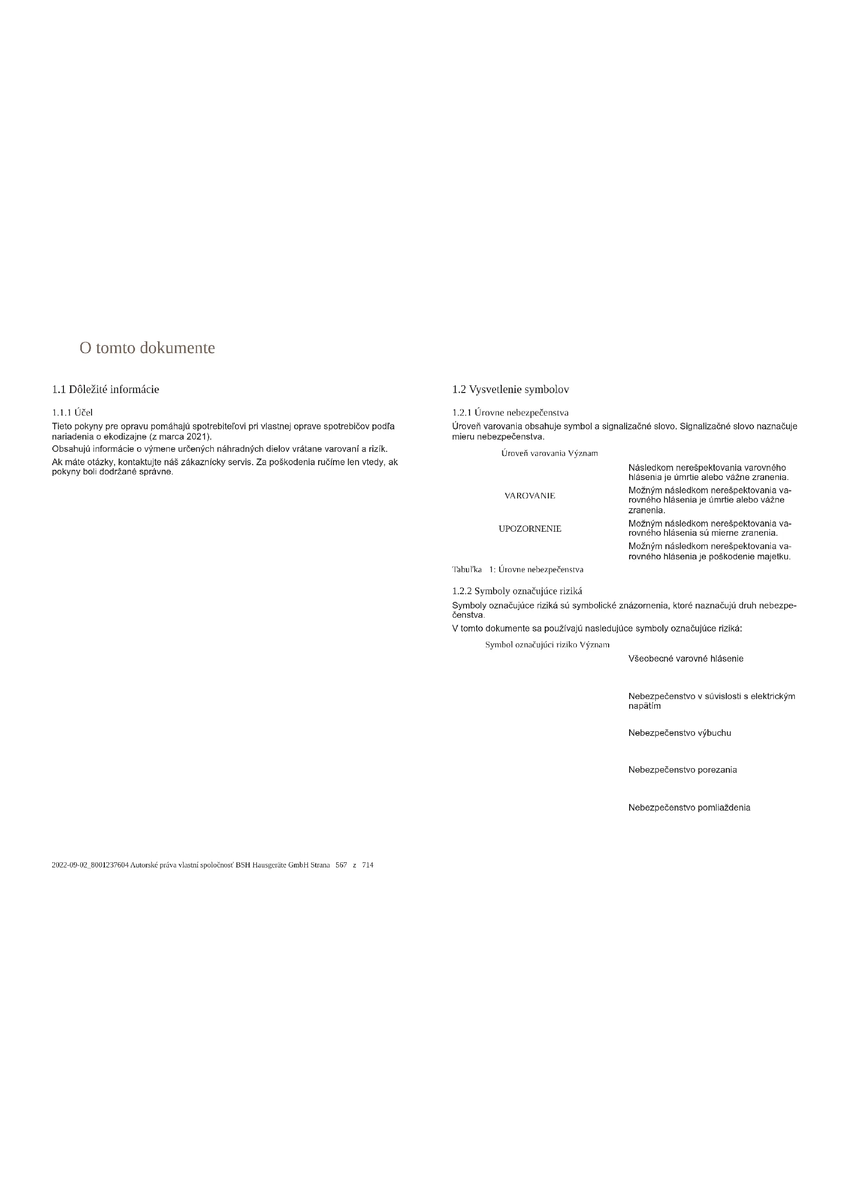 V tomto dokumente sa používajú nasledujúce všeobecné symboly: Všeob. symbol Význam Označenie špeciálneho pokynu (textové a/alebo grafické) Označenie jednoduchého pokynu (len textové) Všeob. symbol Význam Označenie prepojenia na videonávod Označenie požadovaných nástrojov Označenie požadovaných podmienok Označenie podmienky (ak ..., potom ...) Označenie výsledku Spustenie Označenie klávesu alebo tlačidla [00123456] Označenie čísla materiálu Stav Označenie zobrazeného textu/okna (na displeji spotrebiča) Tabuľka3: Všeobecné symboly O tomto dokumente 2022-09-02_8001237604 Autorské práva vlastní spoločnosť BSH Hausgeräte GmbH Strana568z714Bezpečnosť