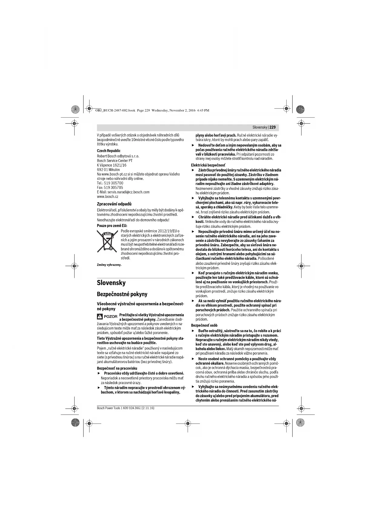 OBJ_BUCH-2487-002.book Page 237 Wednesday, November 2, 2016 4:43 PM238 | Slovensky 1 609 92A 36G | (2.11.16) Bosch Power Tools Úroveň kmitov uvedená v týchto pokynoch bola nameraná podľa meracieho postupu uvedeného v norme EN 60745 a možno ju používať na vzájomné porovnávanie elektronára- dia. Hodí sa aj na predbežný odhad zaťaženia vibráciami. Uvedená hladina vibrácií reprezentuje hlavné druhy používa- nia tohto ručného elektrického náradia. Pokiaľ sa ale bude elektronáradie používať na iné práce, s odlišným príslušen- stvom, s inými nástrojmi alebo s nedostatočnou údržbou, mo- že sa úroveň vibrácií líšiť. To môže výrazne zvýšiť zaťaženie vibráciami počas celej pracovnej doby. Na presný odhad zaťaženia vibráciami počas určitého časové- ho úseku práce s náradím treba zohľadniť doby, počas kto- rých je ručné elektrické náradie vypnuté alebo doby, keď ná- radie síce beží, ale v skutočnosti sa nepoužíva. To môže výraz- ne redukovať zaťaženie vibráciami počas celej pracovnej do- by. Na ochranu osoby pracujúcej s náradím pred účinkami zaťa- ženia vibráciami vykonajte ďalšie bezpečnostné opatrenia, ako sú napríklad: údržba ručného elektrického náradia a používaných pracovných nástrojov, zabezpečenie zachova- nia teploty rúk, organizácia jednotlivých pracovných úkonov. Vyhlásenie o konformite Vyhlasujeme na výhradnú zodpovednosť, že výrobok opísaný v časti „Technické údaje“ spĺňa všetky príslušné ustanovenia smerníc 2011/65/EÚ, 2014/30/EÚ, 2006/42/ES vrátane ich zmien a je v súlade s nasledujúcimi normami: EN 60745-1, EN 60745-2-3, EN 50581. Súbor technickej dokumentácie (2006/42/ES) sa nachádza u: