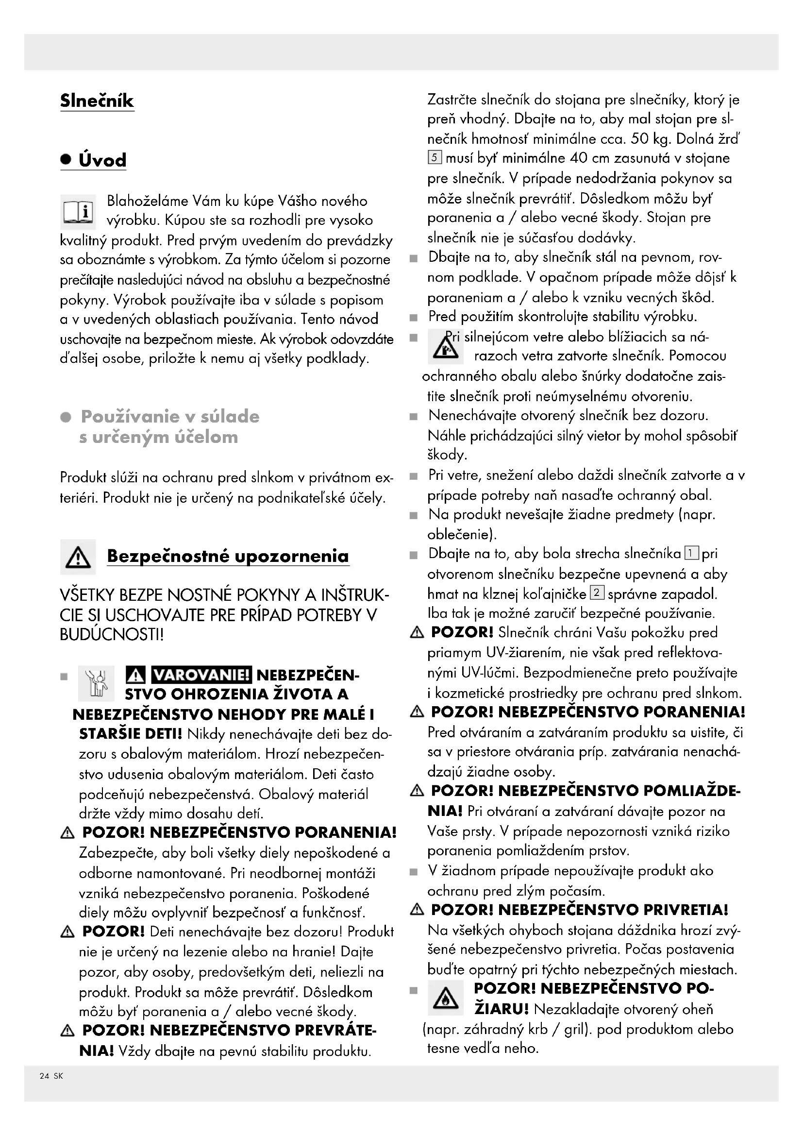 musí byť minimálne 40 cm zasunutá v stojane pre slnečník. V prípade nedodržania pokynov sa môže slnečník prevrátiť. Dôsledkom môžu byť poranenia a / alebo vecné škody. Stojan pre slnečník nie je súčasťou dodávky. Dbajte na to, aby slnečník stál na pevnom, rov- nom podklade. V opačnom prípade môže dôjsť k poraneniam a / alebo k vzniku vecných škôd. Pred použitím skontrolujte stabilitu výrobku. Pri silnejúcom vetre alebo blížiacich sa ná- razoch vetra zatvorte slnečník. Pomocou ochranného obalu alebo šnúrky dodatočne zais- tite slnečník proti neúmyselnému otvoreniu. Nenechávajte otvorený slnečník bez dozoru. Náhle prichádzajúci silný vietor by mohol spôsobiť škody. Pri vetre, snežení alebo daždi slnečník zatvorte a v prípade potreby naň nasaďte ochranný obal. Na produkt nevešajte žiadne predmety (napr. oblečenie). Dbajte na to, aby bola strecha slnečníka