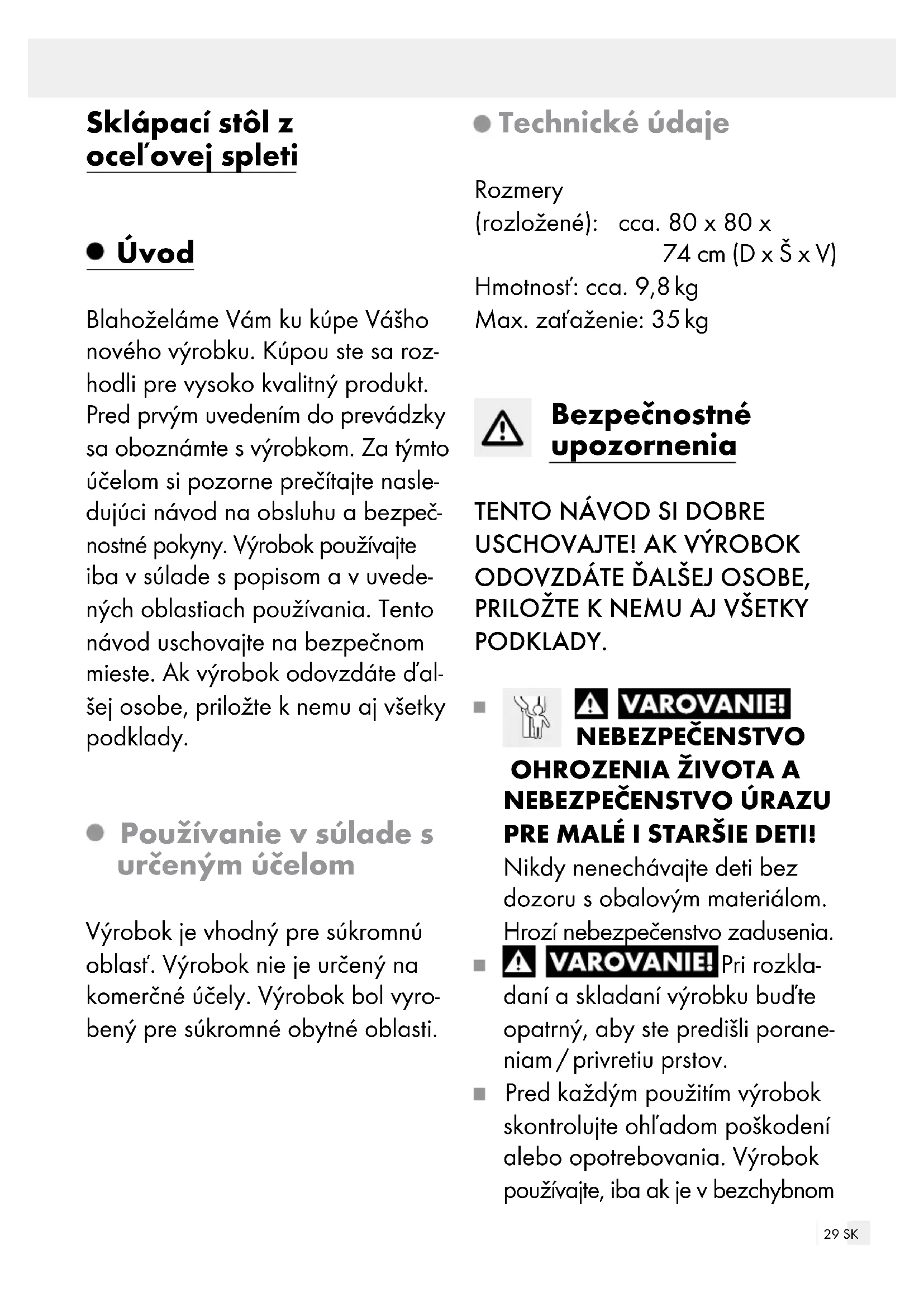 PRE MALÉ I STARŠIE DETI! Nikdy nenechávajte deti bez dozoru s obalovým materiálom. Hrozí nebezpečenstvo zadusenia. Pri rozkla- daní a skladaní výrobku buďte opatrný, aby ste predišli porane- niam / privretiu prstov. Pred každým použitím výrobok skontrolujte ohľadom poškodení alebo opotrebovania. Výrobok používajte, iba ak je v bezchybnom30 SK stave. Výrobok nepoužívajte, ak vidíte alebo predpokladáte akékoľvek poškodenia. Pred používaním skontrolujte správnu stabilitu výrobku. Pred používaním postavte výro- bok na rovný, pevný podklad, inak môže byť nestabilný a pre- vrátiť sa nabok. Môže to viesť k poraneniam alebo k vzniku vec- ných škôd. 35 kg Neprekračujte maximálnu zaťažiteľnosť 35 kg. Prekročenie hmotnostnej hranice môže viesť k poraneniam a/ alebo k vzniku vecných škôd. Zabezpečte, aby sa osoby, najmä deti, nemohli na výrobok postaviť alebo sa naň šplhať. Výrobok by sa mohol prevrátiť. Na výrobok si nikdy nesadajte ani nestavajte. Dbajte na to, aby sa Vaše ruky nedostali do sklápacieho zaria- denia, aby ste predišli porane- niam. Pri rozkladaní dbajte na to, aby vyklápací mechanizmus správne zapadol predtým, ako budete výrobok používať. Dbajte na to, aby bol výrobok pred používaním úplne otvorený. Výrobok nie je hračka a mal by byť používaný iba pod dozorom dospelej osoby. Výrobok nie je určený na lezenie alebo na hranie. Pri extrémnych poveternostných podmienkach, napr. pri silnom vetre, zaistite výrobok. Výrobok nepoužívajte v blízkosti otvoreného ohňa.