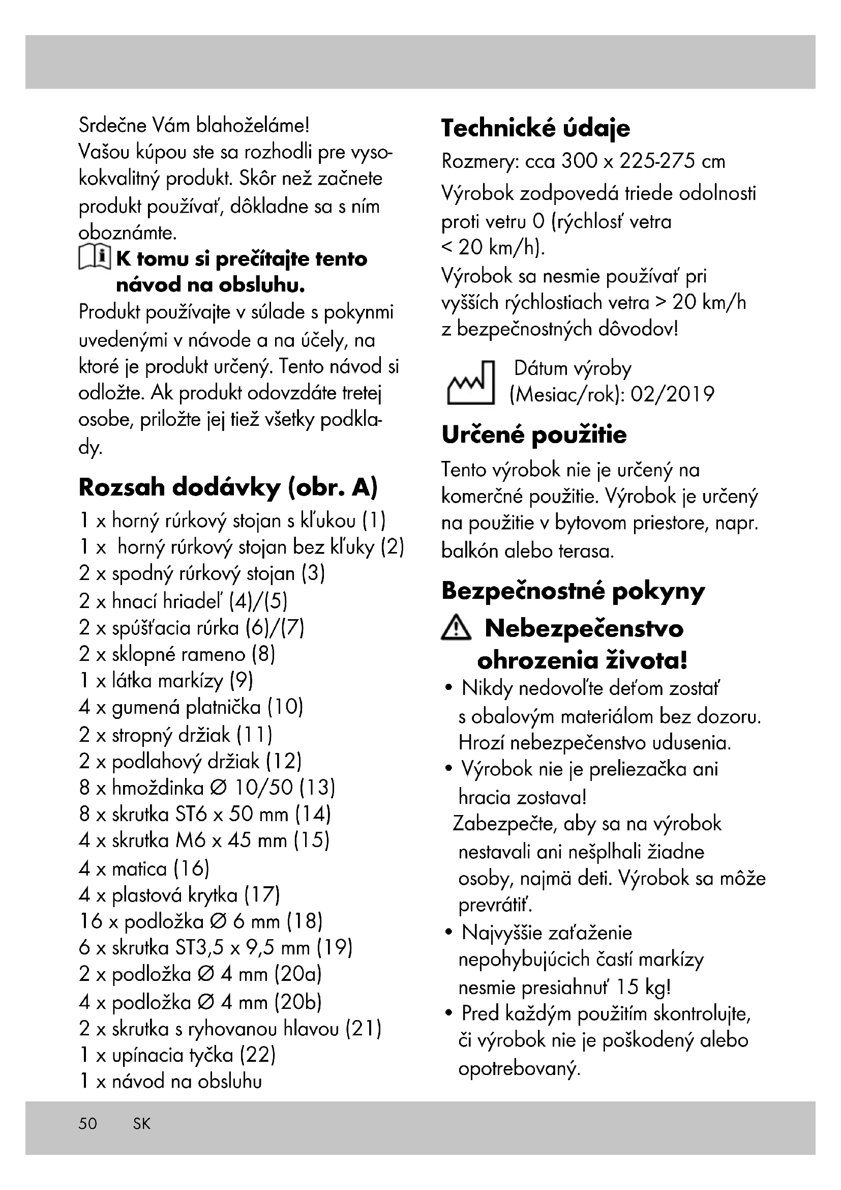 spúšťaciu rúrku (6 + 7) pomocou ryhovanej skrutky s ryhovanou hlavou (21) (obr. S). Použitie Otáčaním kľuky otvorte alebo zatvorte markízu. SK55SK Skladovanie, čistenie Výrobok skladujte vždy na suchom a čistom mieste v temperovanej miestnosti. Čistite iba vodou a následne utrite dosucha čistou handričkou. DÔLEŽITÉ! Nikdy nečistiť drsnými čistiacimi prostriedkami. Pokyny k likvidácii Výrobok a obalový materiál zlikvidujte v súlade s aktuálnymi miestnymi pred- pismi. Obalový materiál, ako napr. fóliové vrecúško nepatrí do rúk detí. Obalový materiál uschovajte mimo dosahu detí. Výrobky a obaly likvidujte ekologickým spôsobom. Recyklačný kód slúži na označenia rôznych materiálov na navrátenie do obehu opätovného využitia. Kód sa skladá z recyklačného symbolu - ktorý má odzrkadľovať zhodnotenie recyklačnýého obehu - a číslo označujúce materiál. Pokyny k záruke a prie- behu servisu Produkt bol vyrobený s maximálnou zodpovednosťou a v priebehu výroby bol neustále kontrolovaný. Na tento produkt máte tri roky záruku od dátu- mu kúpy produktu. Pokladničný lístok si odložte. Záruka sa vzťahuje len na chyby ma- teriálu a výrobné chyby a zaniká pri neodbornej manipulácii s produktom. Záruka nemá vplyv na Vaše zákonné práva, predovšetkým na práva vyplý- vajúce zo záruky. V prípade reklamácie sa obráťte na nižšie uvedenú servisnú linku, alebo nám napíšte e-mail. Naši servisní zamestnanci sa s Vami dohodnú na ďalšom postupe a urýchlene vykona- jú všetky potrebné kroky. V každom prípade Vám poradíme osobne. Záručná lehota sa nepredlžuje v dô- sledku eventuálnych opráv na základe záruky, zákonného plnenia záruky alebo v dôsledku prejavu ochoty. To platí tiež pre vymenené alebo oprave- né diely. Opravy vykonané po uplynutí záruč- nej lehoty sú spoplatnené. IAN: 296717 Servis Slovensko Tel.: 0850 232001 E-Mail: deltasport@lidl.sk56