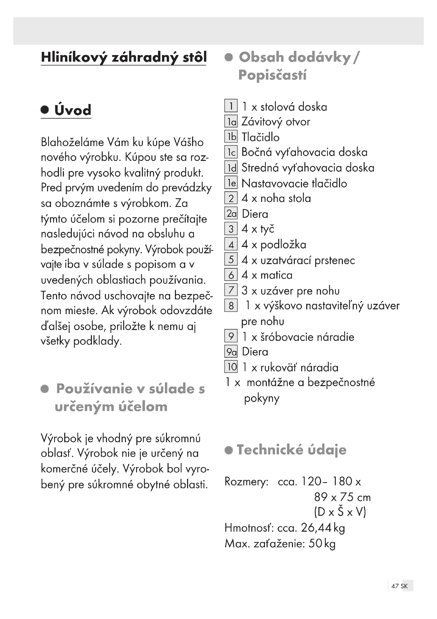 až kým počuteľne nezapadne (obr. J). Čistenie a údržba Výrobok čistite vlhkou handrič-kou a jemným čistiacim prostriedkom. Skôr, ako výrobok znovu zabalíte, nechajte všetky diely dobre oschnúť. Tým zabránite tvorbe plesne, nepríjemných zápachov a zafarbení. Skladovanie Výrobok skladujte v chránenej, suchej miestnosti. Suchý a čistý výrobok skladujte vždy pri izbovej teplote. Likvidácia Obal pozostáva z ekologických materiálov, ktoré môžete odovzdať na miestnych recyklačných zberných miestach. O možnostiach likvidácie opotrebo- vaného výrobku sa môžete informo- vať na Vašej obecnej alebo mestskej správe. 352156_352161_352176_2007_flo_Aluminium_Gartentisch_content_OS.indd 50352156_352161_352176_2007_flo_Aluminium_Gartentisch_content_OS.indd 50 12.08.20 16:2212.08.20 16:2251 SK Záruka Tento výrobok bol dôkladne vyro- bený podľa prísnych akostných smerníc a pred dodaním svedomito testovaný. V prípade nedostatkov tohto výrobku Vám prináležia zá- konné práva voči predajcovi pro- duktu. Tieto zákonné práva nie sú našou nižšie uvedenou zárukou obmedzené. Na tento produkt poskytujeme 3-ročnú záruku od dátumu nákupu. Záručná doba začína plynúť dátu- mom kúpy. Starostlivo si prosím uschovajte originálny pokladničný lístok. Tento doklad je potrebný ako dôkaz o kúpe. Ak sa v rámci 3 rokov od dátumu nákupu tohto výrobku vyskytne chyba materiálu alebo výrobná chyba, výrobok Vám bezplatne opravíme alebo vymeníme – podľa nášho výberu. Táto záruka zaniká, ak bol produkt poškodený, neod- borne po užívaný alebo neodborne udržiavaný. Poskytnutie záruky sa vzťahuje na chyby materiálu a výrobné chyby. Táto záruka sa nevzťahuje na časti produktu, ktoré sú vystavené normálnemu opotrebovaniu, a preto ich je možné považovať za opotrebovateľné diely (napr. baté- rie) alebo na poškodenia na rozbit- ných dieloch, napr. na spínači, akumulátorových batériach alebo častiach, ktoré sú zhotovené zo skla. Postup v prípade poškodenia v záruke Pre zaručenie rýchleho spracovania Vašej požiadavky dodržte prosím nasledujúce pokyny: Pre všetky otázky majte pripravený pokladničný doklad a číslo výrobku (napr. IAN 123456_7890) ako dôkaz o kúpe. Číslo výrobku nájdete na typovom štítku, gravúre, na prednej strane Vášho návodu (dole vľavo) alebo ako nálepku na zadnej alebo spod- nej strane. Ak sa vyskytnú funkčné poruchy alebo iné nedostatky, najskôr tele- fonicky alebo e-mailom kontaktujte následne uvedené servisné oddelenie. Produkt označený ako defektný po- tom môžete s priloženým dokladom o kúpe (pokladničný lístok) a uve- dením, v čom spočíva nedostatok a 352156_352161_352176_2007_flo_Aluminium_Gartentisch_content_OS.indd 51352156_352161_352176_2007_flo_Aluminium_Gartentisch_content_OS.indd 51 12.08.20 16:2212.08.20 16:2252 SK kedy sa vyskytol, bezplatne odo- slať na Vám oznámenú adresu servisného pracoviska. Servis Servis Slovensko Tel.: 0800 008158 E-pošta: owim@lidl.sk 352156_352161_352176_2007_flo_Aluminium_Gartentisch_content_OS.indd 52352156_352161_352176_2007_flo_Aluminium_Gartentisch_content_OS.indd 52 12.08.20 16:2212.08.20 16:2253 ES Introducción ...........................................................................Página 54 Uso adecuado ...........................................................................Página 54 Volumen de suministro / Descripción de los componentes .....Página 54 Características técnicas ............................................................Página 54 Indicaciones sobre seguridad .....................................Página 55 Montaje ....................................................................................Página 56 Extraer el tablero .......................................................................Página 56 Limpieza y conservación ................................................Página 57 Almacenamiento .................................................................Página 57 Eliminación .............................................................................Página 57 Garantía ..................................................................................Página 58 Tramitación de la garantía .......................................................Página 58 Asistencia ...................................................................................Página 59 352156_352161_352176_2007_flo_Aluminium_Gartentisch_content_OS.indd 53352156_352161_352176_2007_flo_Aluminium_Gartentisch_content_OS.indd 53 12.08.20 16:2212.08.20 16:2254 ES Mesa de aluminio para jardín Introducción Enhorabuena por la adquisición de su nuevo producto. Ha elegido un producto de alta calidad. Familiarícese con el producto antes de la primera puesta en funcionamiento. Lea de- tenidamente el siguiente manual de instrucciones y las indicaciones de seguridad. Utilice el producto únicamente como se describe a continuación y para las aplicaciones indicadas. Guarde estas instrucciones en un lugar seguro. En caso de transferir el producto a terceros, entregue también todos los docu- mentos correspondientes. Uso adecuado Este producto está indicado para uso privado. Este producto no está destinado para uso comercial. Este producto ha sido fabricado para el uso en residencias privadas. Volumen de suministro / Descripción de los componentes