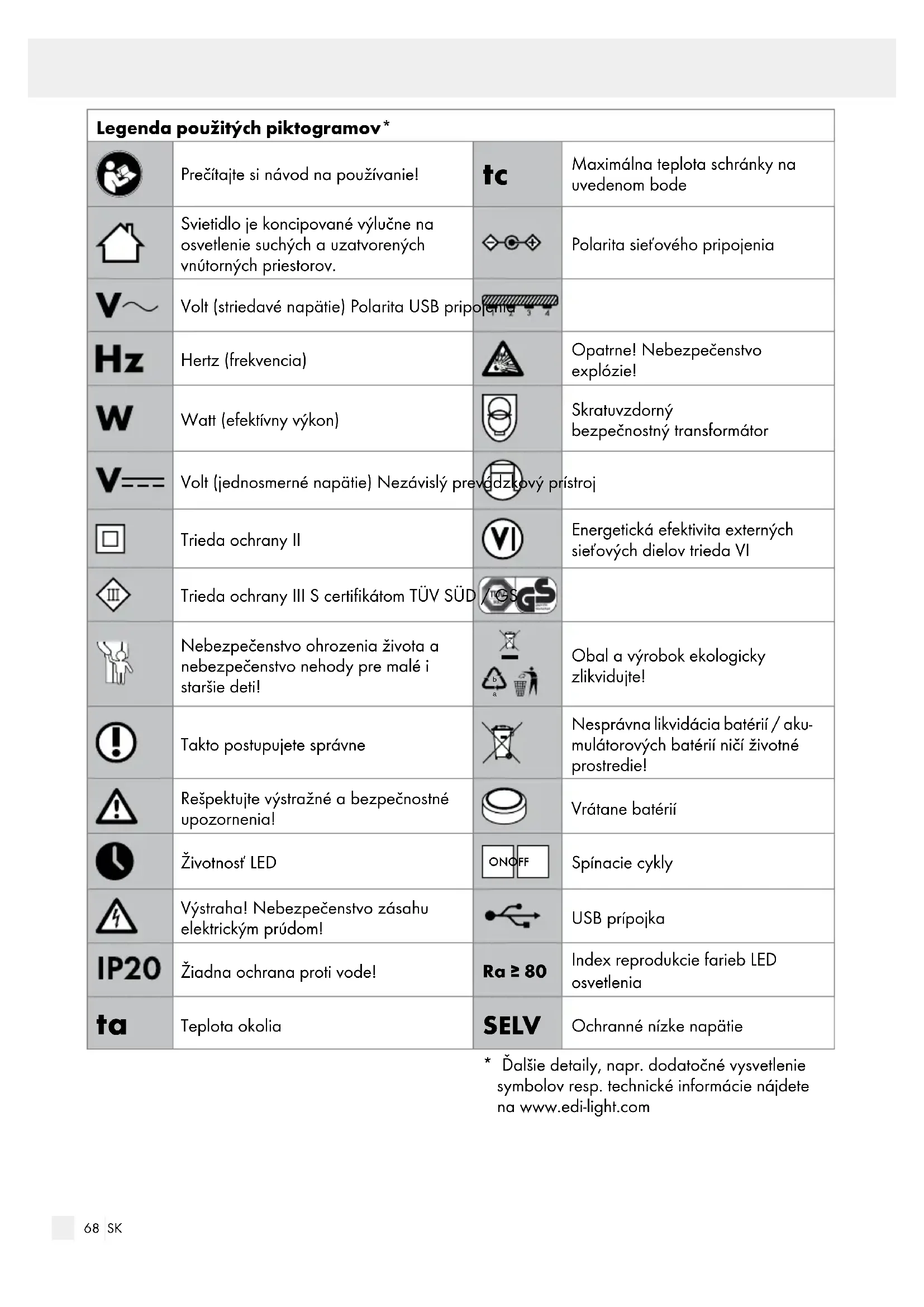 Maximálna teplota schránky na uvedenom bode Svietidlo je koncipované výlučne na osvetlenie suchých a uzatvorených vnútorných priestorov. Polarita sieťového pripojenia Volt (striedavé napätie) Polarita USB pripojenia Hertz (frekvencia) Opatrne! Nebezpečenstvo explózie! Watt (efektívny výkon) Skratuvzdorný bezpečnostný transformátor Volt (jednosmerné napätie) Nezávislý prevádzkový prístroj Trieda ochrany II Energetická efektivita externých sieťových dielov trieda VI Trieda ochrany III S certifikátom TÜV SÜD / GS Nebezpečenstvo ohrozenia života a nebezpečenstvo nehody pre malé i staršie deti!