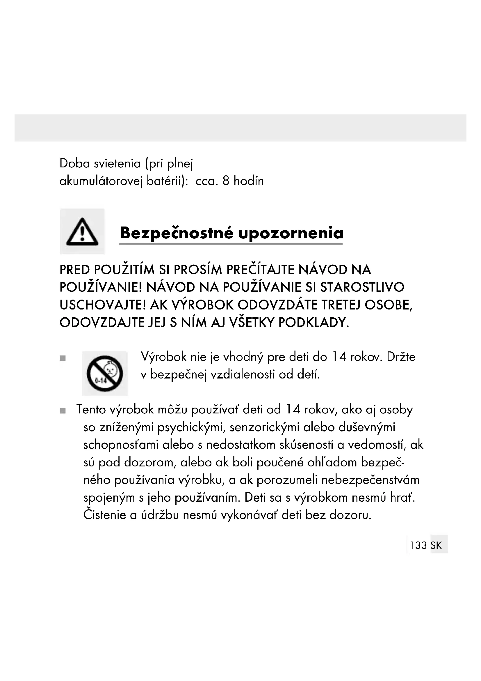 Oheň majáka (HG05660B) Obsah dodávky 1 dekoračné solárne svietidlo s vopred namontovanou akumulátorovou batériou 1 návod na obsluhu Technické údaje Prevádzkové napätie: 1,2 V Akumulátorová batéria: Pre HG05660A / HG05660B: 1 x Ni-MH akumulátorová batéria (AAA / 1,2 V / 600 mAh) Pre HG05660C: 1 x Ni-MH akumulátorová batéria (2/3 AAA / 1,2 V / 300 mAh) LED: 1 x LED Menovitý výkon: 11 mW pre HG05660A 18 mW pre HG05660B 11 mW pre HG05660C Druh ochrany: IP44 (ochrana pred striekajúcou vodou)133 SK Doba svietenia (pri plnej akumulátorovej batérii): cca. 8 hodín Bezpečnostné upozornenia PRED POUŽITÍM SI PROSÍM PREČÍTAJTE NÁVOD NA POUŽÍVANIE! NÁVOD NA POUŽÍVANIE SI STAROSTLIVO USCHOVAJTE! AK VÝROBOK ODOVZDÁTE TRETEJ OSOBE, ODOVZDAJTE JEJ S NÍM AJ VŠETKY PODKLADY. Výrobok nie je vhodný pre deti do 14 rokov. Držte v bezpečnej vzdialenosti od detí. Tento výrobok môžu používať deti od 14 rokov, ako aj osoby so zníženými psychickými, senzorickými alebo duševnými schopnosťami alebo s nedostatkom skúseností a vedomostí, ak sú pod dozorom, alebo ak boli poučené ohľadom bezpeč- ného používania výrobku, a ak porozumeli nebezpečenstvám spojeným s jeho používaním. Deti sa s výrobkom nesmú hrať. Čistenie a údržbu nesmú vykonávať deti bez dozoru.134 SK Výrobok nepoužívajte, ak zistíte akékoľvek poškodenia. Ak výrobok skladujete v tmavom prostredí, vypnite ho, aby ste zabránili vybitiu batérie. Osvetľovací prostriedok nie je možné vymeniť. Ak osvetľovací prostriedok na konci svojej životnosti vypadne, je potrebné vymeniť celý výrobok. Produkt nie je určený na hranie. Bezpečnostné pokyny špecifické pre výrobok Dbajte na to, aby solárny článok nebol znečistený alebo v zimnom období pokrytý snehom a ľadom. Následkom toho sa znižuje výkonnosť solárneho článku. Nízke teploty majú negatívny vplyv na životnosť akumulátoro- vej batérie. Ak produkt dlhší čas nepotrebujete, napr. v zime, mali by ste ho vyčistiť a uskladniť v suchej, teplej miestnosti.135 SK Bezpečnostné upozornenia týkajúce sa batérií / akumulátorových batérií NEBEZPEČENSTVO OHROZENIA ŽIVOTA! Batérie / akumulátorové batérie držte mimo dosahu detí. V prípade prehltnutia okamžite vyhľadajte lekára! Prehltnutie môže mať za následok popáleniny, perforáciu mäkkých tkanív a smrť. Ťažké popáleniny môžu nastať do 2 hodín po prehltnutí. NEBEZPEČENSTVO EXPLÓZIE! Nenabíjateľné batérie nikdy znova nenabíjajte. Batérie / akumulá- torové batérie neskratujte a / alebo neotvárajte. Následkom môže byť prehriatie, požiar alebo explózia. Batérie / akumulátorové batérie nikdy nehádžte do ohňa alebo vody. Nevystavujte batérie / akumulátorové batérie mechanickej záťaži.136 SK Riziko vytečenia batérií / akumulátorových batérií Batérie / akumulátorové batérie nikdy nevystavujte extrémnym podmienkam a teplotám, ktoré by na ne mohli pôsobiť, napr. na vykurovacích telesách / priamom slnečnom žiarení. Ak batérie / akumulátorové batérie vytiekli, zabráňte kontaktu pokožky, očí a slizníc s chemikáliami! Ihneď vypláchnite po- stihnuté miesta väčším množstvom čistej vody a okamžite vyhľadajte lekára! NOSTE OCHRANNÉ RUKAVICE! Vytečené alebo poškodené batérie / akumulátorové batérie môžu pri kontakte s pokožkou spôsobiť poleptanie. V takom prípade preto noste vhodné ochranné rukavice. V prípade vytečenia batérií / akumulátorových batérií ich ihneď vyberte z výrobku, aby ste predišli vzniku škôd. Používajte iba batérie / akumulátorové batérie rovnakého typu. Nekombinujte staré batérie / akumulátorové batérie s novými! Ak produkt dlhší čas nepoužívate, vyberte z neho batérie / akumulátorové batérie.137 SK Riziko poškodenia produktu Používajte výhradne uvedený typ batérií / akumulátorových batérií! Vložte batérie / akumulátorové batérie podľa označenia pola- rity (+) a (-) na batérii / akumulátorovej batérii a výrobku. Pred vložením očistite kontakty na batérii / akumulátorovej batérii a v priečinku pre batériu suchou handričkou, ktorá nepúšťa vlákna, alebo vatovou tyčinkou! Vybité batérie / akumulátorové batérie ihneď vyberte z produktu. Spôsob činnosti Zabudovaný solárny článok výrobku premieňa pri slnečnom žiarení svetlo na elektrickú energiu a ukladá ju v Ni-MH akumulátorovej ba- térii. Zapnite výrobok pomocou tlačidla ZA- / VYPNÚŤ (HG05660A) / ZA- / VYPÍNAČA (HG05660B / HG05660C)