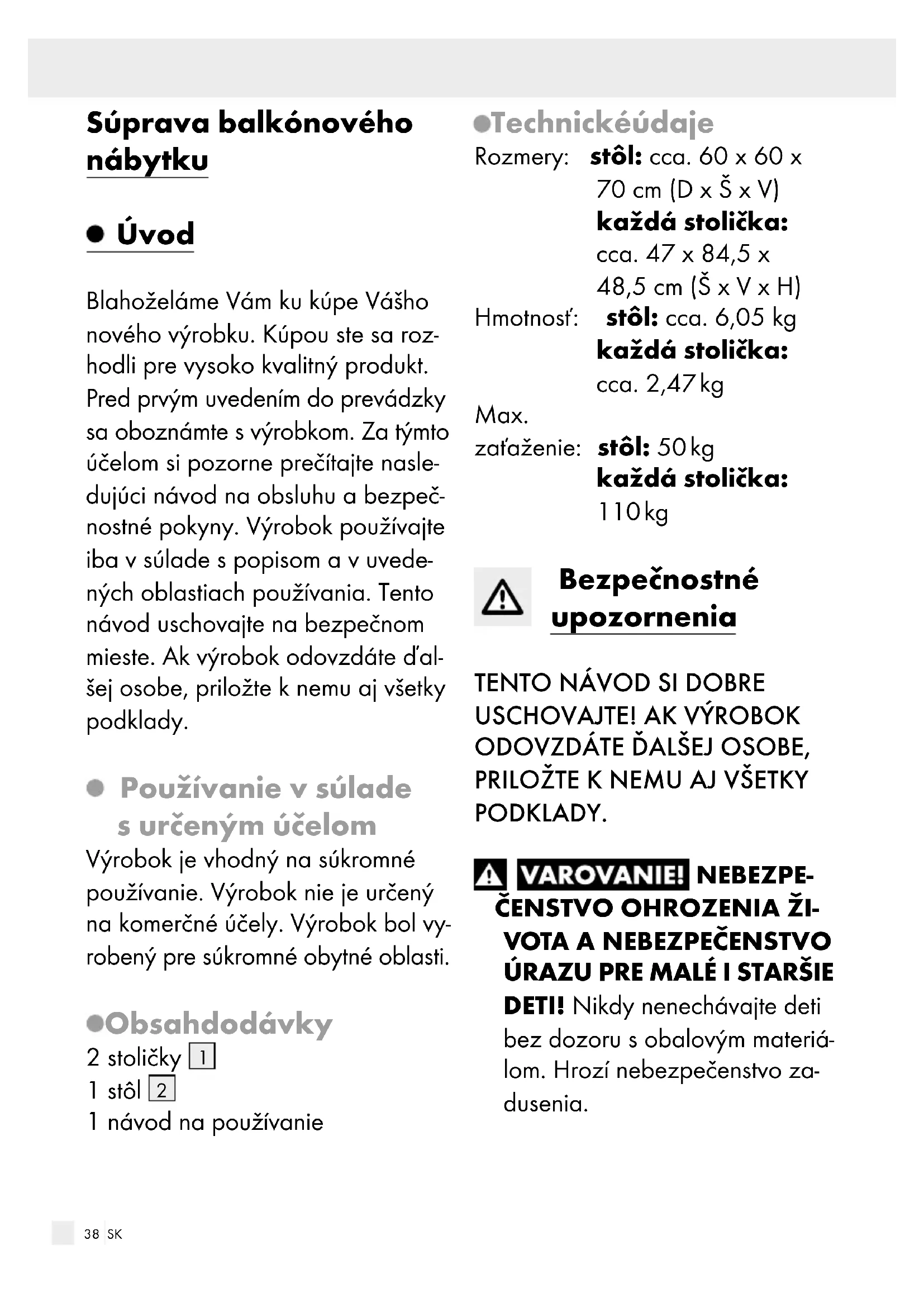 iam alebo k vzniku vecných šk ôd. Dbajte na to, aby bol produkt pred používaním úplne otvorený. Výrobok nie je hračka a smie byť používaný iba pod dozorom dospelej osoby. Pred každým použitím výrobok skontrolujte ohľadom poškodení alebo opotrebovania. Výrobok používajte, iba ak je v bezchyb- nom stave. Výrobok nepoužívajte, ak vidíte alebo predpokladáte akékoľvek poškodenia. Max. 110 kg/ 50 kg Neprekračujte maxim álnu zaťažiteľnosť 110 kg na každú stoličku a 50 kg na každý stôl. Keď je hranica zaťažiteľnosti prekročená, môže to viesť k poraneniam a / alebo vzniku vecných škôd. Nízka hmotnosť a jednoduchá montáž stola majú za následok, že stôl nie je tak stabilný ako bežné stoly. Nezaťažujte stôl záťažou nad 50 kg a zabráňte jednostrannému zaťaženiu. Výrobok nie je určený na leze- nie alebo na hranie! Zabezpečte, aby sa osoby, najmä deti, nemohli postaviť na výrobok, resp. sa naň šplhať. Výrobok sa môže prevrátiť. Používajte výrobok iba na určený účel. Na stôl si nesadajte ani nestavajte. Nestúpajte na stoličky. Nikdy si nesadajte na chrbtovú opierku stoličiek. Stoličky smie vždy používať iba jedna osoba. Nepoužívajte výrobok v blízkosti otvoreného ohňa. Pred používaním dbajte na to, aby blokovací mechanizmus zapadol.