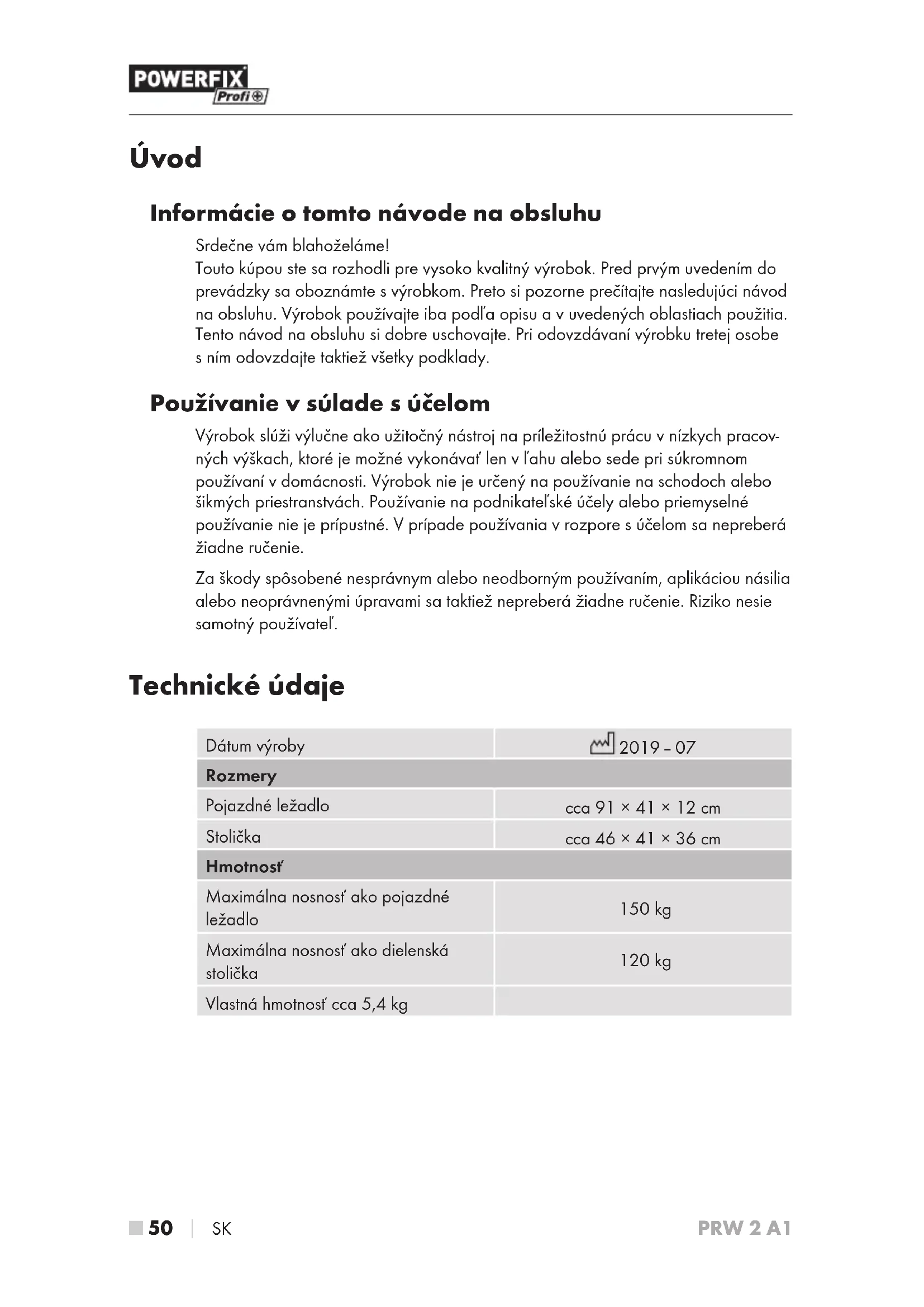SK PRW 2 A1 Úvod Informácie o tomto návode na obsluhu Srdečne vám blahoželáme! Touto kúpou ste sa rozhodli pre vysoko kvalitný výrobok. Pred prvým uvedením do prevádzky sa oboznámte svýrobkom. Preto si pozorne prečítajte nasledujúci návod na obsluhu. Výrobok používajte iba podľa opisu a vuvedených oblastiach použitia. Tento návod naobsluhu si dobre uschovajte. Pri odovzdávaní výrobku tretej osobe sním odovzdajte taktiež všetky podklady. Používanie v súlade s účelom Výrobok slúži výlučne ako užitočný nástroj na príležitostnú prácu v nízkych pracov- ných výškach, ktoré je možné vykonávať len v ľahu alebo sede pri súkromnom používaní v domácnosti. Výrobok nie je určený na používanie na schodoch alebo šikmých priestranstvách. Používanie na podnikateľské účely alebo priemyselné používanie nie je prípustné. V prípade používania vrozpore súčelom sa nepreberá žiadne ručenie. Za škody spôsobené nesprávnym alebo neodborným používaním, aplikáciou násilia alebo neoprávnenými úpravami sa taktiež nepreberá žiadne ručenie. Riziko nesie samotný používateľ. Technické údaje Dátum výroby 2019 – 07 Rozmery Pojazdné ležadlo cca91× 41× 12cm Stolička cca46× 41× 36cm Hmotnosť Maximálna nosnosť ako pojazdné ležadlo 150 kg Maximálna nosnosť ako dielenská stolička 120 kg Vlastná hmotnosť cca 5,4 kgSK