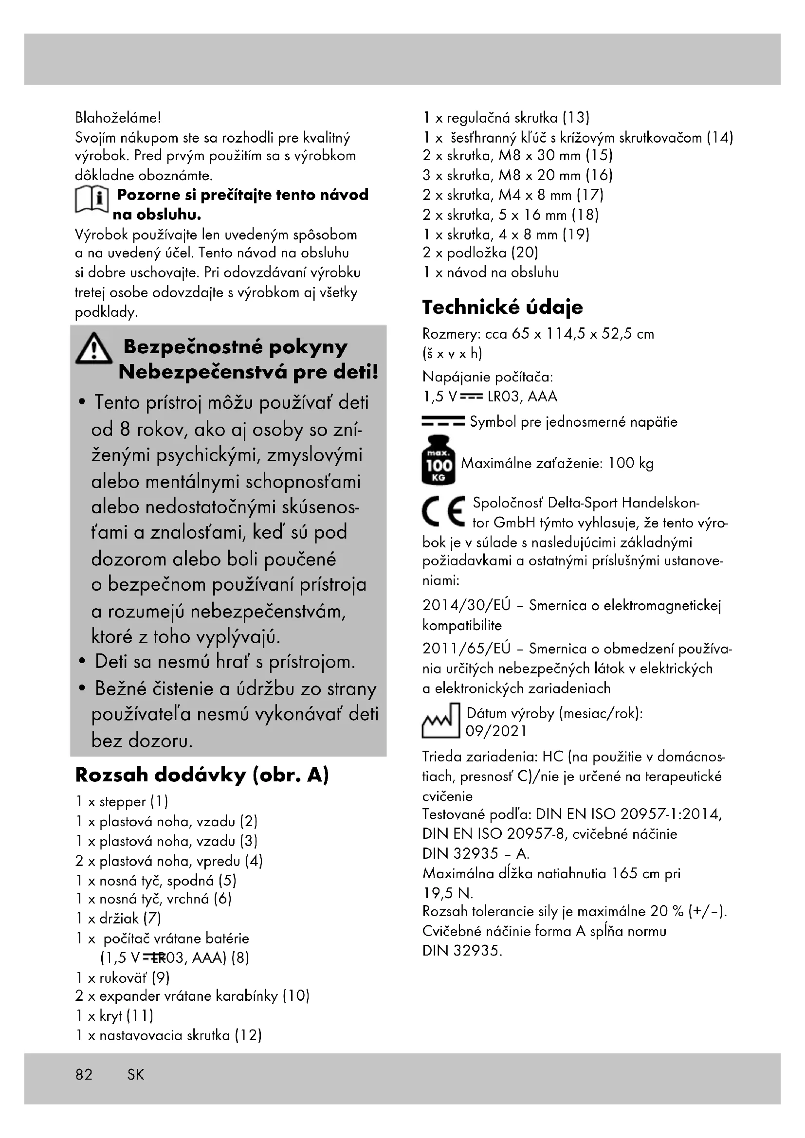 - Bežné čistenie a údržbu zo strany používateľa nesmú vykonávať deti bez dozoru. Rozsah dodávky (obr. A) 1 x stepper (1) 1 x plastová noha, vzadu (2) 1 x plastová noha, vzadu (3) 2 x plastová noha, vpredu (4) 1 x nosná tyč, spodná (5) 1 x nosná tyč, vrchná (6) 1 x držiak (7) 1 x počítač vrátane batérie (1,5 V LR03, AAA) (8) 1 x rukoväť (9) 2 x expander vrátane karabínky (10) 1 x kryt (11) 1 x nastavovacia skrutka (12) 1 x regulačná skrutka (13) 1 x šesťhranný kľúč s krížovým skrutkovačom (14) 2 x skrutka, M8 x 30 mm (15) 3 x skrutka, M8 x 20 mm (16) 2 x skrutka, M4 x 8 mm (17) 2 x skrutka, 5 x 16 mm (18) 1 x skrutka, 4 x 8 mm (19) 2 x podložka (20) 1 x návod na obsluhu Technické údaje Rozmery: cca 65 x 114,5 x 52,5 cm (š x v x h) Napájanie počítača: 1,5 V LR03, AAA Symbol pre jednosmerné napätie Maximálne zaťaženie: 100 kg Spoločnosť Delta-Sport Handelskon- tor GmbH týmto vyhlasuje, že tento výro- bok je v súlade s nasledujúcimi základnými požiadavkami a ostatnými príslušnými ustanove- niami: 2014/30/EÚ – Smernica o elektromagnetickej kompatibilite 2011/65/EÚ – Smernica o obmedzení používa- nia určitých nebezpečných látok v elektrických a elektronických zariadeniach Dátum výroby (mesiac/rok): 09/2021 Trieda zariadenia: HC (na použitie v domácnos- tiach, presnosť C)/nie je určené na terapeutické cvičenie Testované podľa: DIN EN ISO 20957-1:2014, DIN EN ISO 20957-8, cvičebné náčinie DIN 32935 – A. Maximálna dĺžka natiahnutia 165 cm pri 19,5 N. Rozsah tolerancie sily je maximálne 20 % (+/–). Cvičebné náčinie forma A spĺňa normu DIN 32935. SK83 Pohyb pomocou krokov Pri cvičení na tomto stepperi ide o podmienený pohyb pomocou krokov. Systém brzdného odporu Pri tomto stepperi ide o systém závislý od rýchlosti. Určené použitie Výrobok je vhodný výlučne ako zariadenie na cvičenie. Výrobok je určený na domáce použí- vanie a nie je vhodný na medicínske a komerčné účely. Výrobok je vhodný na použitie v interiéri. Bezpečnostné pokyny Všeobecné riziko
