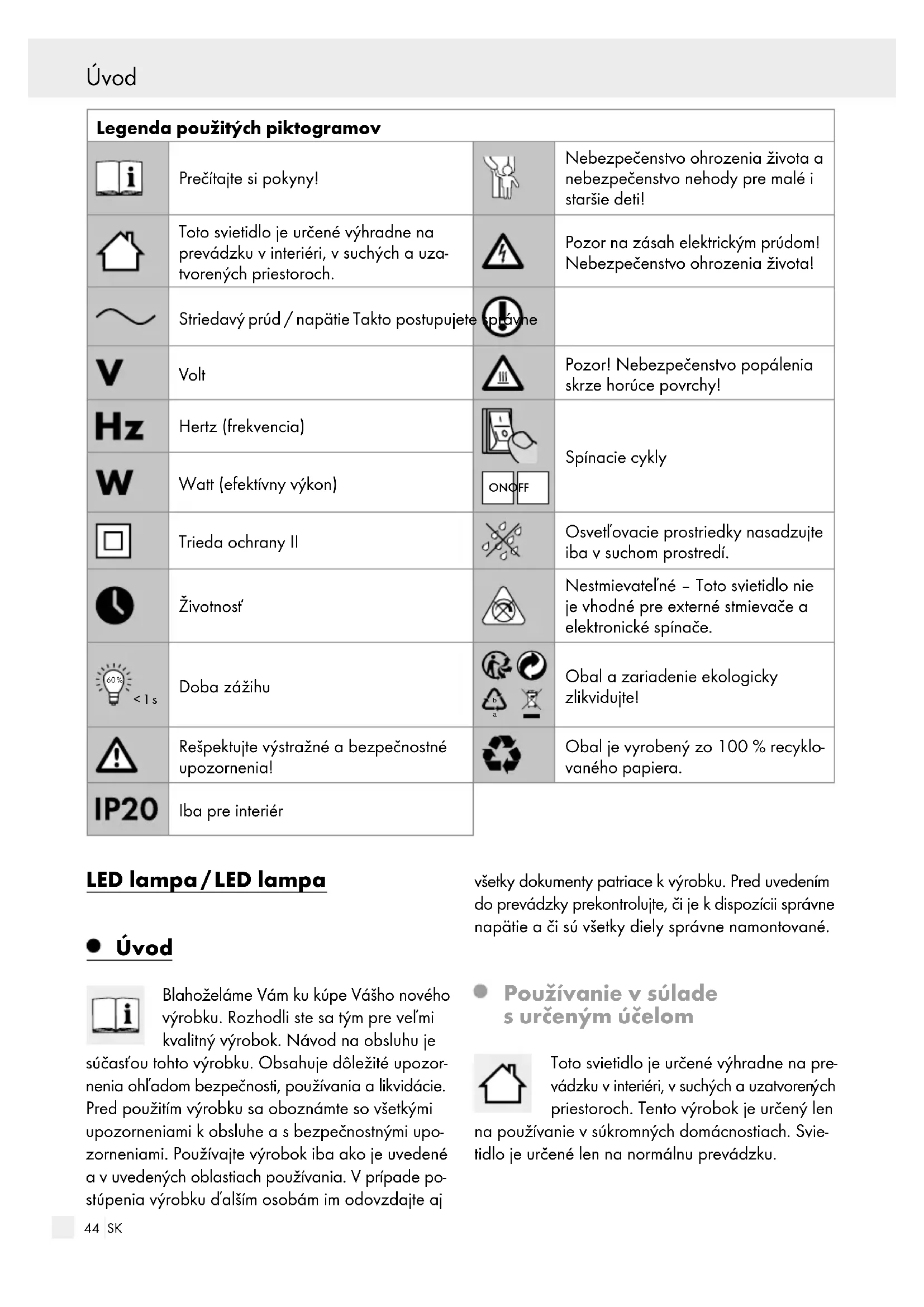 Obal a zariadenie ekologicky zlikvidujte! Rešpektujte výstražné a bezpečnostné upozornenia! Obal je vyrobený zo 100 % recyklo- vaného papiera. Iba pre interiér LED lampa / LED lampa Úvod Blahoželáme Vám ku kúpe Vášho nového výrobku. Rozhodli ste sa tým pre veľmi kvalitný výrobok. Návod na obsluhu je súčasťou tohto výrobku. Obsahuje dôležité upozor- nenia ohľadom bezpečnosti, používania a likvidácie. Pred použitím výrobku sa oboznámte so všetkými upozorneniami k obsluhe a s bezpečnostnými upo- zorneniami. Používajte výrobok iba ako je uvedené a v uvedených oblastiach používania. V prípade po- stúpenia výrobku ďalším osobám im odovzdajte aj všetky dokumenty patriace k výrobku. Pred uvedením do prevádzky prekontrolujte, či je k dispozícii správne napätie a či sú všetky diely správne namontované. Používanie v súlade s určeným účelom Toto svietidlo je určené výhradne na pre- vádzku v interiéri, v suchých a uzatvoren ých priestoroch. Tento výrobok je určený len na používanie v súkromných domácnostiach. Svie- tidlo je určené len na normálnu prevádzku. Úvod / Bezpečnosť45 SK Úvod Úvod / Bezpečnosť Obsah dodávky Bezprostredne po vybalení vždy skontrolujte úplnosť dodávky ako aj bezchybný stav zariadenia. 1 upínacie / stolové svietidlo, model 14150905L / 14151005L / 14151105L 1 LED COG osvetľovací prostriedok, 1 podložka pre ochranu nábytku (14151005L / 14151105L) 1 závažie (14151005L / 14151105L) 1 podložná doska (14151005L / 14151105L) 1 podložka pod maticu (14151005L / 14151105L) 1 krídlová matica (14151005L / 114151105L) 1 návod na montáž a používanie Popis častí