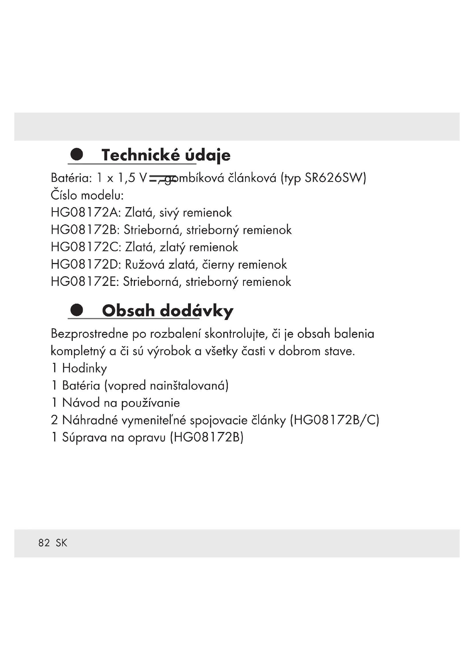 Segment (pre model HG08172B, C)82 SK Technické údaje Batéria: 1 x 1,5 V , gombíková článková (typ SR626SW) Číslo modelu: HG08172A: Zlatá, sivý remienok HG08172B: Strieborná, strieborný remienok HG08172C: Zlatá, zlatý remienok HG08172D: Ružová zlatá, čierny remienok HG08172E: Strieborná, strieborný remienok Obsah dodávky Bezprostredne po rozbalení skontrolujte, či je obsah balenia kompletný a či sú výrobok a všetky časti v dobrom stave. 1 Hodinky 1 Batéria (vopred nainštalovaná) 1 Návod na používanie 2 Náhradné vymeniteľné spojovacie články (HG08172B/C) 1 Súprava na opravu (HG08172B)83 SK Nastavenie času