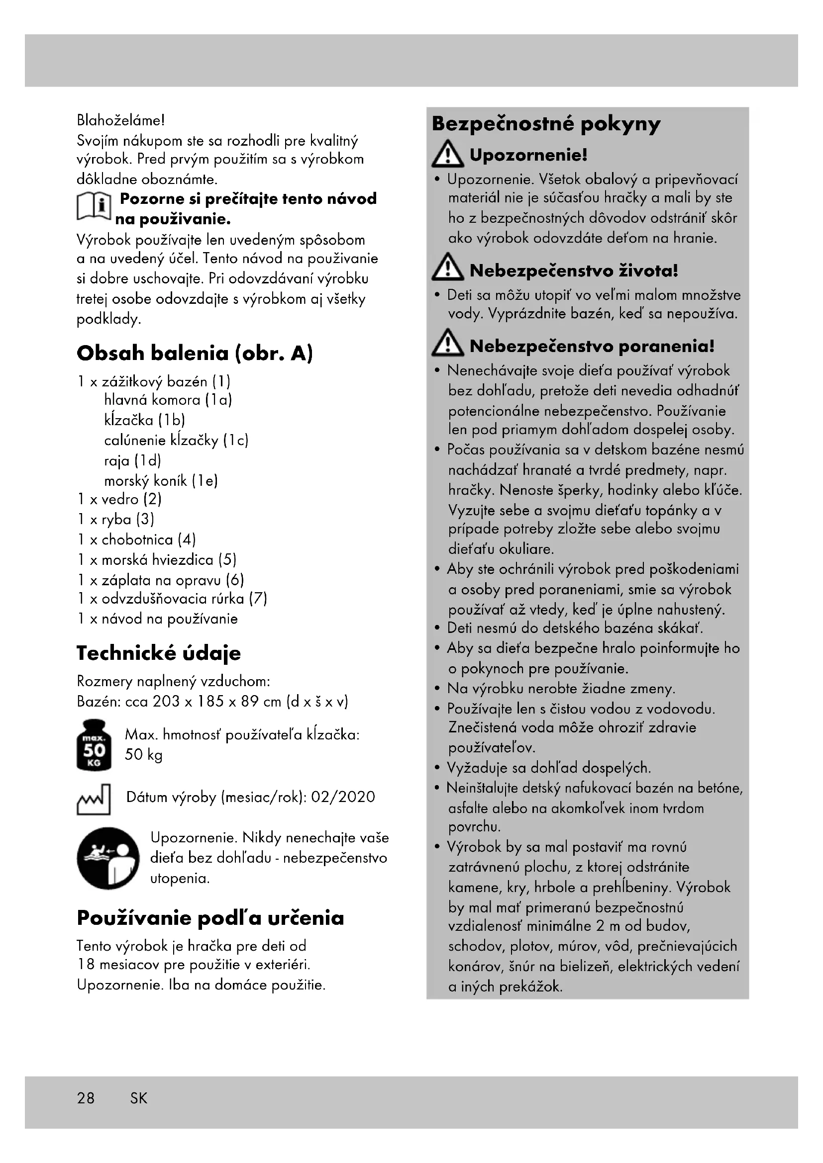 - Počas používania sa v detskom bazéne nesmú nachádzať hranaté a tvrdé predmety, napr. hračky. Nenoste šperky, hodinky alebo kľúče. Vyzujte sebe a svojmu dieťaťu topánky a v prípade potreby zložte sebe alebo svojmu dieťaťu okuliare.