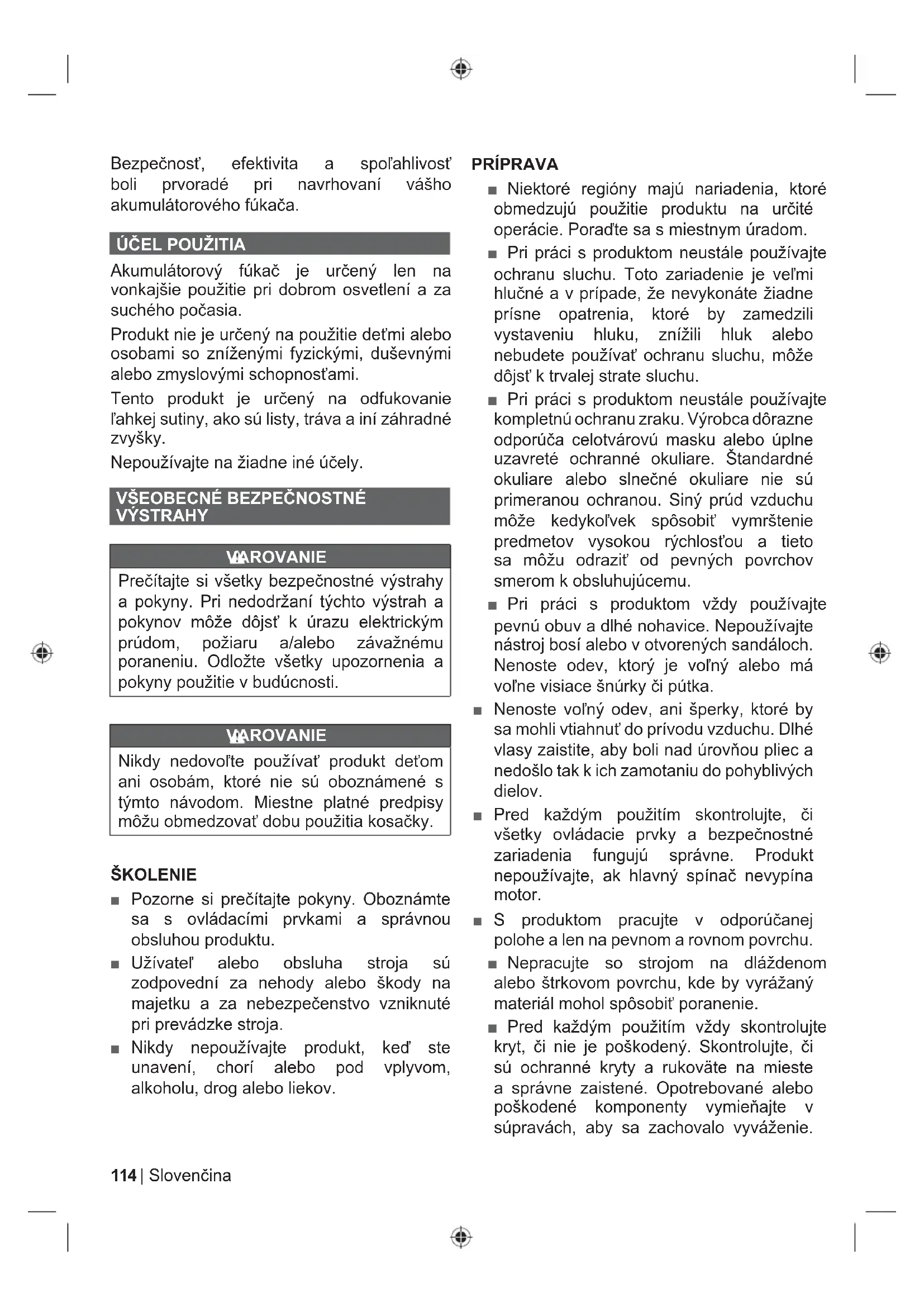 VÝSTRAHY VAROVANIE Prečítajte si všetky bezpečnostné výstrahy a pokyny. Pri nedodržaní týchto výstrah a pokynov môže dôjsť k úrazu elektrickým prúdom, požiaru a/alebo závažnému poraneniu. Odložte všetky upozornenia a pokyny použitie v budúcnosti. VAROVANIE Nikdy nedovoľte používať produkt deťom ani osobám, ktoré nie sú oboznámené s týmto návodom. Miestne platné predpisy môžu obmedzovať dobu použitia kosačky. ŠKOLENIE ■ Pozorne si prečítajte pokyny. Oboznámte sa s ovládacími prvkami a správnou obsluhou produktu. ■ Užívateľ alebo obsluha stroja sú zodpovední za nehody alebo škody na majetku a za nebezpečenstvo vzniknuté pri prevádzke stroja. ■ Nikdy nepoužívajte produkt, keď ste unavení, chorí alebo pod vplyvom, alkoholu, drog alebo liekov. PRÍPRAVA ■ Niektoré regióny majú nariadenia, ktoré obmedzujú použitie produktu na určité operácie. Poraďte sa s miestnym úradom. ■ Pri práci s produktom neustále používajte ochranu sluchu. Toto zariadenie je veľmi hlučné a v prípade, že nevykonáte žiadne prísne opatrenia, ktoré by zamedzili vystaveniu hluku, znížili hluk alebo nebudete používať ochranu sluchu, môže dôjsť k trvalej strate sluchu. ■ Pri práci s produktom neustále používajte kompletnú ochranu zraku. Výrobca dôrazne odporúča celotvárovú masku alebo úplne uzavreté ochranné okuliare. Štandardné okuliare alebo slnečné okuliare nie sú primeranou ochranou. Siný prúd vzduchu môže kedykoľvek spôsobiť vymrštenie predmetov vysokou rýchlosťou a tieto sa môžu odraziť od pevných povrchov smerom k obsluhujúcemu. ■ Pri práci s produktom vždy používajte pevnú obuv a dlhé nohavice. Nepoužívajte nástroj bosí alebo v otvorených sandáloch. Nenoste odev, ktorý je voľný alebo má voľne visiace šnúrky či pútka. ■ Nenoste voľný odev, ani šperky, ktoré by sa mohli vtiahnuť do prívodu vzduchu. Dlhé vlasy zaistite, aby boli nad úrovňou pliec a nedošlo tak k ich zamotaniu do pohyblivých dielov. ■ Pred každým použitím skontrolujte, či všetky ovládacie prvky a bezpečnostné zariadenia fungujú správne. Produkt nepoužívajte, ak hlavný spínač nevypína motor. ■ S produktom pracujte v odporúčanej polohe a len na pevnom a rovnom povrchu. ■ Nepracujte so strojom na dláždenom alebo štrkovom povrchu, kde by vyrážaný materiál mohol spôsobiť poranenie. ■ Pred každým použitím vždy skontrolujte kryt, či nie je poškodený. Skontrolujte, či sú ochranné kryty a rukoväte na mieste a správne zaistené. Opotrebované alebo poškodené komponenty vymieňajte v súpravách, aby sa zachovalo vyváženie.115 Slovenčina |