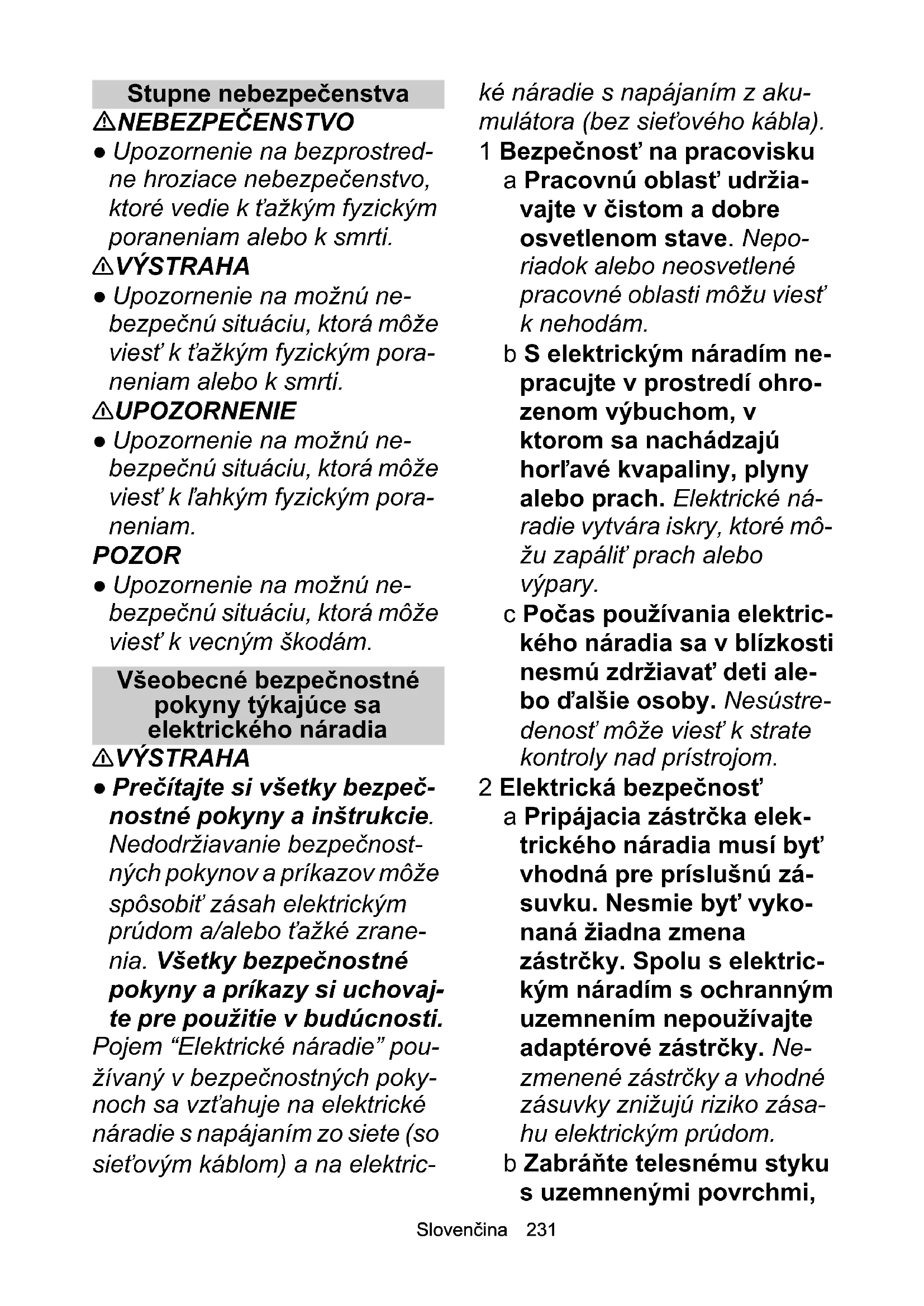- EÚ vyhlásenie o zhode Slovenčina 231 Stupne nebezpečenstva NEBEZPEČENSTVO ● Upozornenie na bezprostred- ne hroziace nebezpečenstvo, ktoré vedie k ťažkým fyzickým poraneniam alebo k smrti. 몇 VÝSTRAHA ● Upozornenie na možnú ne- bezpečnú situáciu, ktorá môže viesť k ťažkým fyzickým pora- neniam alebo k smrti. 몇 UPOZORNENIE ● Upozornenie na možnú ne- bezpečnú situáciu, ktorá môže viesť k ľahkým fyzickým pora- neniam. POZOR ● Upozornenie na možnú ne- bezpečnú situáciu, ktorá môže viesť k vecným škodám. Všeobecné bezpečnostné pokyny týkajúce sa elektrického náradia 몇 VÝSTRAHA ● Prečítajte si všetky bezpeč- nostné pokyny a inštrukcie. Nedodržiavanie bezpečnost- ných pokynov a príkazov môže spôsobiť zásah elektrickým prúdom a/alebo ťažké zrane- nia. Všetky bezpečnostné pokyny a príkazy si uchovaj- te pre použitie v budúcnosti. Pojem “Elektrické náradie” pou- žívaný v bezpečnostných poky- noch sa vzťahuje na elektrické náradie s napájaním zo siete (so sieťovým káblom) a na elektric- ké náradie s napájaním z aku- mulátora (bez sieťového kábla). 1 Bezpečnosť na pracovisku a Pracovnú oblasť udržia- vajte v čistom a dobre osvetlenom stave. Nepo- riadok alebo neosvetlené pracovné oblasti môžu viesť k nehodám. b S elektrickým náradím ne- pracujte v prostredí ohro- zenom výbuchom, v ktorom sa nachádzajú horľavé kvapaliny, plyny alebo prach. Elektrické ná- radie vytvára iskry, ktoré mô- žu zapáliť prach alebo výpary. c Počas používania elektric- kého náradia sa v blízkosti nesmú zdržiavať deti ale- bo ďalšie osoby. Nesústre- denosť môže viesť k strate kontroly nad prístrojom. 2 Elektrická bezpečnosť a Pripájacia zástrčka elek- trického náradia musí byť vhodná pre príslušnú zá- suvku. Nesmie byť vyko- naná žiadna zmena zástrčky. Spolu s elektric- kým náradím s ochranným uzemnením nepoužívajte adaptérové zástrčky. Ne- zmenené zástrčky a vhodné zásuvky znižujú riziko zása- hu elektrickým prúdom. b Zabráňte telesnému styku s uzemnenými povrchmi,232 Slovenčina akými sú rúry, vykurova- cieho telesá, sporáky a chladničky. Ak je vaše telo uzemnené, tak hrozí zvýše- né riziko zásahu elektrickým prúdom. c Elektrické náradie chráňte pred dažďom a vlhkosťou. Vniknutie vody do elektrické- ho náradia zvyšuje riziko zá- sahu elektrickým prúdom. d Kábel nepoužívajte v roz- pore s jeho účelom, naprí- klad na nosenie elektrického náradia, jeho zavesenie alebo na vytiah- nutie zástrčky zo zásuvky. Kábel chráňte pred nad- merným teplom, olejom, ostrými hranami alebo po- hybujúcimi sa časťami prí- stroja. Poškodené alebo zapletené pripájacie káble zvyšujú riziko zásahu elek- trickým prúdom. e Ak s elektrickým náradím pracujete vonku, tak pou- žívajte len predlžovacie káble, ktoré sú vhodné aj na používanie v exteriéri. Používanie predlžovacieho kábla vhodného pre exteriér znižuje riziko zásahu elek- trickým prúdom. f Ak nie je možné zabrániť použitiu elektrického ná- radia vo vlhkom prostredí, tak použite prúdový chrá- nič. Používanie prúdového chrániča znižuje riziko zása- hu elektrickým prúdom. 3 Bezpečnosť osôb a Buďte pozorní, dávajte po- zor na to, čo robíte, a pri práci s elektrickým nára- dím postupujte s rozva- hou. Elektrické náradie nepoužívajte, ak ste una- vení alebo pod vplyvom drog, alkoholu alebo lie- kov. Moment nepozornosti pri používaní elektrického náradia môže viesť k vzniku vážnych zranení. b Používajte osobné ochranné prostriedky a vždy noste ochranné oku- liare. Používanie osobných ochranných prostriedkov, akými sú protiprachová maska, protišmyková bez- pečnostná obuv, ochranná prilba alebo ochrana sluchu (v závislosti od typu a použi- tia elektrického náradia), znižuje riziko vzniku zranení. c Zabráňte neúmyselnému uvedeniu do prevádzky. Pred pripojením elektric- kého náradia k napájaniu prúdom a/alebo k akumu- látoru a pred jeho zdvihnu- tím alebo nesením sa ubezpečte, že elektrické náradie je vypnuté. Ak má- te pri nesení elektrického náradia prst na spínači ale- bo prístroj pripojíte k napája-Slovenčina 233 niu prúdom v zapnutom stave, môže to viesť k neho- dám. d Pred zapnutím elektrické- ho náradia odstráňte na- stavovacie nástroje alebo skrutkový kľúč. Nástroj alebo kľúč, ktorý sa nachá- dza v rotujúcej časti prístro- ja, môže viesť k vzniku zranení. e Zabráňte abnormálnemu držaniu tela. Zaistite stabi- litu a neustále udržiavajte rovnováhu. Vďaka tomu budete môcť v neočakáva- ných situáciách lepšie kon- trolovať elektrické náradie. f Noste vhodný odev. Ne- noste voľný odev alebo šperky. Vlasy, odev a ruka- vice sa nesmú dostať do blízkosti pohybujúcich sa dielov. Pohybujúce sa diely môžu zachytiť voľný odev, rukavice, šperky alebo dlhé vlasy. g Ak je možné namontovať zariadenie na odsávanie resp. zachytávanie pra- chu, tak sa uistite, že také- to zariadenie je pripojené a správne používané. Pou- žitie odsávania prachu môže znížiť ohrozenie prachom. 4 Používanie elektrického ná- radia a zaobchádzanie s ním a Prístroj nepreťažujte. Pre svoju prácu vždy použite elektrické náradie určené na príslušný účel. S vhod- ným elektrickým náradím pracujete lepšie a bezpeč- nejšie v uvedenom rozsahu výkonu. b Nepoužívajte elektrické náradie, ktoré má poško- dený spínač. Elektrické ná- radie, ktoré už nie je možné zapnúť alebo vypnúť, je ne- bezpečné a je nutné ho opraviť. c Pred nastavovaním prí- stroja, výmenou dielov prí- slušenstva alebo odložením prístroja vy- tiahnite zástrčku zo zásuv- ky a/alebo odstráňte akumulátor. Toto preventív- ne opatrenie zabraňuje