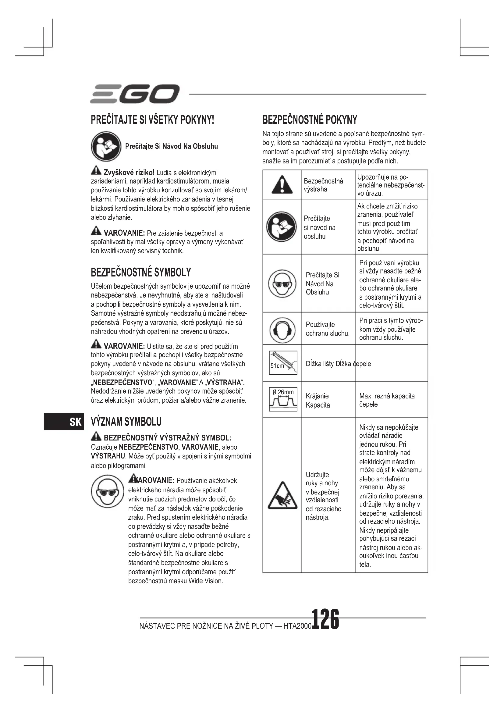 Na tejto strane sú uvedené a popísané bezpečnostné sym- boly, ktoré sa nachádzajú na výrobku. Predtým, než budete montovať a používať stroj, si prečítajte všetky pokyny, snažte sa im porozumieť a postupujte podľa nich. Bezpečnostná výstraha Upozorňuje na po- tenciálne nebezpečenst- vo úrazu. Prečítajte si návod na obsluhu Ak chcete znížiť riziko zranenia, používateľ musí pred použitím tohto výrobku prečítať a pochopiť návod na obsluhu. Prečítajte Si Návod Na Obsluhu Pri používaní výrobku si vždy nasaďte bežné ochranné okuliare ale- bo ochranné okuliare s postrannými krytmi a celo-tvárový štít. Používajte ochranu sluchu. Pri práci s týmto výrob- kom vždy používajte ochranu sluchu. 51cm Dĺžka lišty Dĺžka čepele Ø 26mm Krájanie Kapacita Max. rezná kapacita čepele Udržujte ruky a nohy v bezpečnej vzdialenosti od rezacieho nástroja. Nikdy sa nepokúšajte ovládať náradie jednou rukou. Pri strate kontroly nad elektrickým náradím môže dôjsť k vážnemu alebo smrteľnému zraneniu. Aby sa znížilo riziko porezania, udržujte ruky a nohy v bezpečnej vzdialenosti od rezacieho nástroja. Nikdy nepripájajte pohybujúci sa rezací nástroj rukou alebo ak- oukoľvek inou časťou tela.NÁSTAVEC PRE NOŽNICE NA ŽIVÉ PLOTY — HTA2000 127
