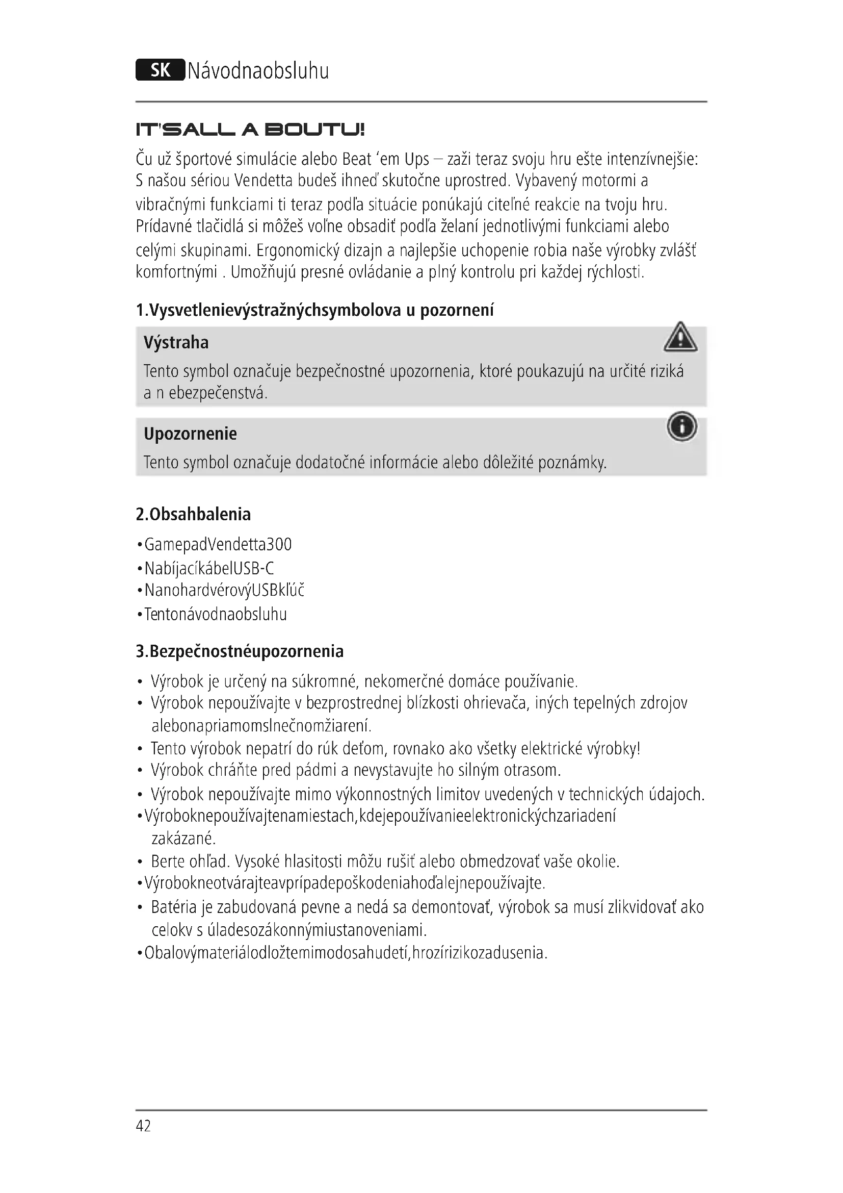 Tímto Hama GmbH &CoKGprohlašuje, že typ rádiového zařízení [00186075] je vsouladu se směrnicí 2014/53/EU.Úplné znění EU prohlášení oshodě je kdispozici na této internetové adrese: www.hama.com->00186075->Downloads. Kmitočtové pásmo/kmitočtová pásma 2400 -2483 MHz Maximální radiofrekvenční výkon vysílaný 0dBm42 Q Návod na obsluhu IT'S ALLABOUT U! Čuužšportové simulácie alebo Beat ‘em Ups –zaži teraz svoju hru ešte intenzívnejšie: Snašou sériou Vendetta budeš ihneď skutočne uprostred. Vybavený motormi a vibračnými funkciami ti teraz podľasituácie ponúkajú citeľné reakcie na tvoju hru. Prídavné tlačidlá si môžeš voľne obsadiť podľaželaní jednotlivými funkciami alebo celými skupinami. Ergonomický dizajn anajlepšie uchopenie robia naše výrobky zvlášť komfortnými .Umožňujú presné ovládanie aplný kontrolu pri každej rýchlosti.