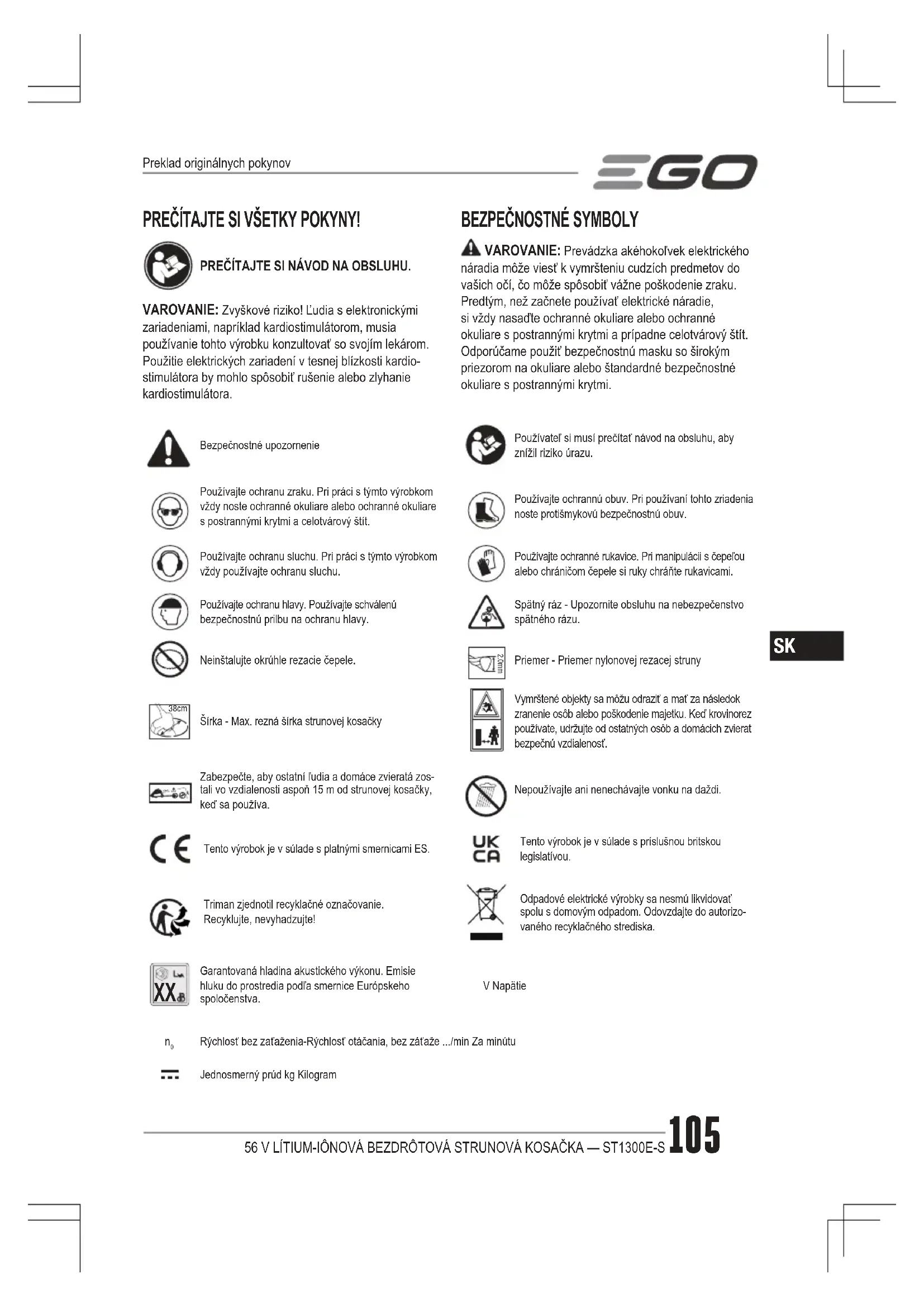 VAROVANIE: Aby nedošlo k vážnemu zraneniu, noste okuliare alebo ochranné okuliare po celú dobu používania prístroja. Používajte masku alebo masku proti prachu v prašnom prostredí. Pred každým použitím vyčistite oblasť, ktorá má byť rezaná. Odstráňte všetky predmety, ako sú kamene, rozbité sklo, klince, drôty alebo šnúry, ktoré môžu byť vymrštené alebo môžu uviaznuť v stroji. Zabráňte prístupu deťom, prítomným osobám a domácim zvieratám. Všetky deti, prizerajúce sa osoby a zvieratá sa musia zdržiavať vo vzdialenosti najmenej 15 metrov; stále ešte môže existovať riziko vymrštenia predmetov na prizerajúce sa osoby. Oko- lostojace osoby by mali mať ochranu očí. Ak sa približujú, okamžite zastavte motor a rezné príslušenstvo. Pred každým použitím skontrolujte, či nie sú poškodené / opotrebované diely Skontrolujte strunovú hlavu, chránič a prednú pomocnú rukoväť a diely, ktoré sú prasknuté, zdeformované, ohnuté, alebo inak poškodené. Strunová čepeľ na okraji chrániča sa v priebehu času otupí. Odporúčame, aby ste ju pravidelne prebrúsili pilníkom, alebo ju nahradili za novú čepeľ.56 V LÍTIUM-IÔNOVÁ BEZDRÔTOVÁ STRUNOVÁ KOSAČKA — ST1300E-S108