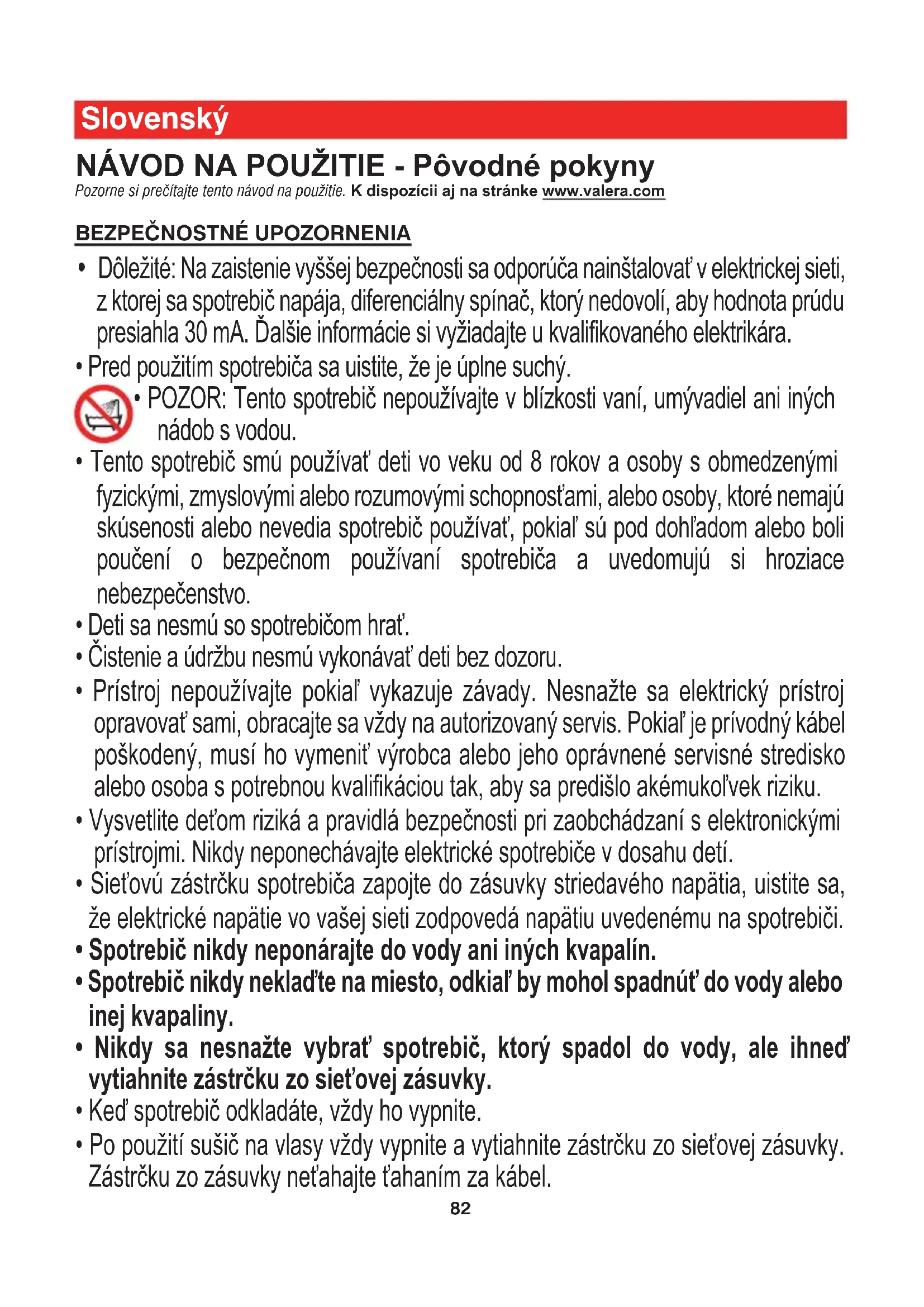 - POZOR: Tento spotrebič nepoužívajte v blízkosti vaní, umývadiel ani iných nádob s vodou.