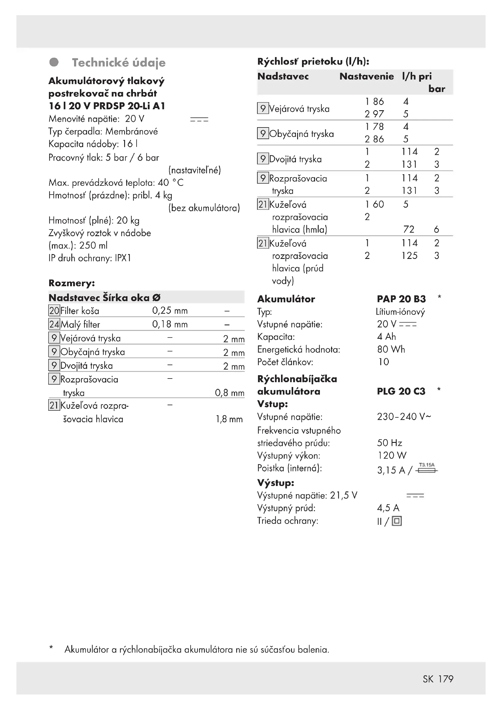 Technické údaje Akumulátorový tlakový postrekovač na chrbát 16l 20V PRDSP 20-Li A1 Menovité napätie: 20V Typ čerpadla: Membránové Kapacita nádoby: 16 l Pracovný tlak: 5 bar / 6 bar (nastaviteľné) Max. prevádzková teplota: 40 °C Hmotnosť (prázdne): pribl. 4 kg (bez akumulátora) Hmotnosť (plné): 20 kg Zvyškový roztok v nádobe (max.): 250 ml IP druh ochrany: IPX1 Rozmery: Nadstavec Šírka oka Ø [] Filter koša 0,25mm