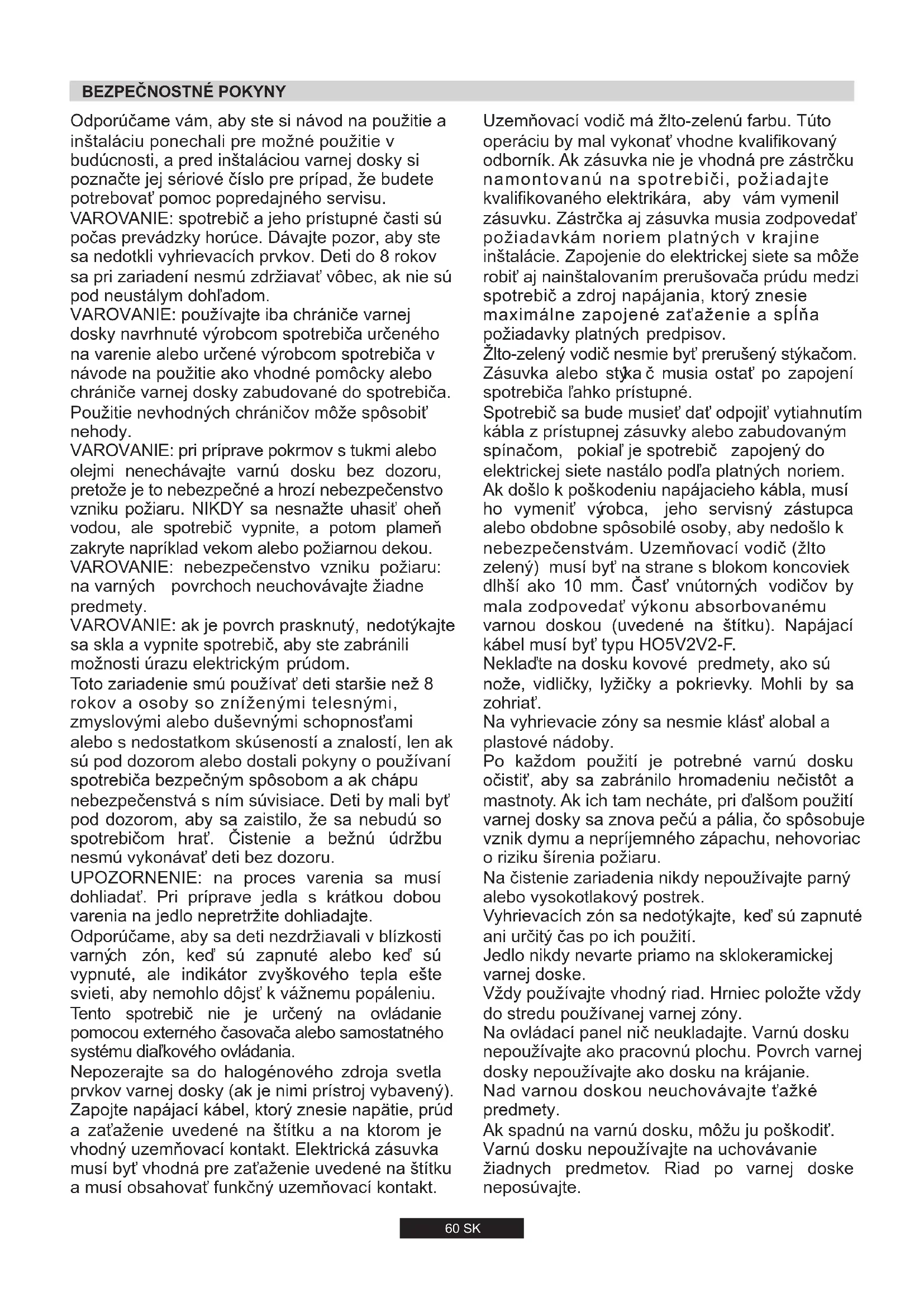 Odporúčame vám, aby ste si návod na použitie a inštaláciu ponechali pre možné použitie v budúcnosti, a pred inštaláciou varnej dosky si poznačte jej sériové číslo pre prípad, že budete potrebovať pomoc popredajného servisu. VAROVANIE: spotrebič a jeho prístupné časti sú počas prevádzky horúce. Dávajte pozor, aby ste sa nedotkli vyhrievacích prvkov. Deti do 8 rokov sa pri zariadení nesmú zdržiavať vôbec, ak nie sú pod neustálym dohľadom. VAROVANIE: používajte iba chrániče varnej dosky navrhnuté výrobcom spotrebiča určeného na varenie alebo určené výrobcom spotrebiča v návode na použitie ako vhodné pomôcky alebo chrániče varnej dosky zabudované do spotrebiča. Použitie nevhodných chráničov môže spôsobiť nehody. VAROVANIE: pri príprave pokrmov s tukmi alebo olejmi nenechávajte varnú dosku bez dozoru, pretože je to nebezpečné a hrozí nebezpečenstvo vzniku požiaru. NIKDY sa nesnažte uhasiť oheň vodou, ale spotrebič vypnite, a potom plameň zakryte napríklad vekom alebo požiarnou dekou. VAROVANIE: nebezpečenstvo vzniku požiaru: na varných povrchoch neuchovávajte žiadne predmety. VAROVANIE: ak je povrch prasknutý, nedotýkajte sa skla a vypnite spotrebič, aby ste zabránili možnosti úrazu elektrickým prúdom. Zapojte napájací kábel, ktorý znesie napätie, prúd a zaťaženie uvedené na štítku a na ktorom je vhodný uzemňovací kontakt. Elektrická zásuvka musí byť vhodná pre zaťaženie uvedené na štítku a musí obsahovať funkčný uzemňovací kontakt. Nepozerajte sa do halogénového zdroja svetla prvkov varnej dosky (ak je nimi prístroj vybavený). Odporúčame, aby sa deti nezdržiavali v blízkosti varných zón, keď sú zapnuté alebo keď sú vypnuté, ale indikátor zvyškového tepla ešte svieti, aby nemohlo dôjsť k vážnemu popáleniu. Toto zariadenie smú používať deti staršie než 8 rokov a osoby so zníženými telesnými, zmyslovými alebo duševnými schopnosťami alebo s nedostatkom skúseností a znalostí, len ak sú pod dozorom alebo dostali pokyny o používaní spotrebiča bezpečným spôsobom a ak chápu nebezpečenstvá s ním súvisiace. Deti by mali byť pod dozorom, aby sa zaistilo, že sa nebudú so spotrebičom hrať. Čistenie a bežnú údržbu nesmú vykonávať deti bez dozoru. UPOZORNENIE: na proces varenia sa musí dohliadať. Pri príprave jedla s krátkou dobou varenia na jedlo nepretržite dohliadajte. Tento spotrebič nie je určený na ovládanie pomocou externého časovača alebo samostatného systému diaľkového ovládania. Po každom použití je potrebné varnú dosku očistiť, aby sa zabránilo hromadeniu nečistôt a mastnoty. Ak ich tam necháte, pri ďalšom použití varnej dosky sa znova pečú a pália, čo spôsobuje vznik dymu a nepríjemného zápachu, nehovoriac o riziku šírenia požiaru. Vždy používajte vhodný riad. Hrniec položte vždy do stredu používanej varnej zóny. Spotrebič sa bude musieť dať odpojiť vytiahnutím kábla z prístupnej zásuvky alebo zabudovaným spínačom, pokiaľ je spotrebič zapojený do elektrickej siete nastálo podľa platných noriem. Uzemňovací vodič má žlto-zelenú farbu. Túto operáciu by mal vykonať vhodne kvalifikovaný odborník. Ak zásuvka nie je vhodná pre zástrčku namontovanú na spotrebiči, požiadajte kvalifikovaného elektrikára, aby vám vymenil zásuvku. Zástrčka aj zásuvka musia zodpovedať požiadavkám noriem platných v krajine inštalácie. Zapojenie do elektrickej siete sa môže robiť aj nainštalovaním prerušovača prúdu medzi spotrebič a zdroj napájania, ktorý znesie maximálne zapojené zaťaženie a spĺňa požiadavky platných predpisov. Na ovládací panel nič neukladajte. Varnú dosku nepoužívajte ako pracovnú plochu. Povrch varnej dosky nepoužívajte ako dosku na krájanie. Žlto-zelený vodič nesmie byť prerušený stýkačom. Na čistenie zariadenia nikdy nepoužívajte parný alebo vysokotlakový postrek. Vyhrievacích zón sa nedotýkajte, keď sú zapnuté ani určitý čas po ich použití. Ak došlo k poškodeniu napájacieho kábla, musí ho vymeniť výrobca, jeho servisný zástupca alebo obdobne spôsobilé osoby, aby nedošlo k Zásuvka alebo stýka č musia ostať po zapojení spotrebiča ľahko prístupné. Nad varnou doskou neuchovávajte ťažké predmety. Na vyhrievacie zóny sa nesmie klásť alobal a plastové nádoby. Ak spadnú na varnú dosku, môžu ju poškodiť. Varnú dosku nepoužívajte na uchovávanie žiadnych predmetov. Riad po varnej doske neposúvajte. nebezpečenstvám. Uzemňovací vodič (žlto zelený) musí byť na strane s blokom koncoviek dlhší ako 10 mm. Časť vnútorných vodičov by mala zodpovedať výkonu absorbovanému varnou doskou (uvedené na štítku). Napájací kábel musí byť typu HO5V2V2-F. Neklaďte na dosku kovové predmety, ako sú nože, vidličky, lyžičky a pokrievky. Mohli by sa zohriať. Jedlo nikdy nevarte priamo na sklokeramickej varnej doske.61 SK Ak je varná doska upevnená na niektorej strane vedľa kuchynskej skrinky, vzdialenosť medzi varnou doskou a skrinkou musí byť aspoň 15 cm (pozri obrázok 4); zatiaľ čo vzdialenosť medzi varnou doskou a zadnou stenou musí byť aspoň 70 mm. Vzdialenosť medzi varnou doskou a inou jednotkou alebo spotrebičom, ktorý je umiestnený nad varnou doskou (napr. odsávač pár), musí byť aspoň 70 cm (obrázok 4). Ak je varná doska 60 cm namontovaná nad rúrou, ktorá nie je vybavená ventilátorovým chladiacim systémom, odporúča sa, aby sa otvory vytvorili v zabudovaný v nábytku na zabezpečenie správnej cirkulácie vzduchu. Kovové objekty nachádzajúce sa v zásuvke môžu v dôsledku opätovnej cirkulácie vzduchu dosahovať vysoké teploty. Preto sa odporúča použiť drevenú vložku. Dôležité – Ilustrácia na obrázku 1 zobrazuje spôsob aplikácie tesniaceho prípravku. Varná