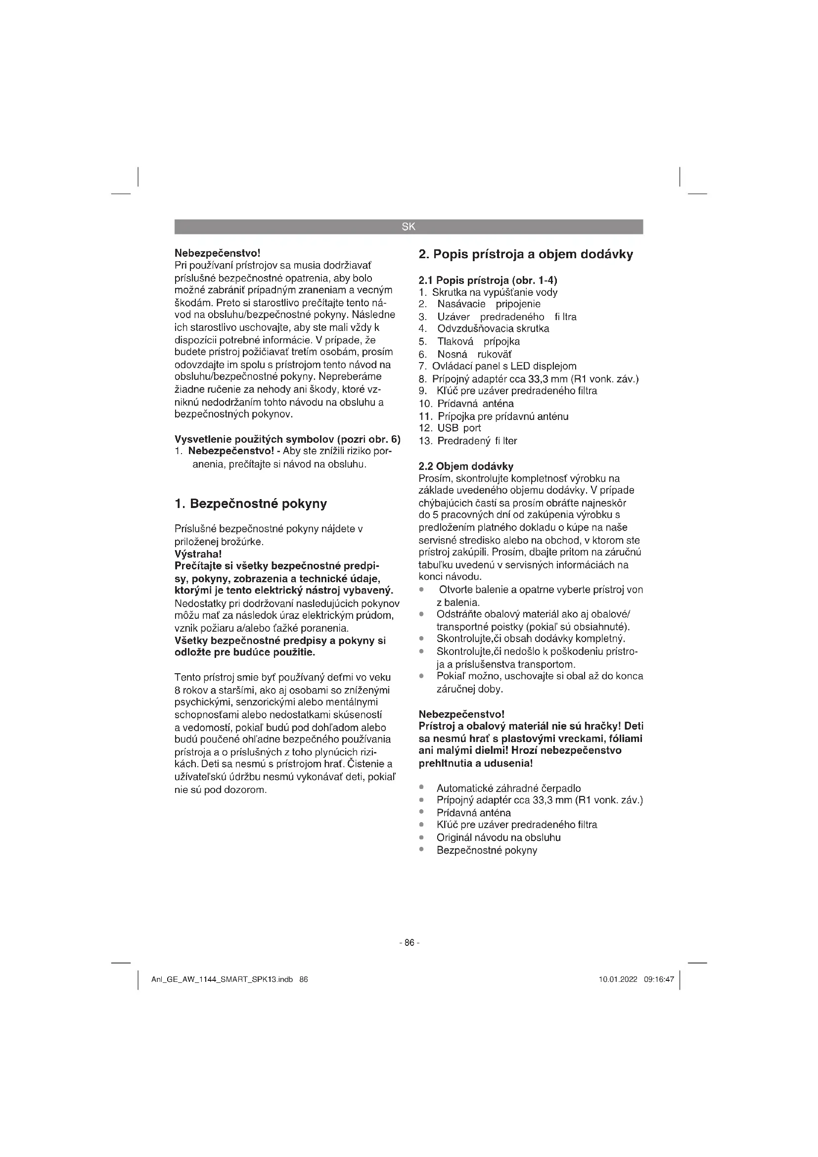 vedenia Nebezpečenstvo! V prípade poškodenia sieťového prípojného vedenia prístroja sa musí vedenie vymeniť výrob- com alebo jeho zákazníckym zastúpením alebo podobne kvalifi kovanou osobou, aby sa zabránilo rizikám. Anl_GE_AW_1144_SMART_SPK13.indb 90Anl_GE_AW_1144_SMART_SPK13.indb 90 10.01.2022 09:16:4810.01.2022 09:16:48SK