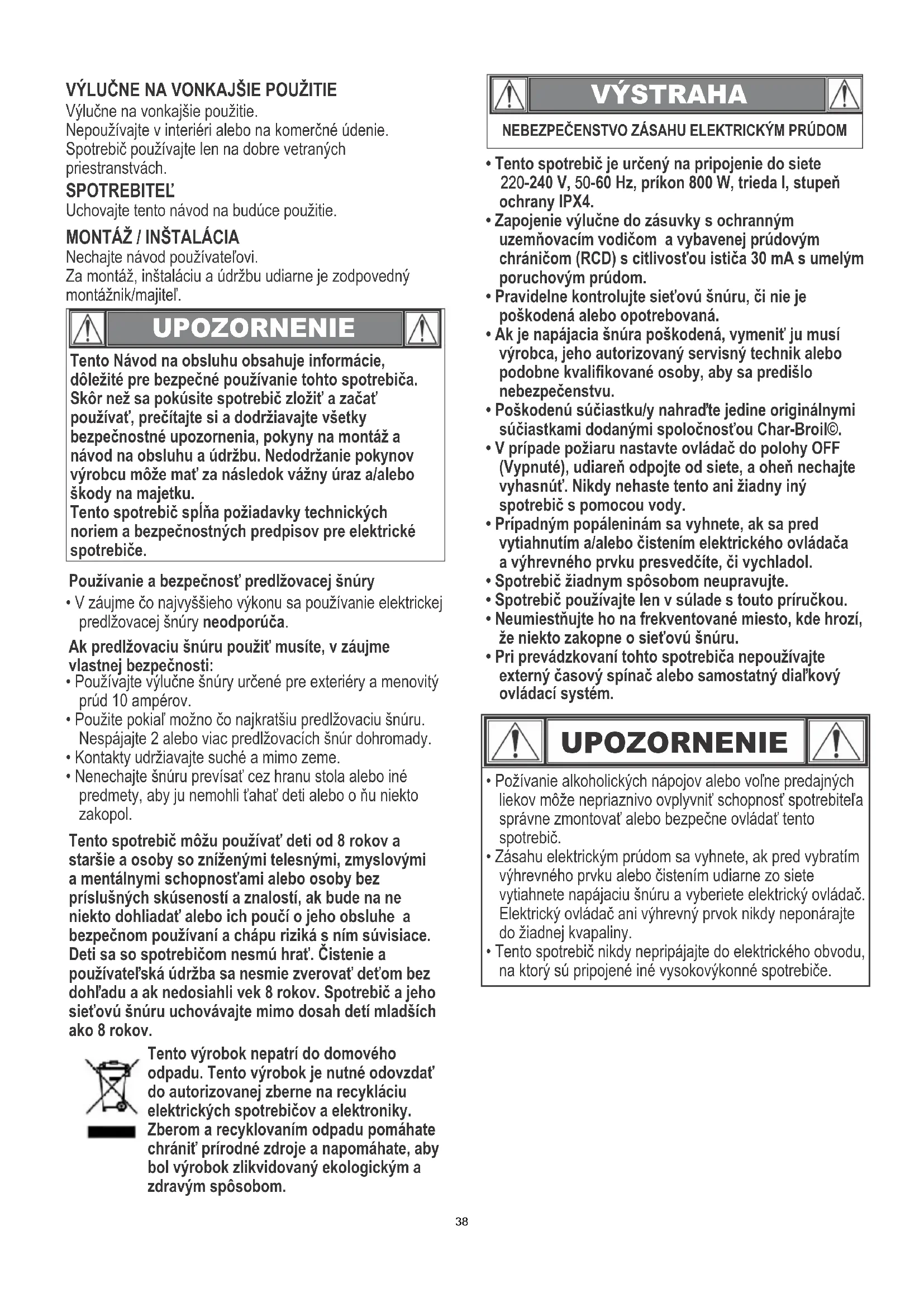 - Pri prevádzkovaní tohto spotrebiča nepoužívajte externý časový spínač alebo samostatný diaľkový ovládací systém. UPOZORNENIE VÝLUČNE NA VONKAJŠIE POUŽITIE