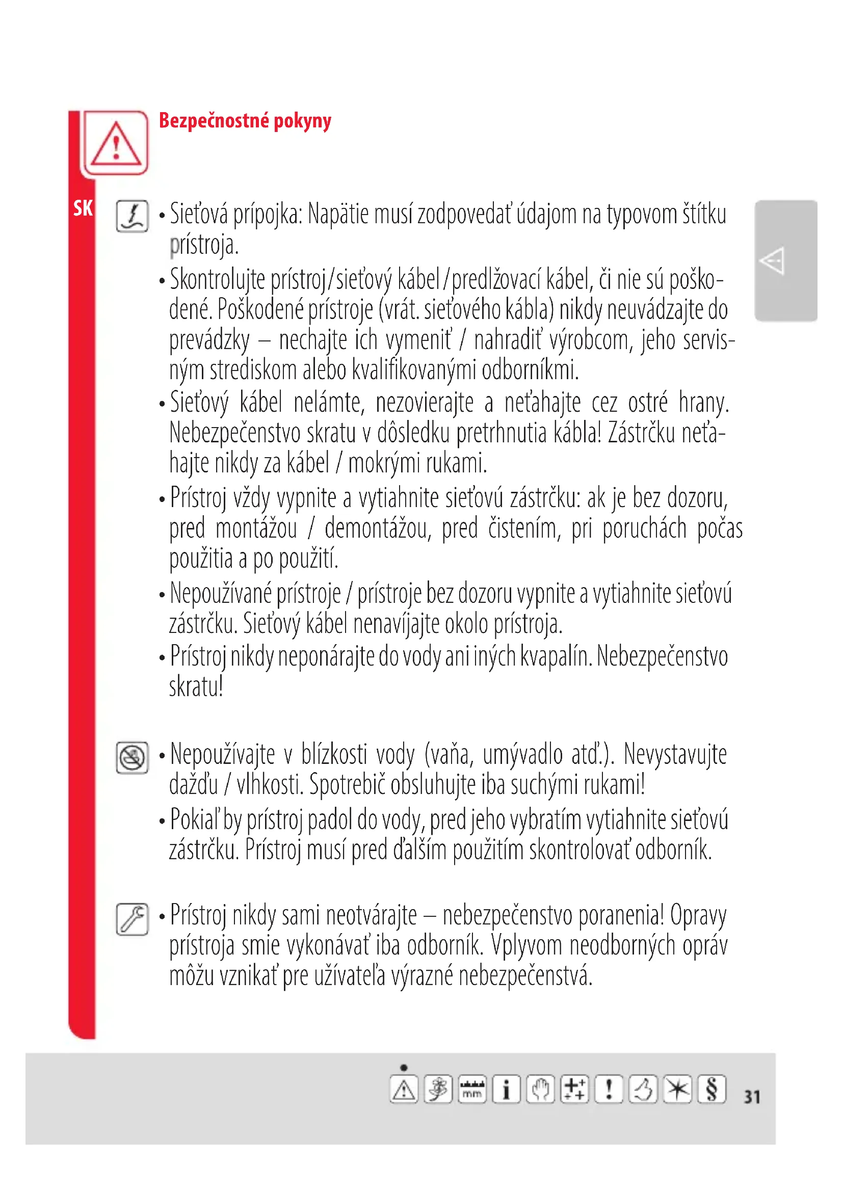 - Prístroj nikdy sami neotvárajte – nebezpečenstvo poranenia! Opravy prístroja smie vykonávať iba odborník. Vplyvom neodborných opráv môžu vznikať pre užívateľa výrazné nebezpečenstvá.32 Bezpečnostné pokyny
