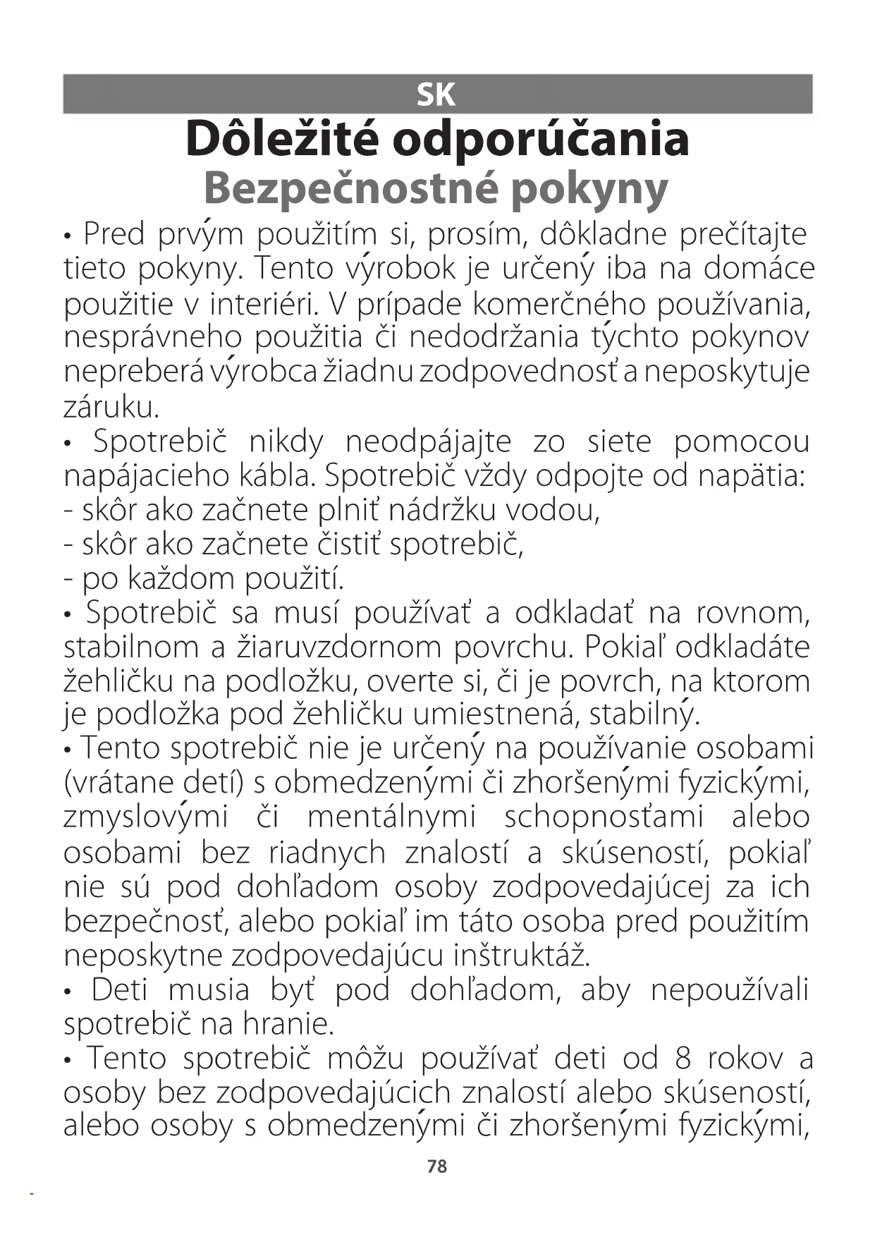 - Tento spotrebič nie je určeny na používanie osobami (vrátane detí) s obmedzenymi či zhoršenymi fyzickymi, zmyslovymi či mentálnymi schopnosťami alebo osobami bez riadnych znalostí a skúseností, pokiaľ nie sú pod dohľadom osoby zodpovedajúcej za ich bezpečnosť, alebo pokiaľ im táto osoba pred použitím neposkytne zodpovedajúcu inštruktáž.