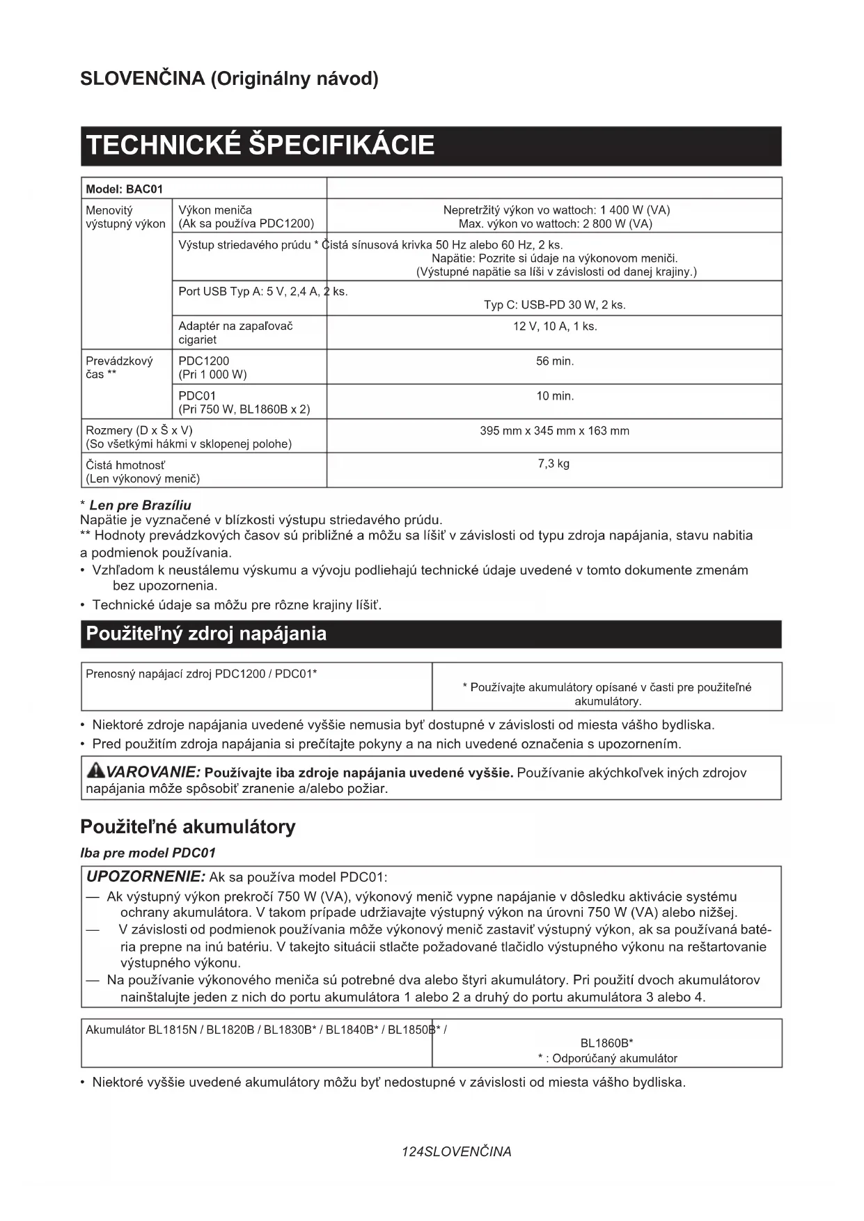 - Pred použitím zdroja napájania si prečítajte pokyny a na nich uvedené označenia s upozornením. VAROVANIE: Používajte iba zdroje napájania uvedené vyššie. Používanie akýchkoľvek iných zdrojov napájania môže spôsobiť zranenie a/alebo požiar. Použiteľné akumulátory Iba pre model PDC01 UPOZORNENIE: Ak sa používa model PDC01: — Ak výstupný výkon prekročí 750 W (VA), výkonový menič vypne napájanie v dôsledku aktivácie systému ochrany akumulátora. V takom prípade udržiavajte výstupný výkon na úrovni 750 W (VA) alebo nižšej. — V závislosti od podmienok používania môže výkonový menič zastaviť výstupný výkon, ak sa používaná baté- ria prepne na inú batériu. V takejto situácii stlačte požadované tlačidlo výstupného výkonu na reštartovanie výstupného výkonu. — Na používanie výkonového meniča sú potrebné dva alebo štyri akumulátory. Pri použití dvoch akumulátorov nainštalujte jeden z nich do portu akumulátora 1 alebo 2 a druhý do portu akumulátora 3 alebo 4. Akumulátor BL1815N / BL1820B / BL1830B* / BL1840B* / BL1850B* / BL1860B*